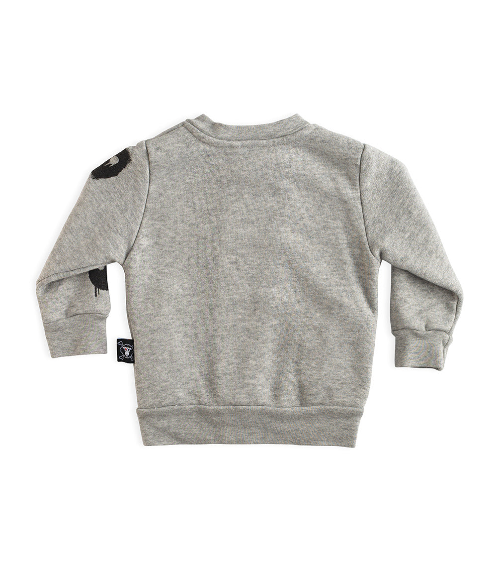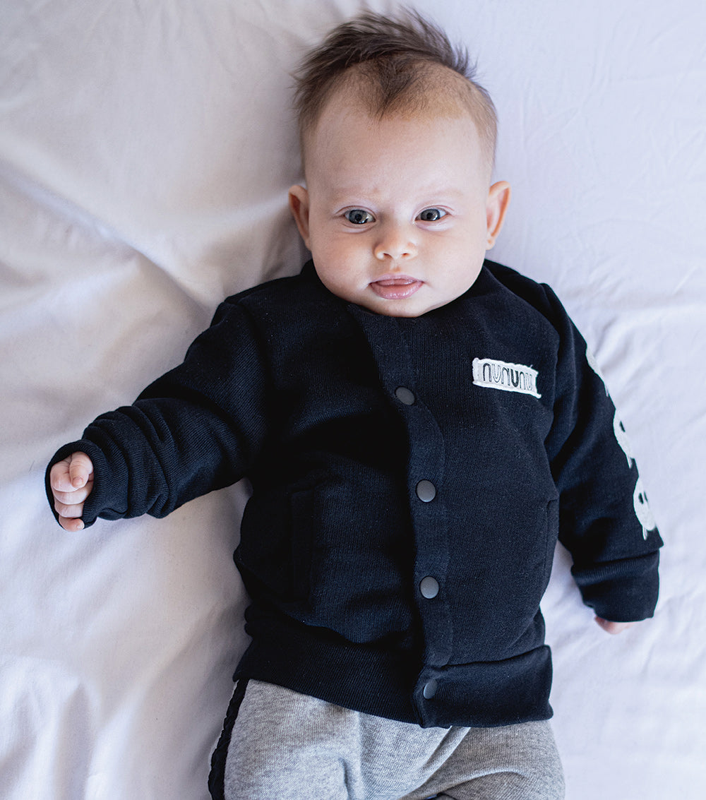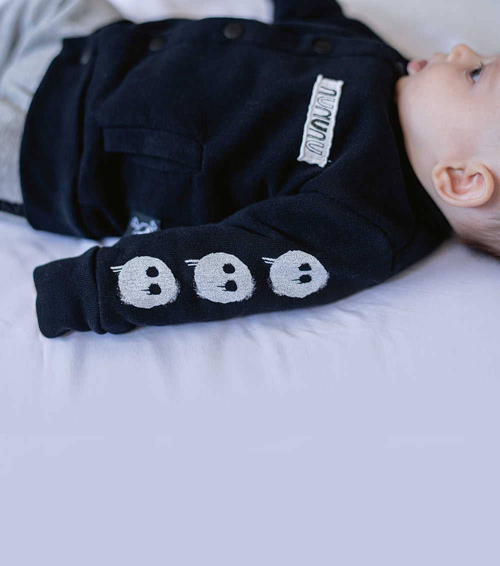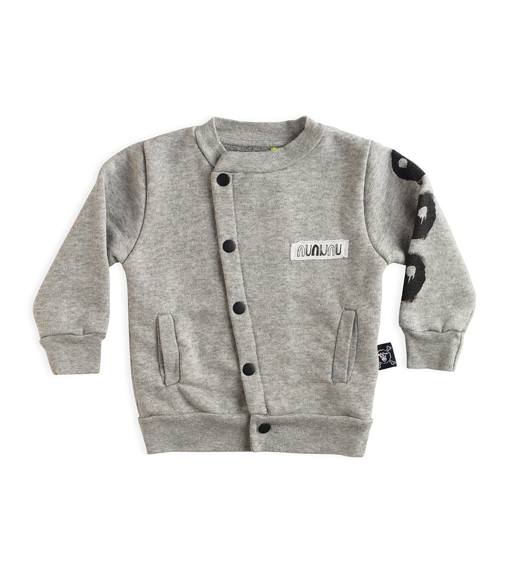 a heather grey cardigan is always a good mini-adult look for a baby, but ours isn’t too buttoned up. it’s soft & cozy french terry, like a sweatshirt, and it’s got this dope asymmetrical snap closure, for easy removal when things heat up. our logo is stenciled on a white cotton patch at the chest and the melting masks on the sleeve are our highly rebellious take on the smiley face. Winter must if you ask us, huh?