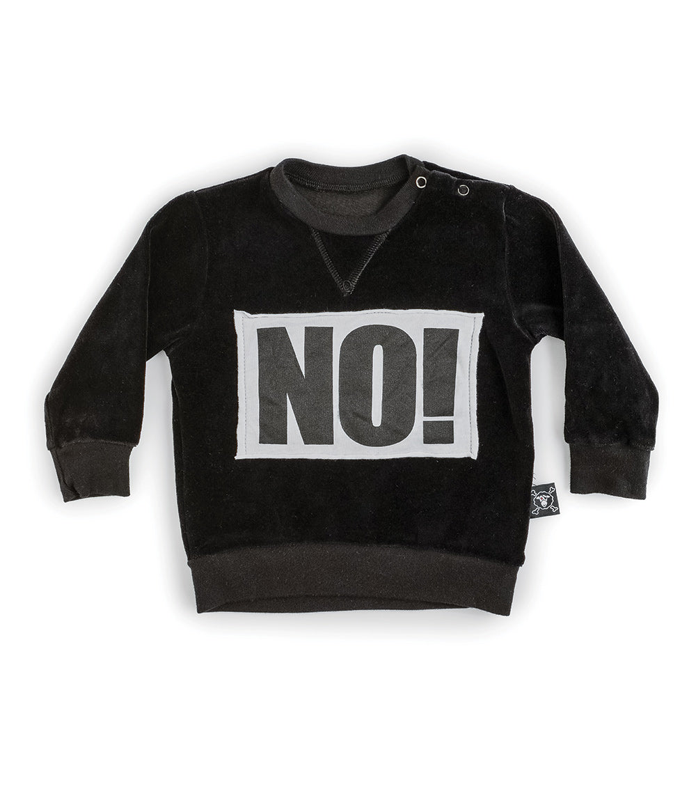 just because all they do is gurgle & yawn & eat & poop, doesn’t mean babies can’t be fancy. this black velvet sweatshirt lets them get their swag on in the comfiest way. it’s nice & soft, with shoulder snaps for easy dressing. style it with a onesie or matching nununu velvet pants, like paris hilton circa 2001. it’s finished with that word every kid falls in love with sooner or later—a white cotton patch screams “no!” nice & big.