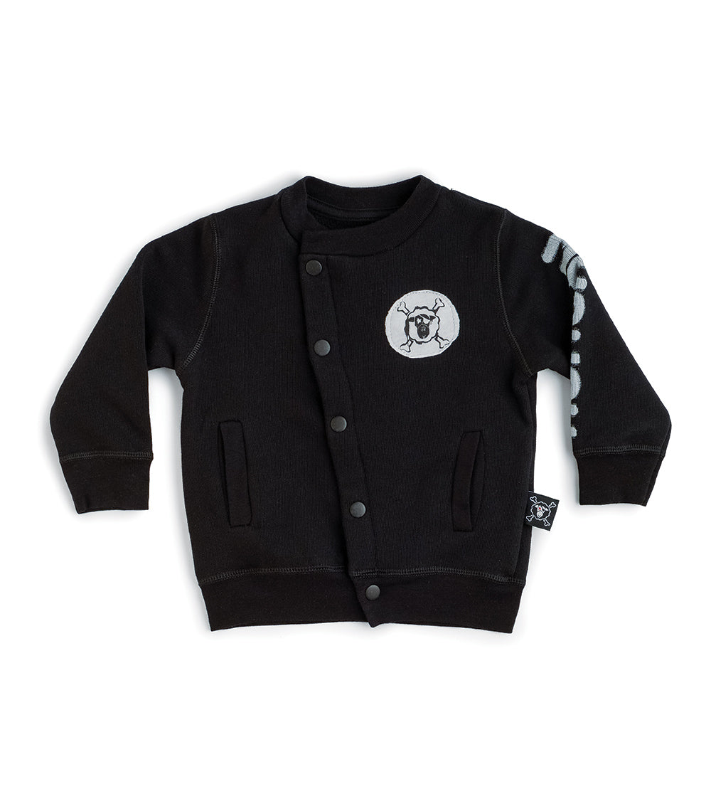 a black cardigan is a good mini-adult look for a baby, but ours isn’t too buttoned up. it’s soft & cozy french terry, like a sweatshirt, and it’s got this dope asymmetrical snap closure, for easy removal when things heat up. our logo is spray-stenciled on the sleeve, and this fashionable look is finished with our tiny blacksheep patch at the chest—an omen of what’s to come?