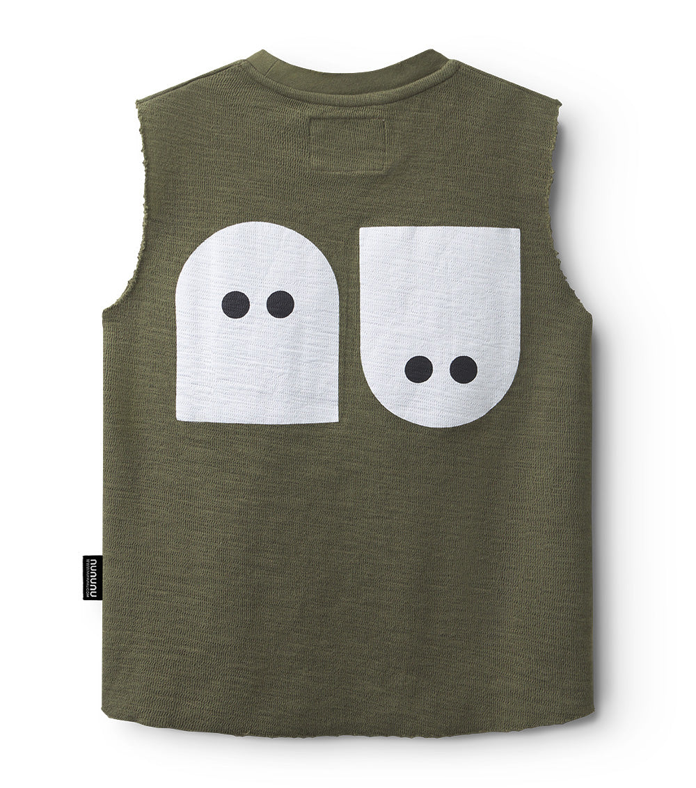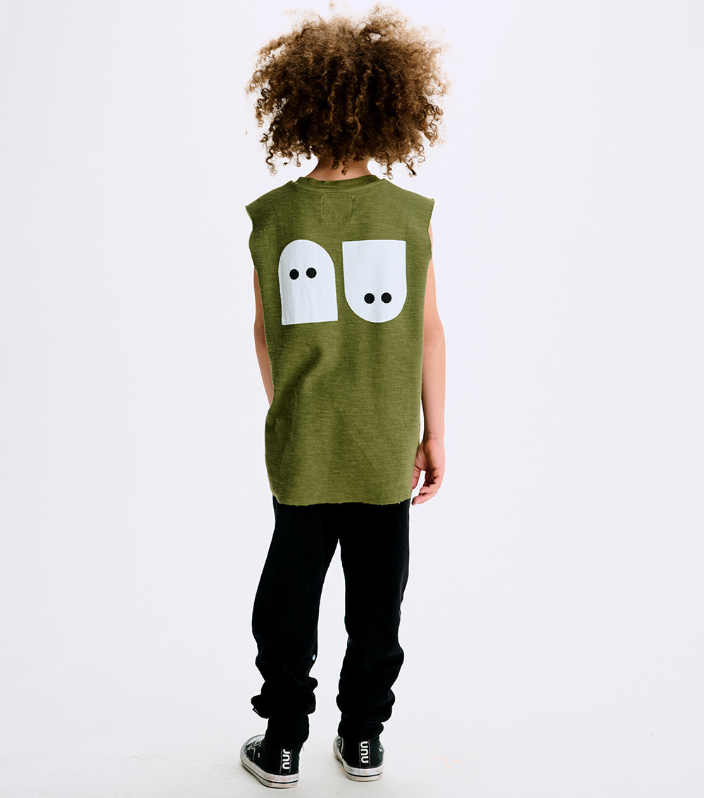 get ready for a style that’s bone chillingly chill. this gender neutral shirt is made of olive slub that your kid will literally want to live all their days in. and from the looks of it, someone actually did. it’s got totally raw hems on the bottom & where the sleeves would go. kinda like they were ripped right off. and of course, we’ve got two little spookies dancing on the chest. oh yeah, and two big ones are haunting the back. just to make sure the monsters