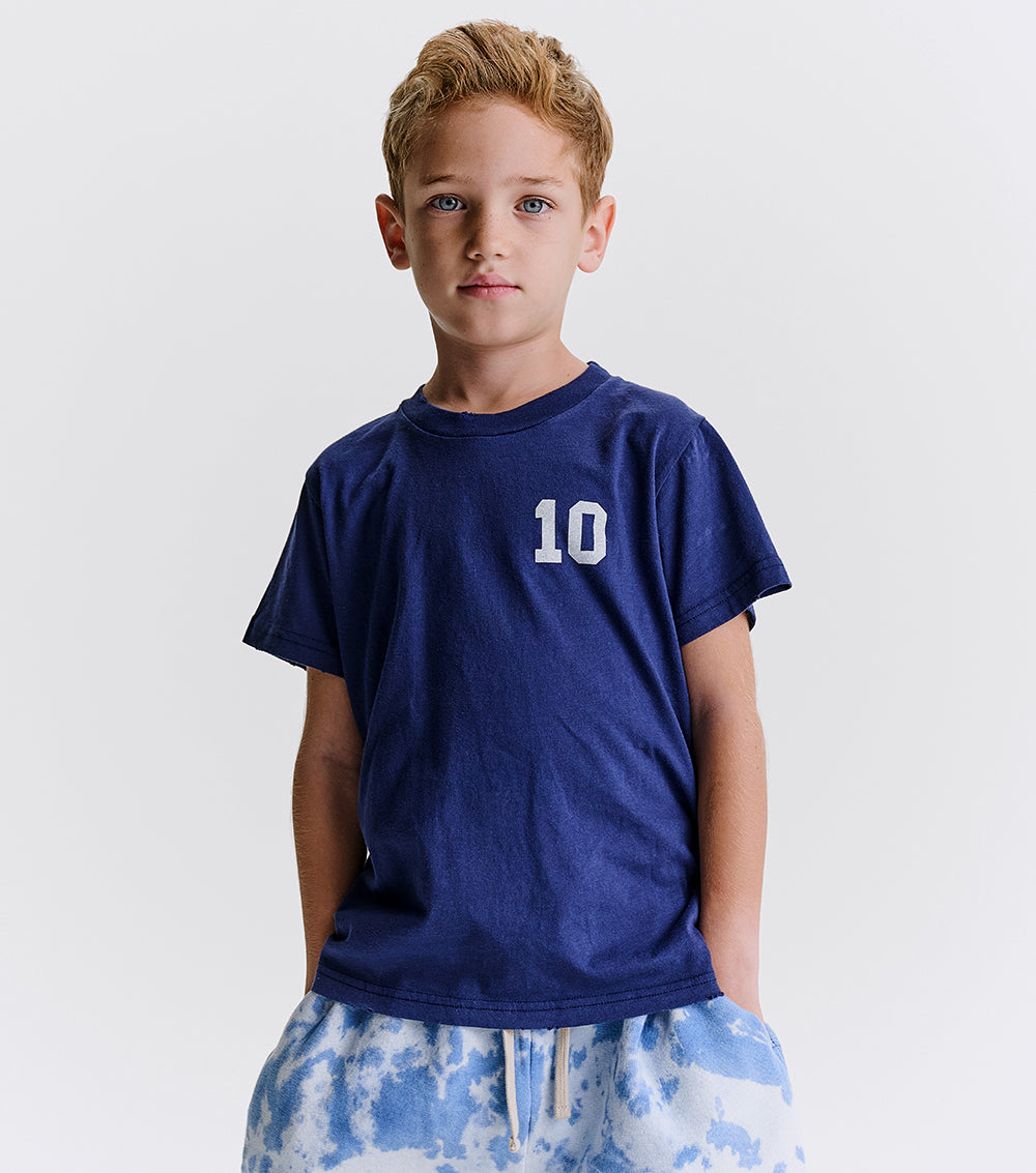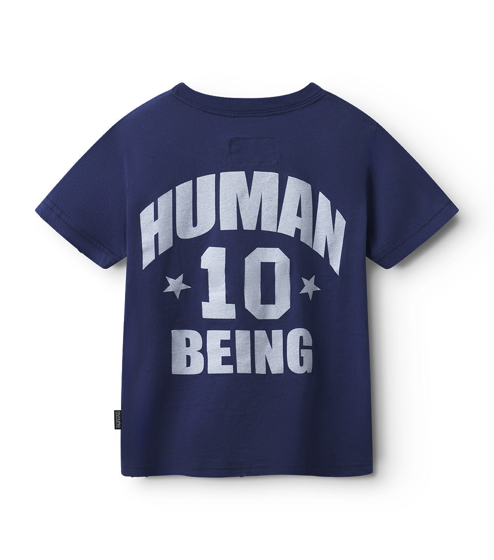 welcome to team nununu, your kid is number 10. that’s why we’ve got this rad number featured twice: small on the front & big on the back of this gender neutral tee in bold white print that contrasts with the indigo single cotton. of course, it also says human being on the back along with two little stars because that’s our mascot. and with a personality like your kid’s, being human is cooler than ever.