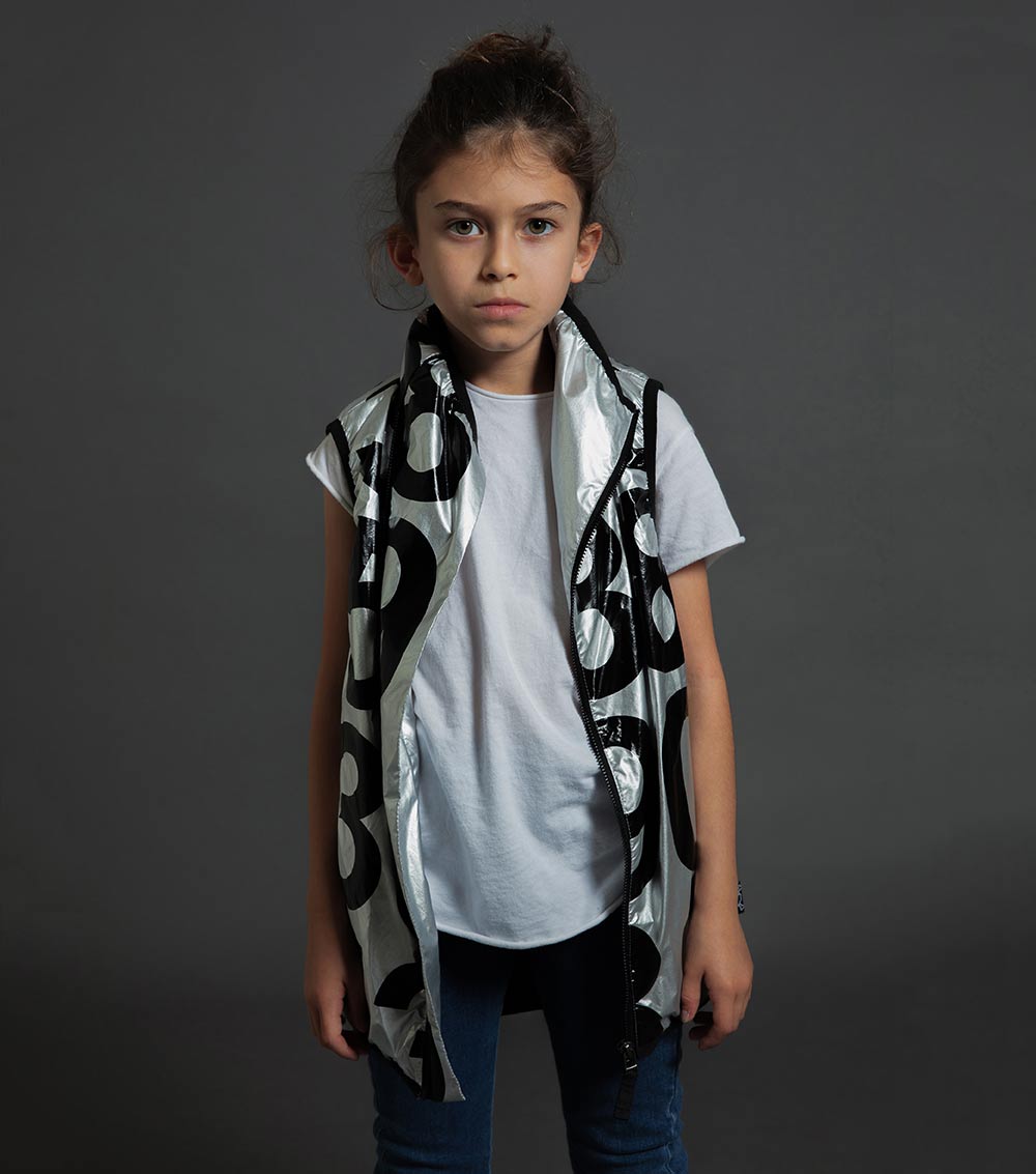 give me all the numbers & no one will get hurt. the numeric print on this silver nylon vest is smart & tough at the same time, a good look for boys & girls alike. shiny & modern, it’s got that signature nununu asymmetrical zip going for it, not to mention a high neck & no sleeves. such a great statement piece to shut it down all season.