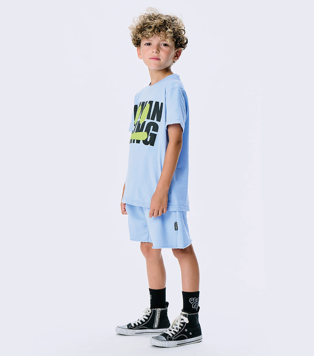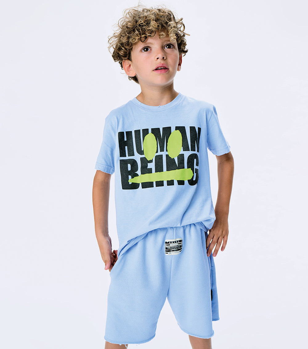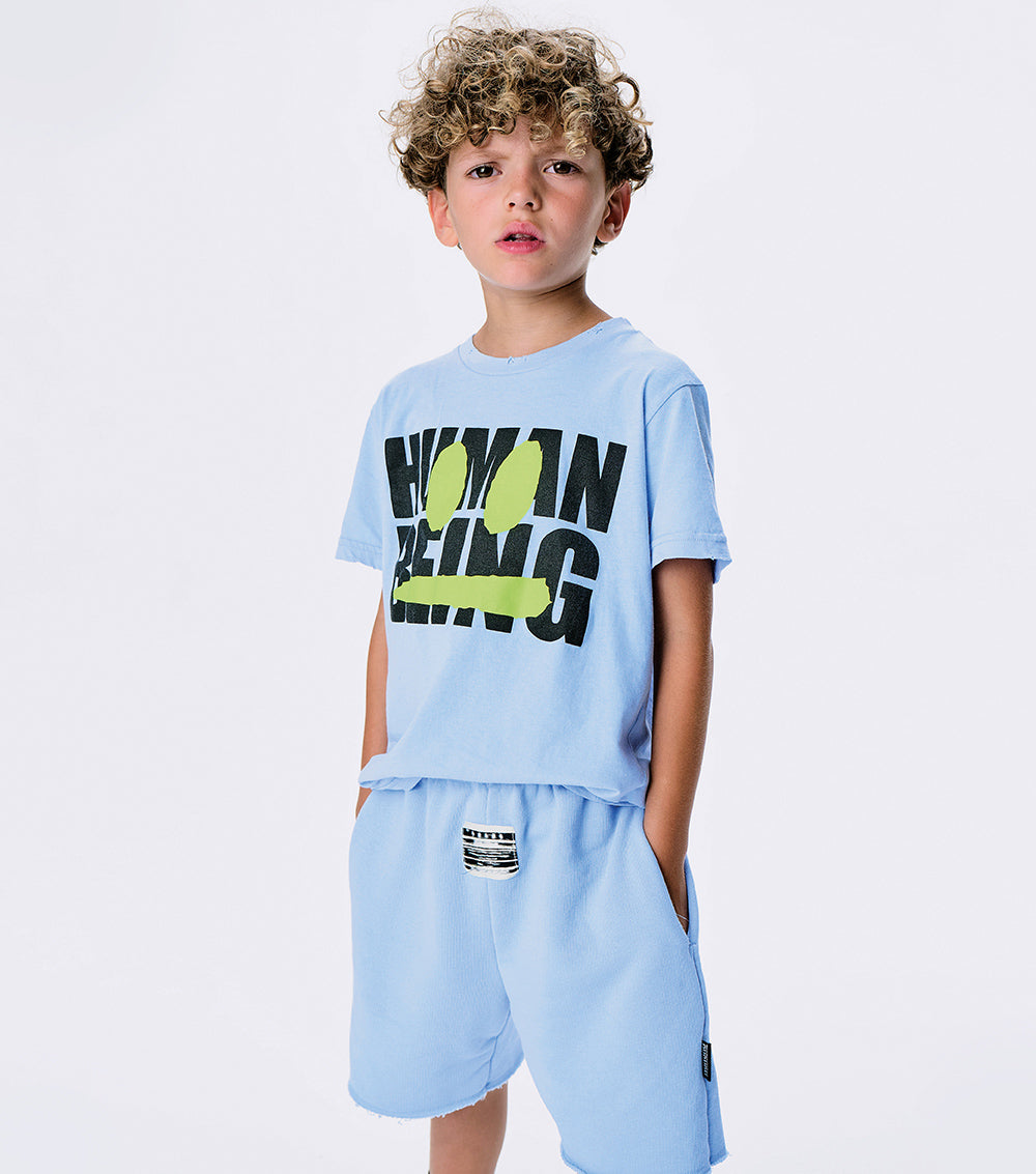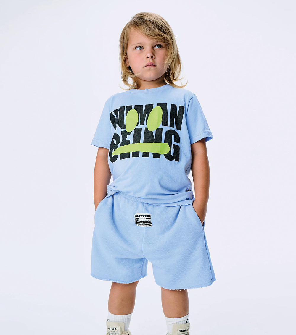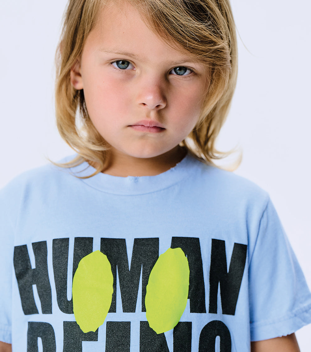 it’s time to get your smirk on with this super breezy & comfy foggy blue t-shirt for boys & girls. made from a light single cotton in a classic nununu cut, it’s got human being plastered on the front in big bold letters. all caps of course, because your kid doesn’t do anything the quiet way. plus, it’s got a neon yellow smirk to match your kid’s mischievous attitude and super cool custom deconstruction for that edgy vibe.