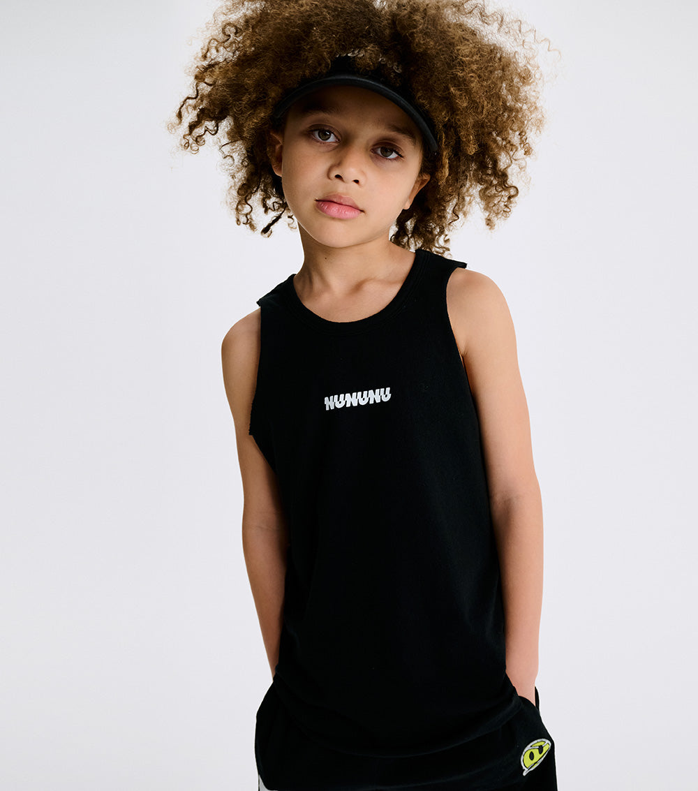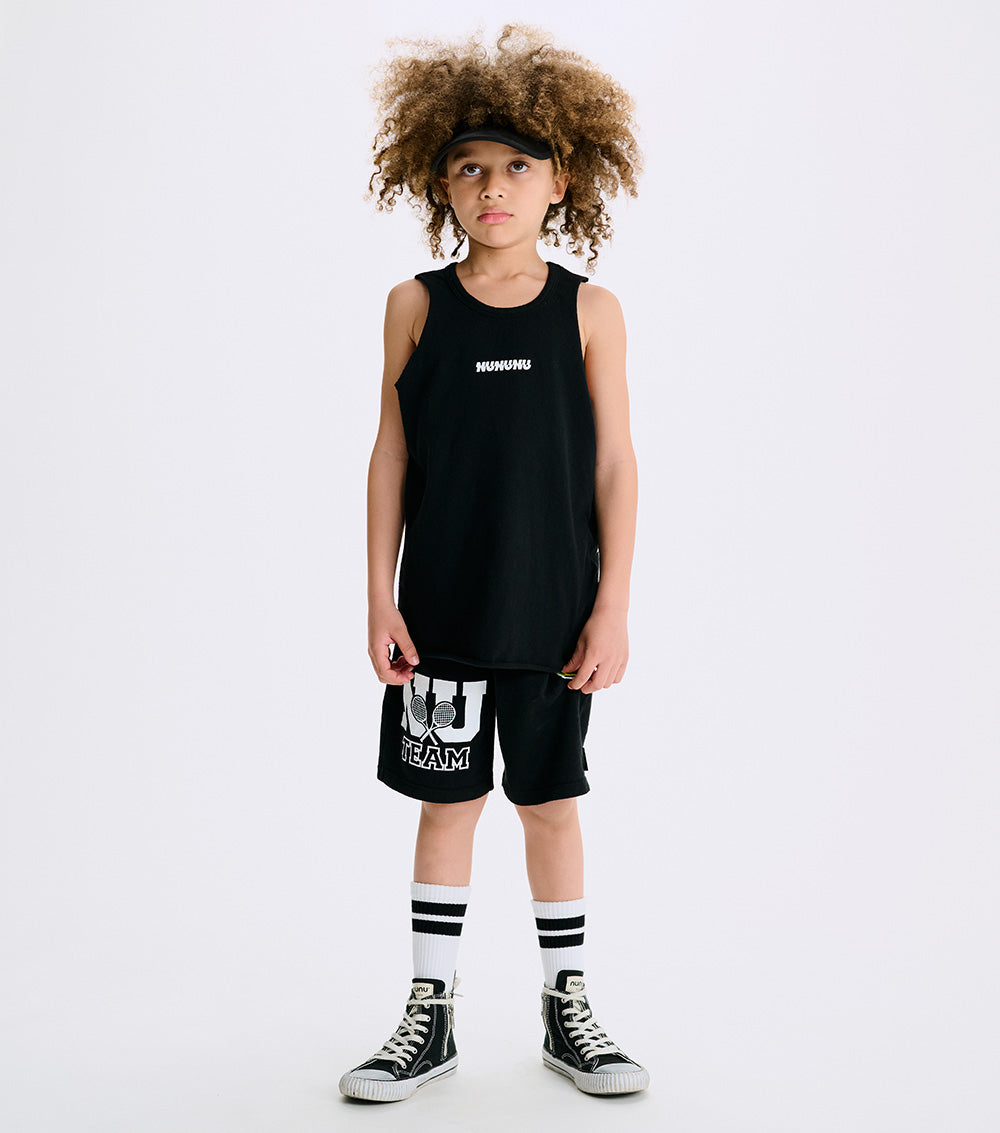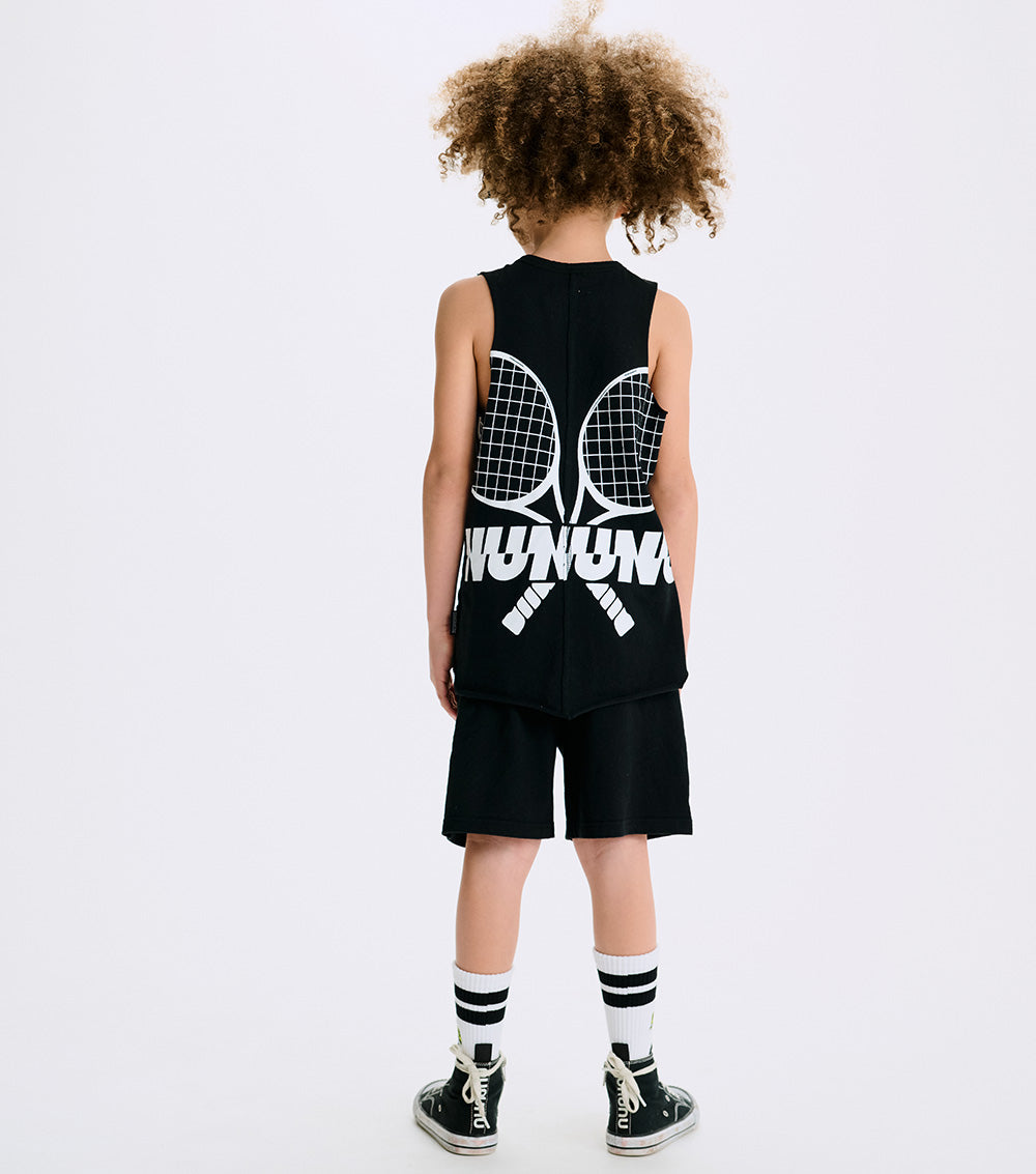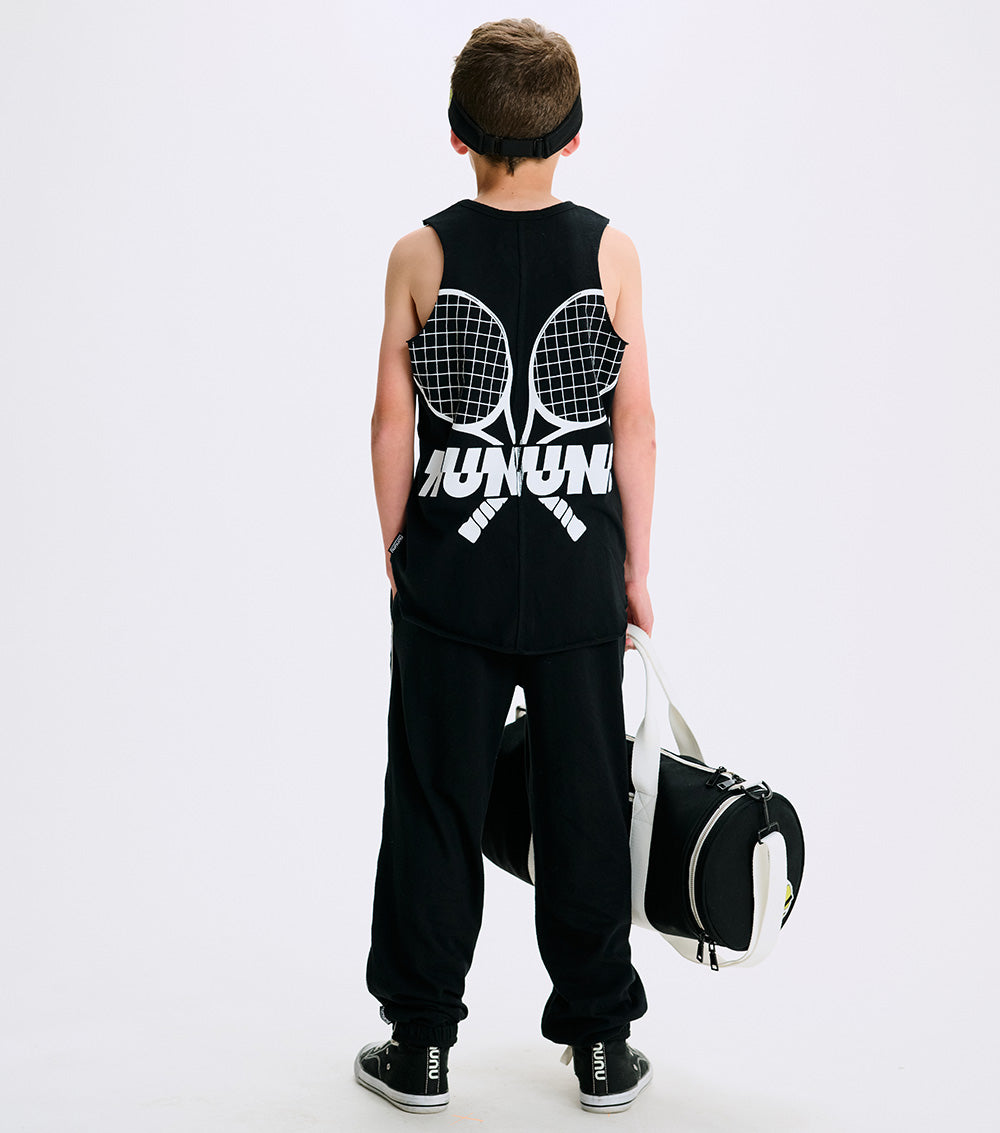 when the sun & the serves are both coming in hot, you’ll be glad you’ve got this breezy black tennis tank. it's an athletic cut made out of soft heavy single cotton that moves & breathes with you. we kept it business in the front with the sliced nununu logo & a clean collar but in the back it's a total party. the sleeves are cut wide & round almost like a racerback, taking a chunk out of our super cool dueling tennis racket print on the back, split by a center seam. hemlines on the bottom & sleeves are raw & rolling kind of like the ball away from your opponents after every ace.