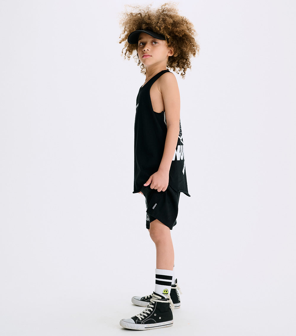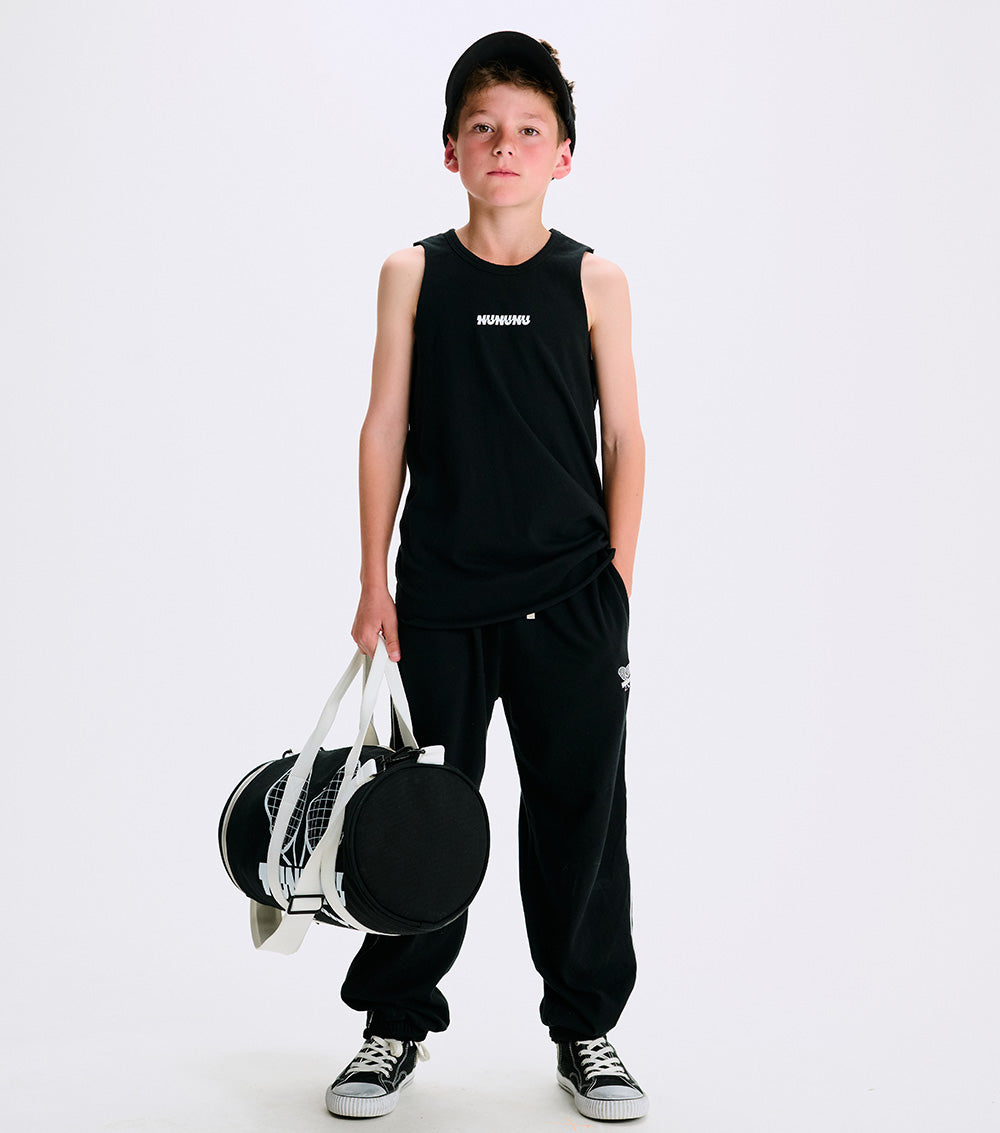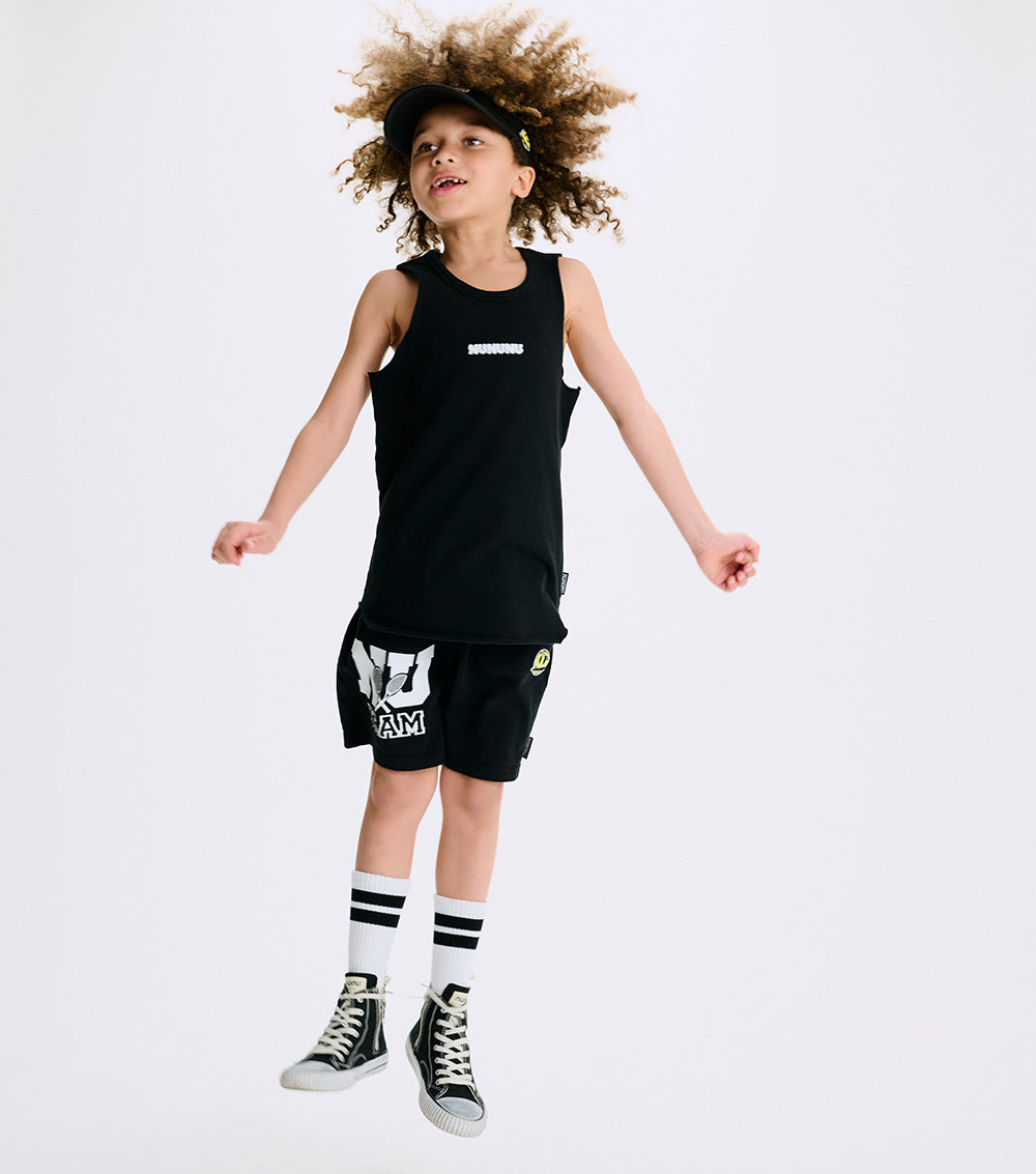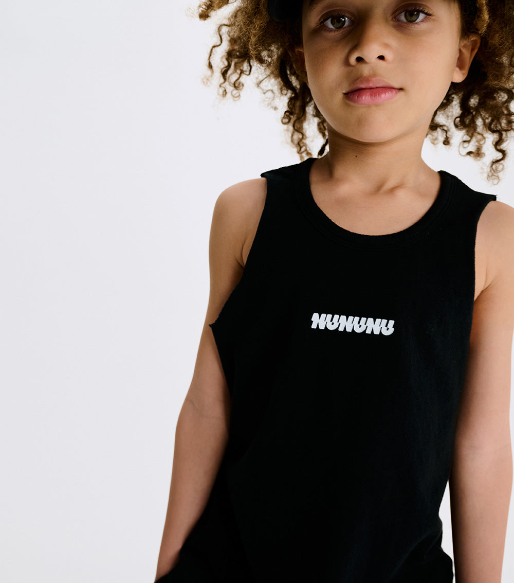 when the sun & the serves are both coming in hot, you’ll be glad you’ve got this breezy black tennis tank. it's an athletic cut made out of soft heavy single cotton that moves & breathes with you. we kept it business in the front with the sliced nununu logo & a clean collar but in the back it's a total party. the sleeves are cut wide & round almost like a racerback, taking a chunk out of our super cool dueling tennis racket print on the back, split by a center seam. hemlines on the bottom & sleeves are raw & rolling kind of like the ball away from your opponents after every ace.