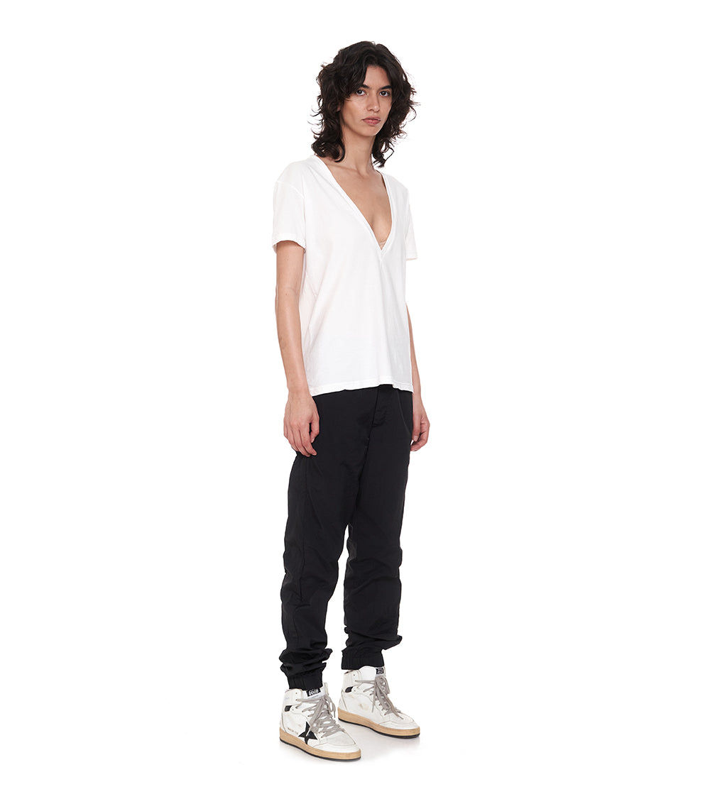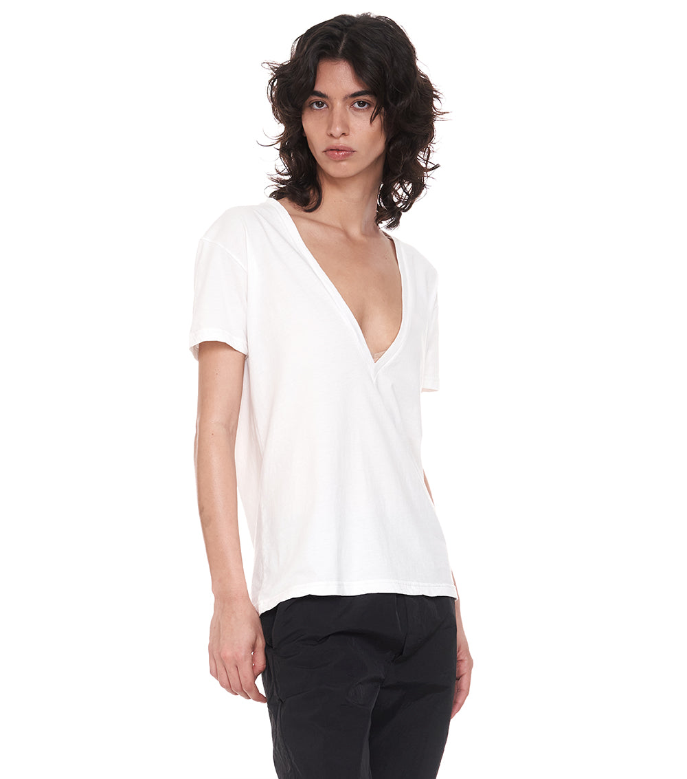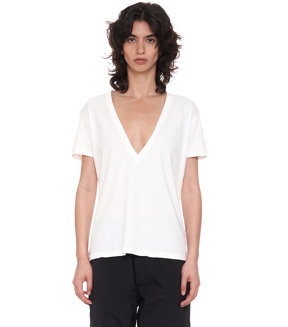 this may just be the perfect black v shirt you never knew you needed. and trust us, you do not know this yet, but all the nununu ladies in the studio have already been hooked. perfectly lightweight, mind-blowing deep v-neckline and the best relaxed fit make this one your summer got to piece – throw it on with jeans or match to a flow skirt, this one comes in white and black, because that's all you need.