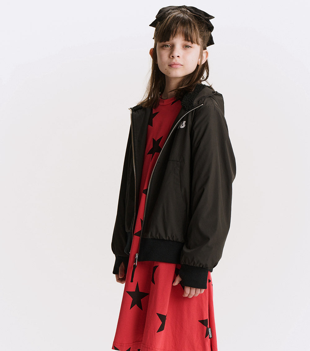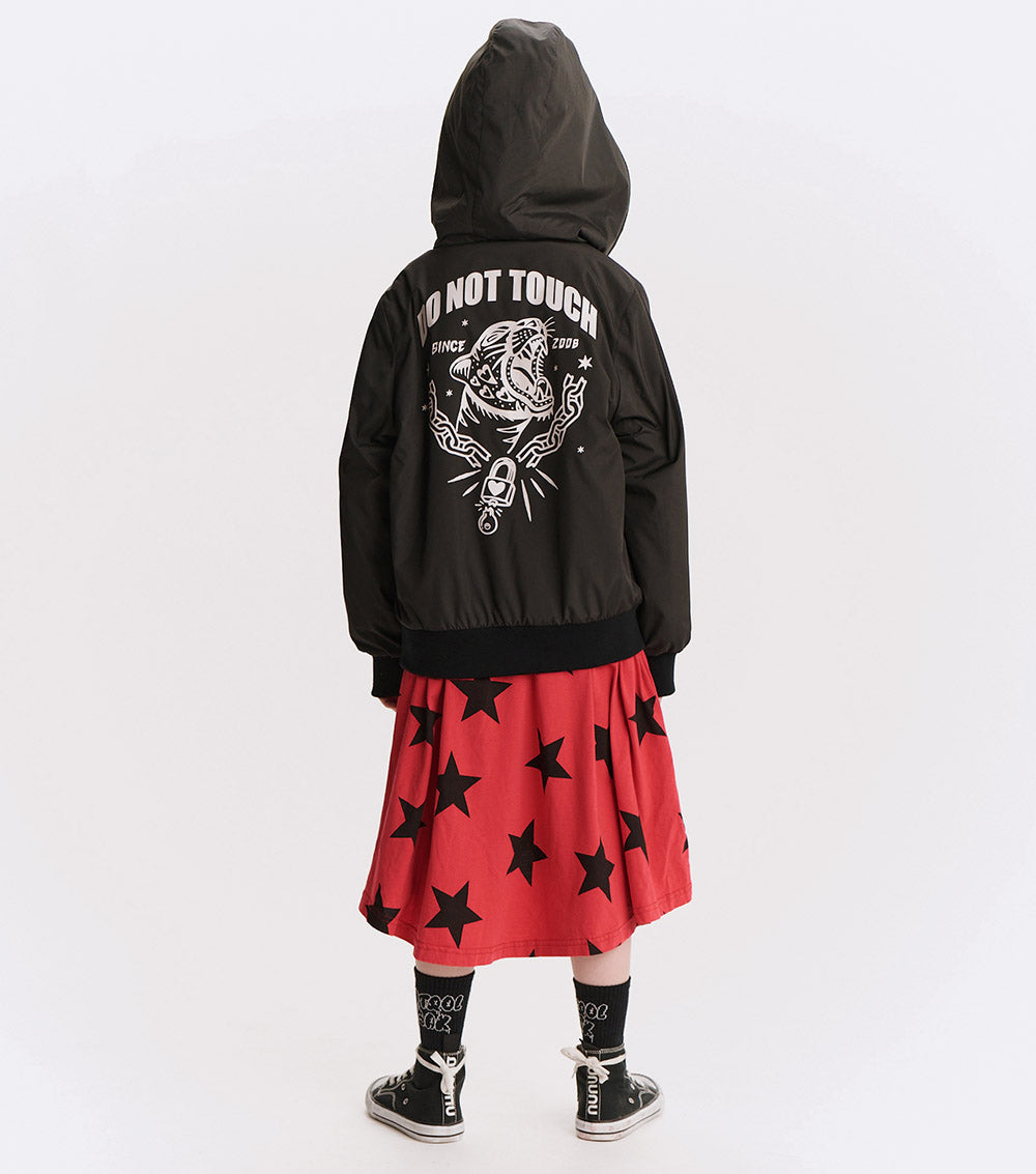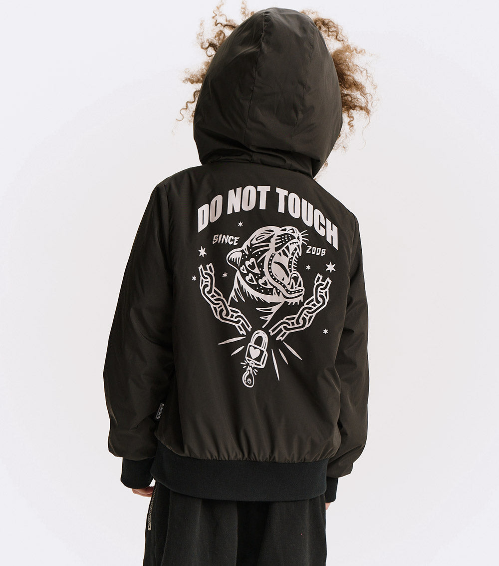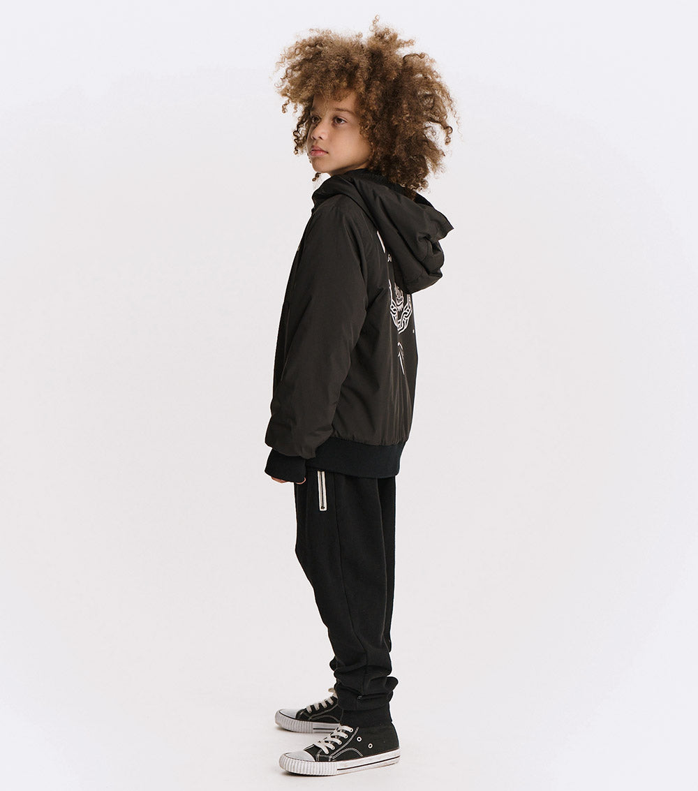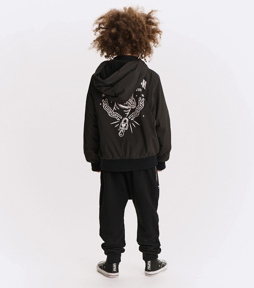 don’t let the name fool you. this fit is anything but basic. it’s a gender neutral black jacket with a light nylon layer on top for a clean, cool look. the inside features a full sherpa lining from hips to hood for next-level warmth & coziness. plus, it’s got oversized kangaroo pockets, ribbed cuffs with thumbholes, and a full front zip making it extra wearable. nu is printed on the chest in white to up the cool factor. but the real story’s on the back. a fearless feline is breaking free from captivity with the power of love. comfort & rebellion unite in one perfect package. just like your kid.