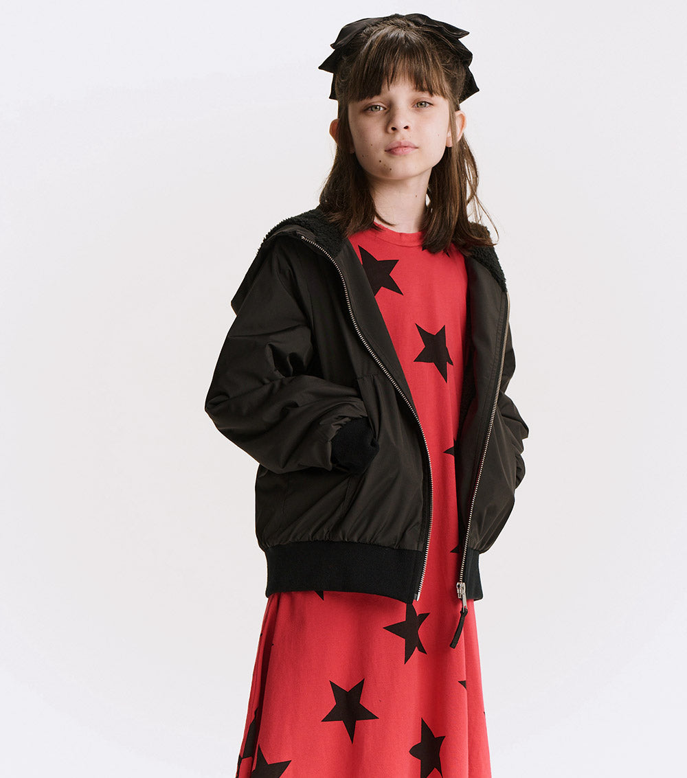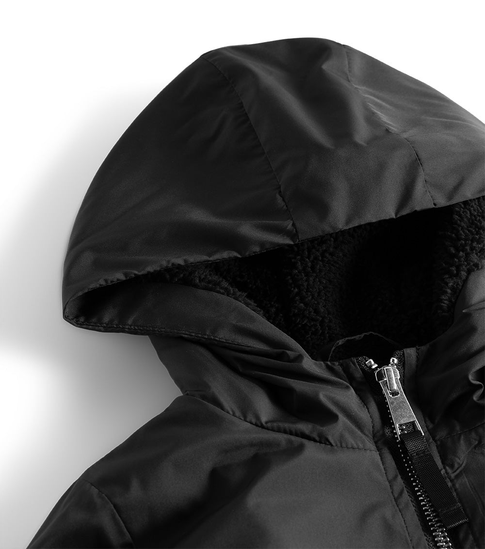 ribbed hemline and sleeves | side pockets | thumb holes | nylon + sherpa