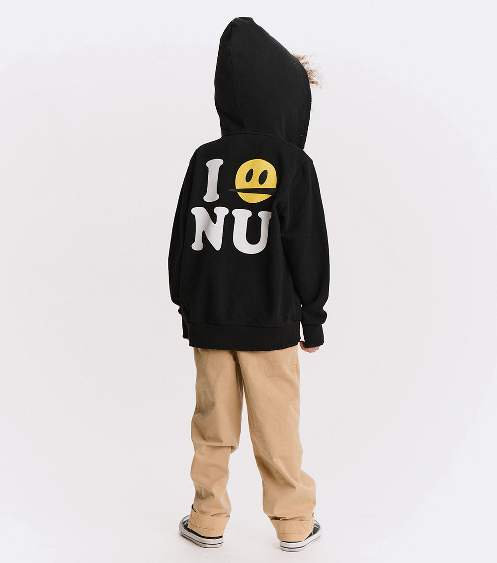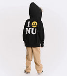 take a basic hoodie and give it a lived in, loved on, seen the world upgrade with this unisex french terry fit in black. from the front it looks clean and simple, but the back features a nostalgic print to remind you of the souvenir stores from all your fave trips. kinda like the i heart nyc vibe but with a smirky little smiley that looks like it has a few inside jokes of its own. the tag rides on the outside across from the contrasting zipper while thumbholes & subtle deconstruction give it that never-taking-this-off feel.