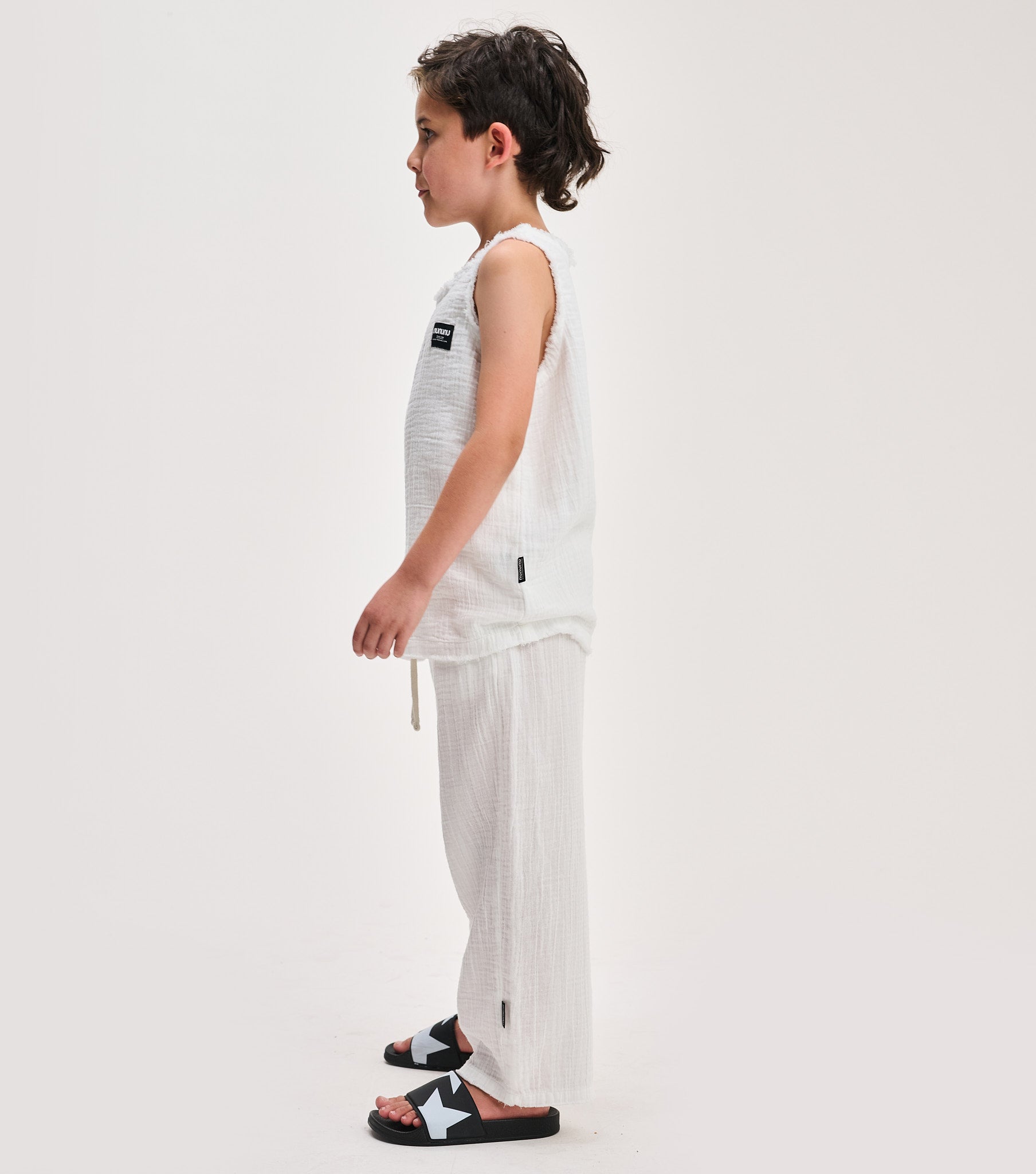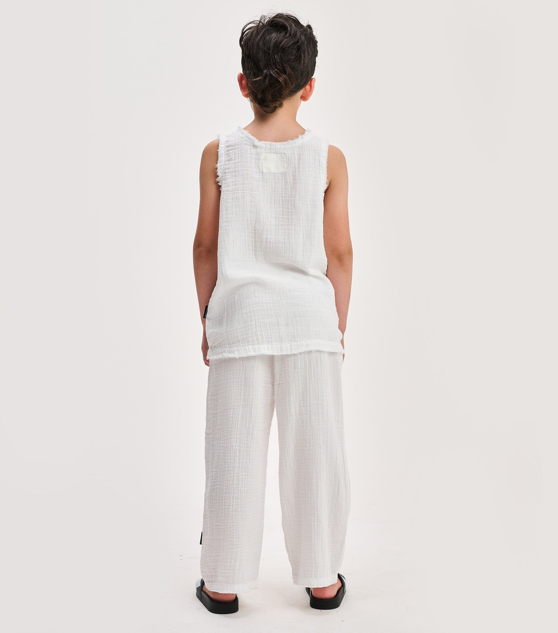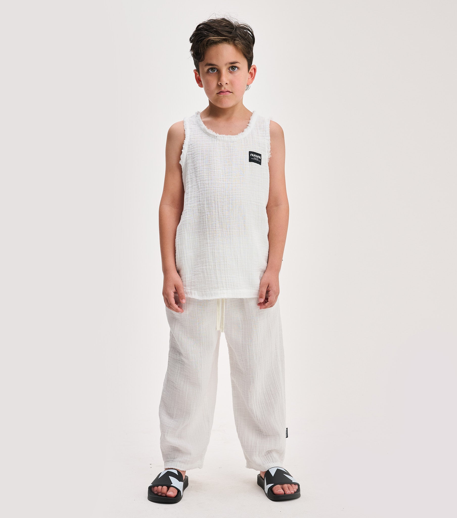 nothing says summer like a breezy tank made of fabric that feels barely there, even on the hottest of days. this one’s a gender-neutral fit in white muslin with a totally chill tie dye effect. it’s got a round neck & frayed edges all around to give it full on island vibes. yeah, it’s so relaxed all they’ll want to do is sip strawberry slushies on the sand. of course, the tag rides right up front in contrasting black so you don’t have to constantly tell people where you got it.