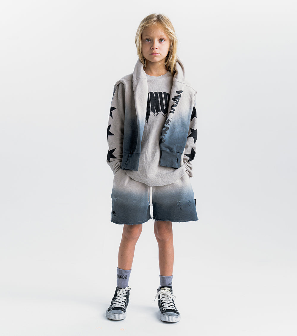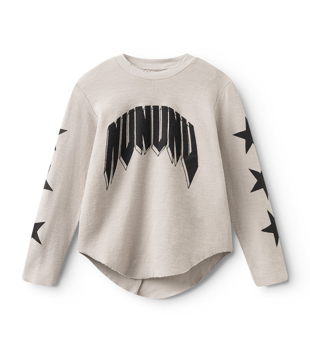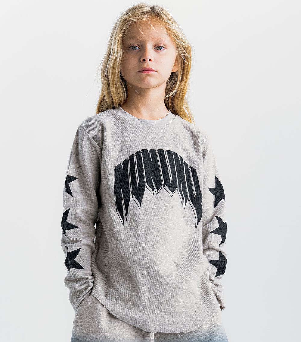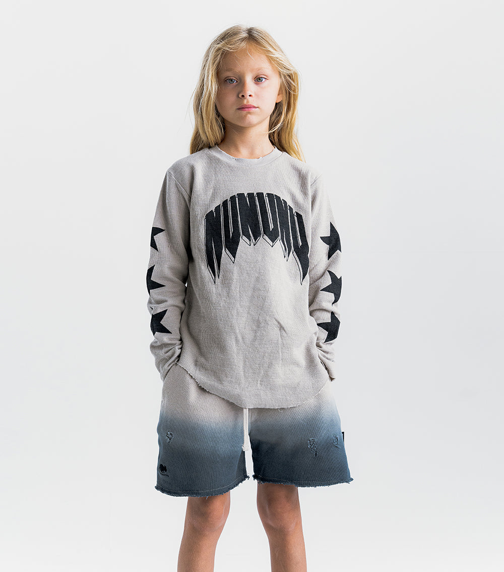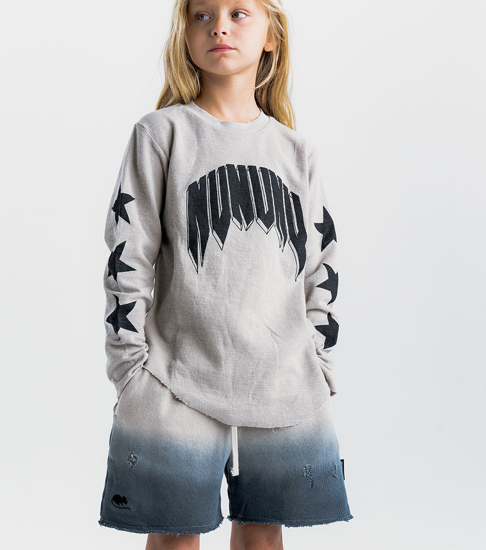 pull out that guitar & plug it in because it’s time to rock! we've got our totally edged up rawk logo bold & beautiful on the front of this unisex smokey grey t with our signature stars on the sleeves to match the oh so electric vibe. it’s made of super comfy & soft slub with raw hemlines perfect for all those long garage jam seshes. to keep it grungy we’ve got a super rounded hem at the bottom with the front a bit shorter than the back. if it's not already completely clear, the kid wearing this t marches to the beat of their own drum.