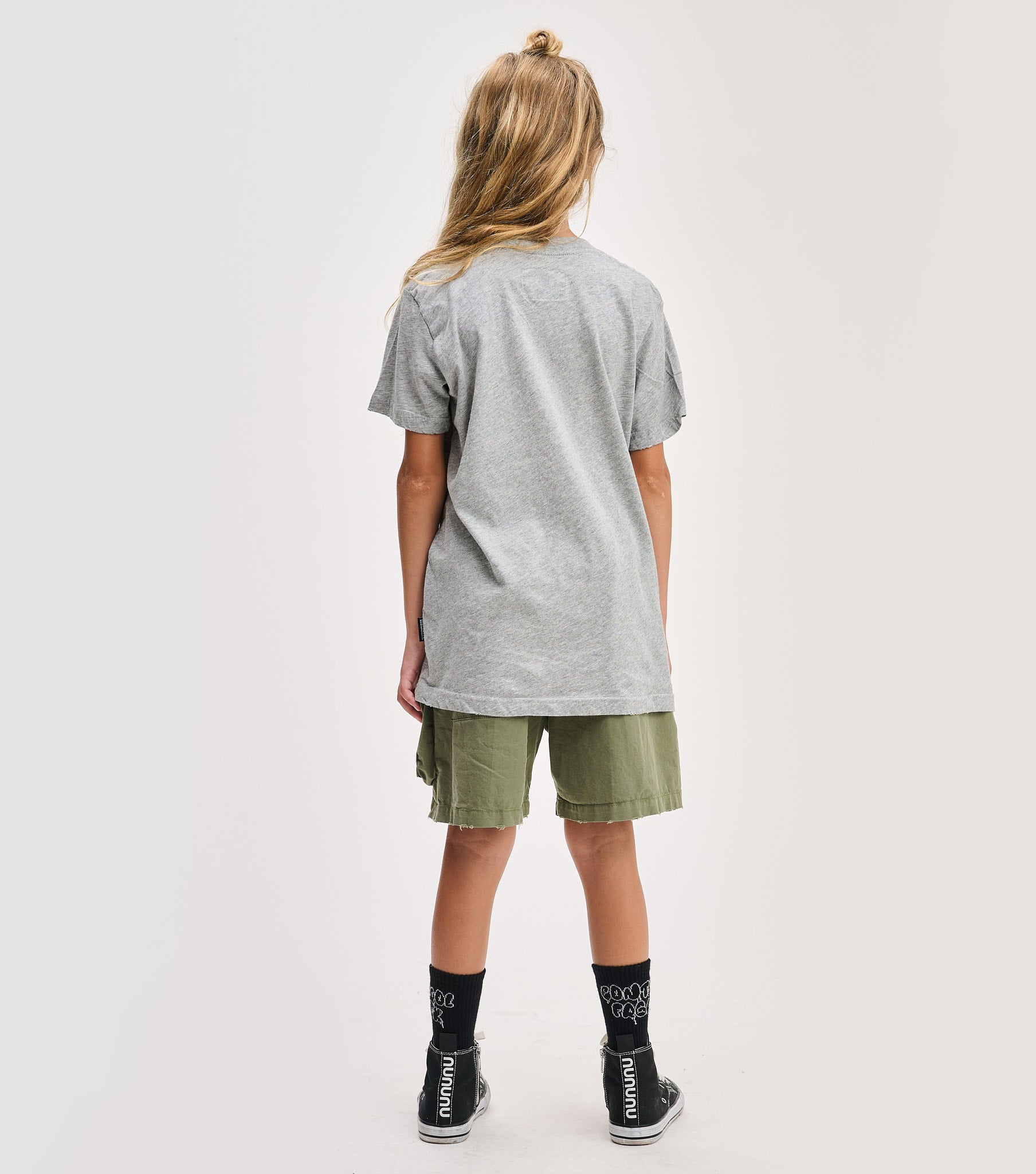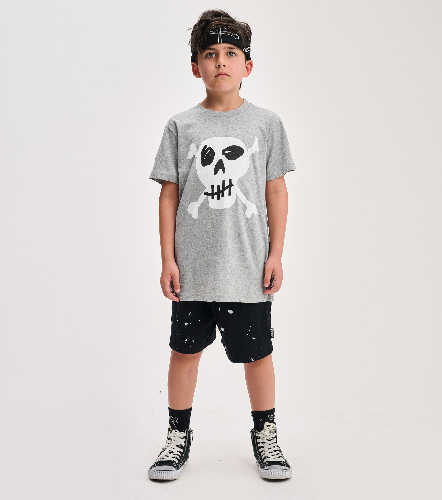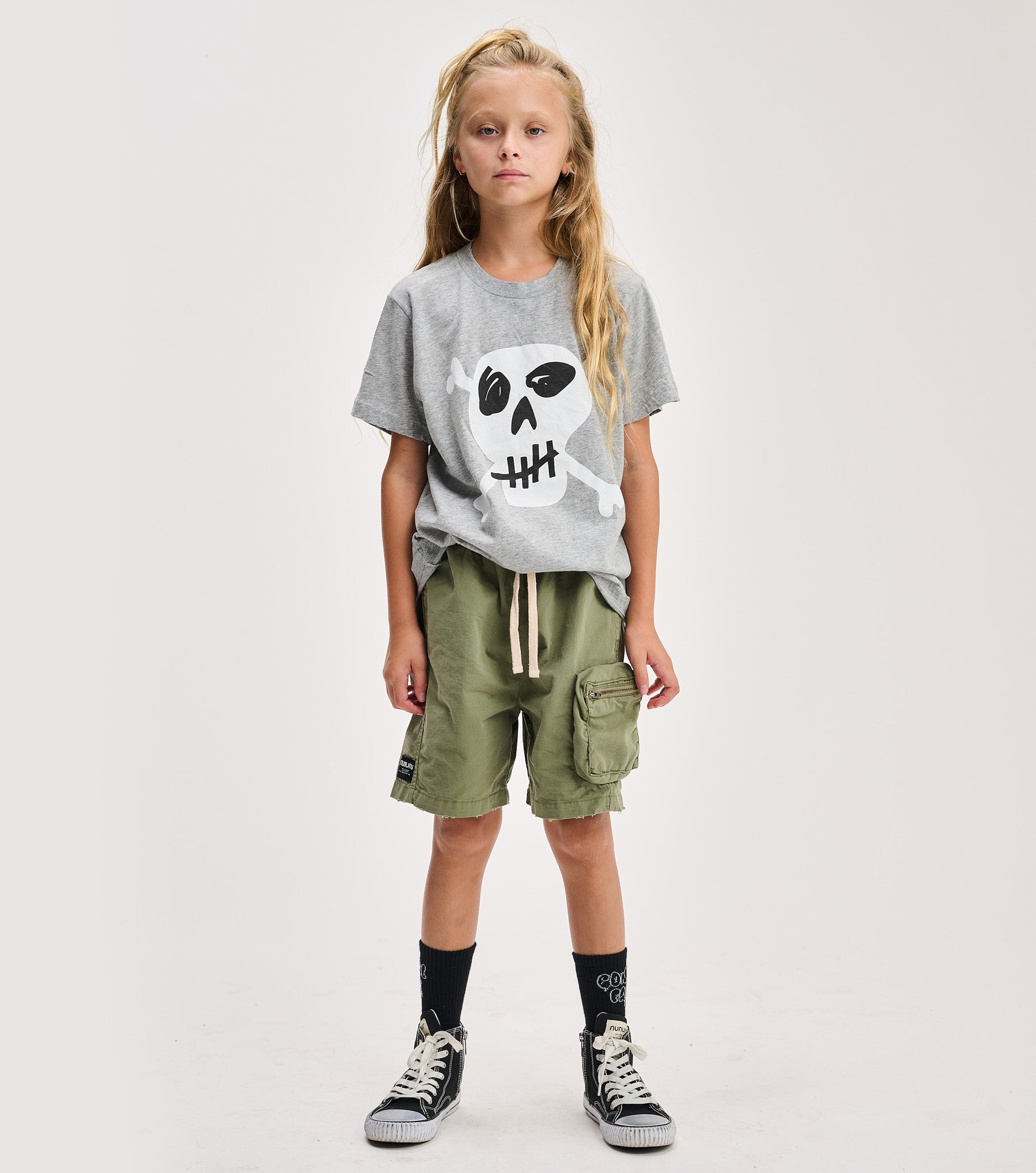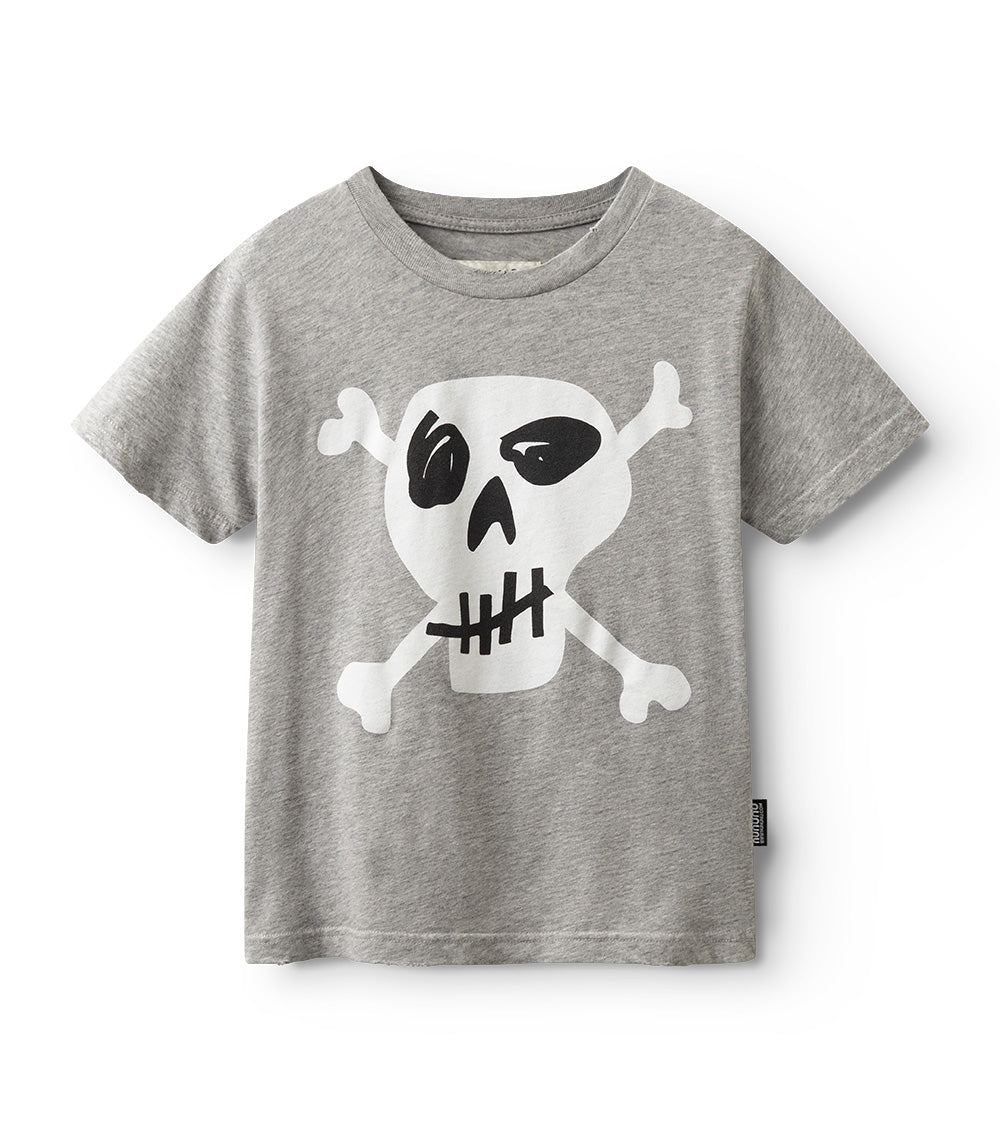 cool, classic and just a little bit kooky. this tee is a total match for your kid. it’s a gender neutral cut with custom deconstruction details that give it a loved to death look. it’s made of heather grey single cotton with a skull print that looks drawn on in pencil. obviously, we’re all about it and we’re sure your kid will be too.