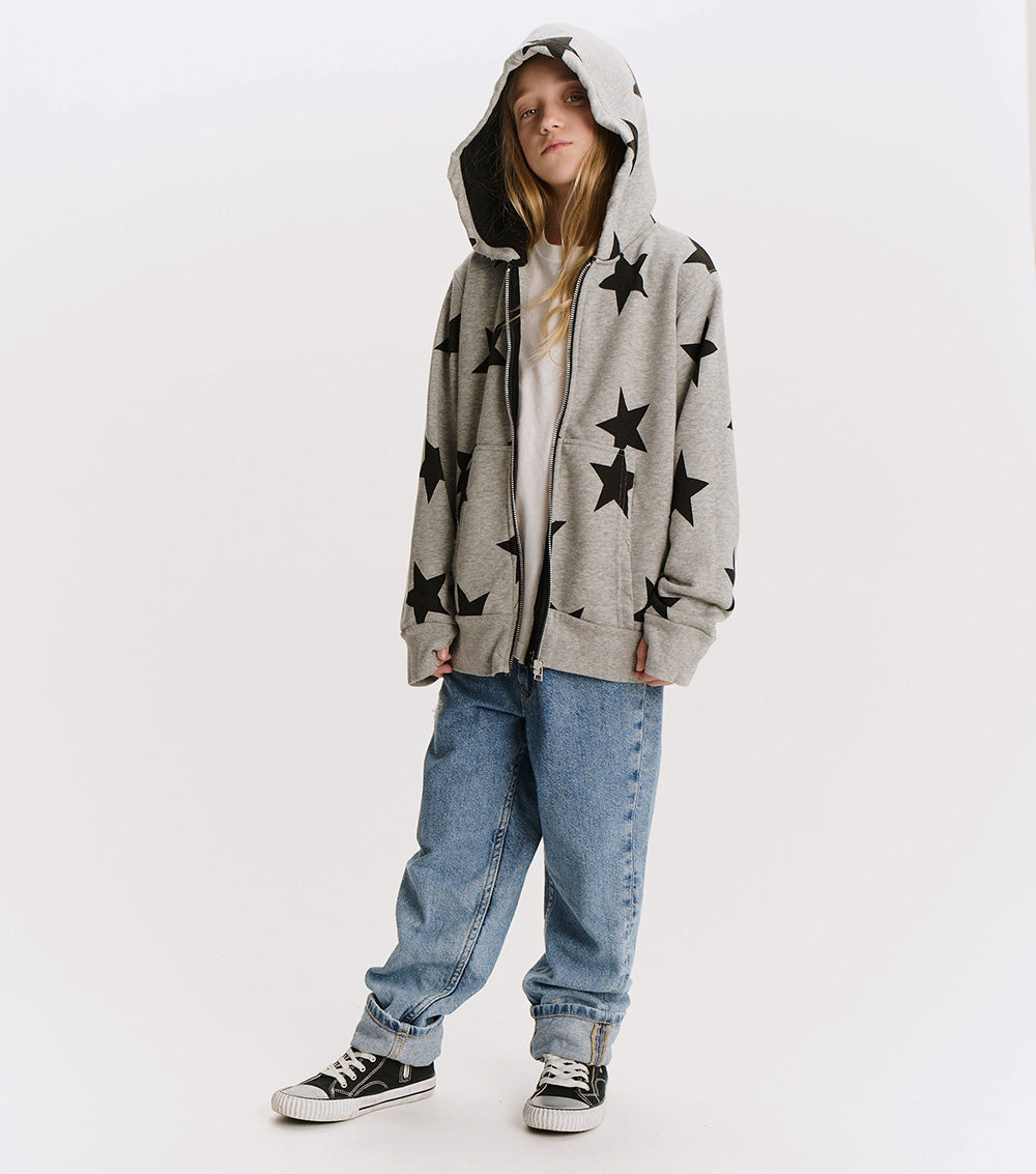 if you are what you say you are, a superstar – then show it. this cool grey hoodie is a nununu classic with an all-over star print, roomy kangaroo pockets, and thumb holes that make this piece cozy, comfortable, and cool. wear your stardom on your sleeve.