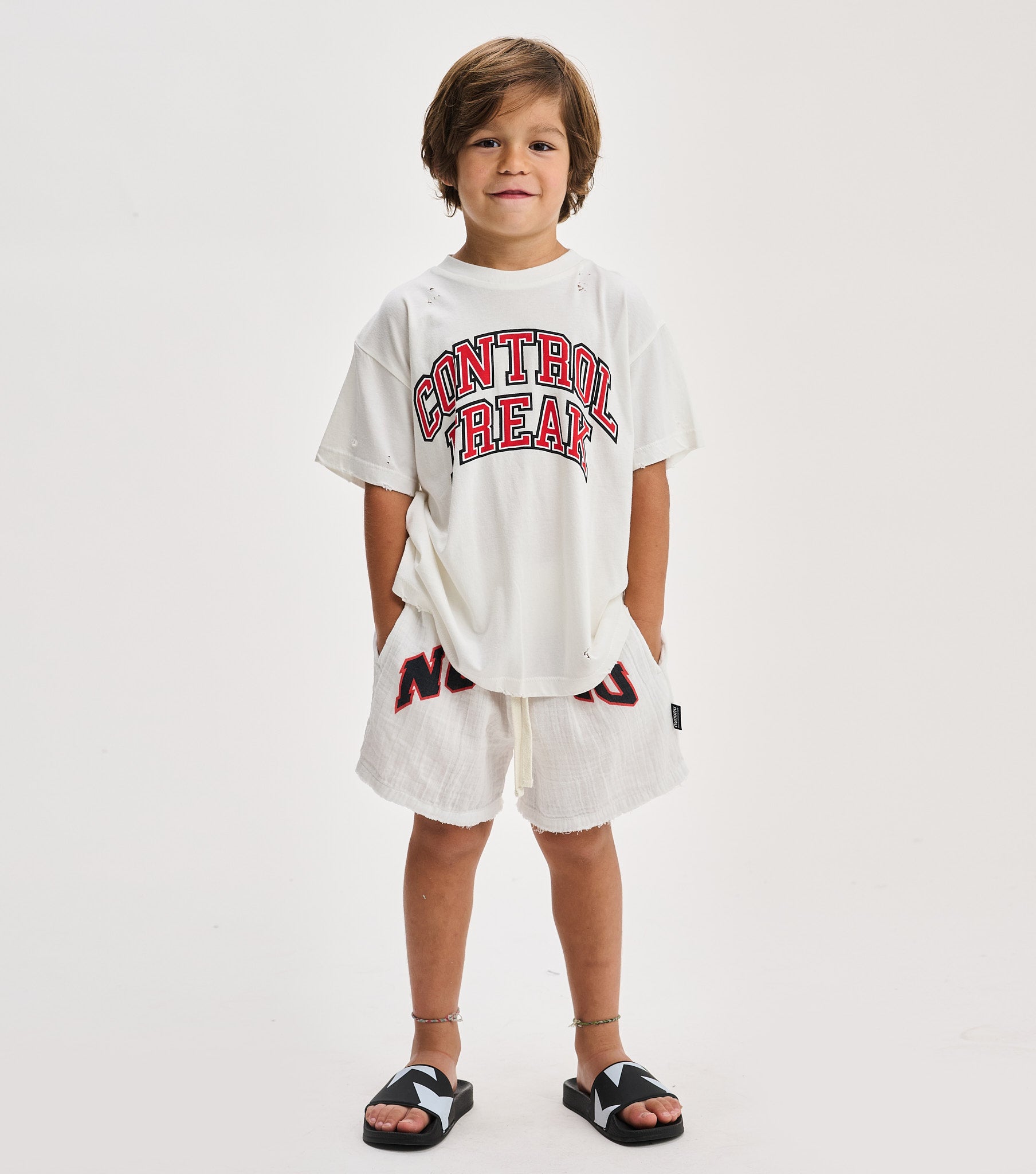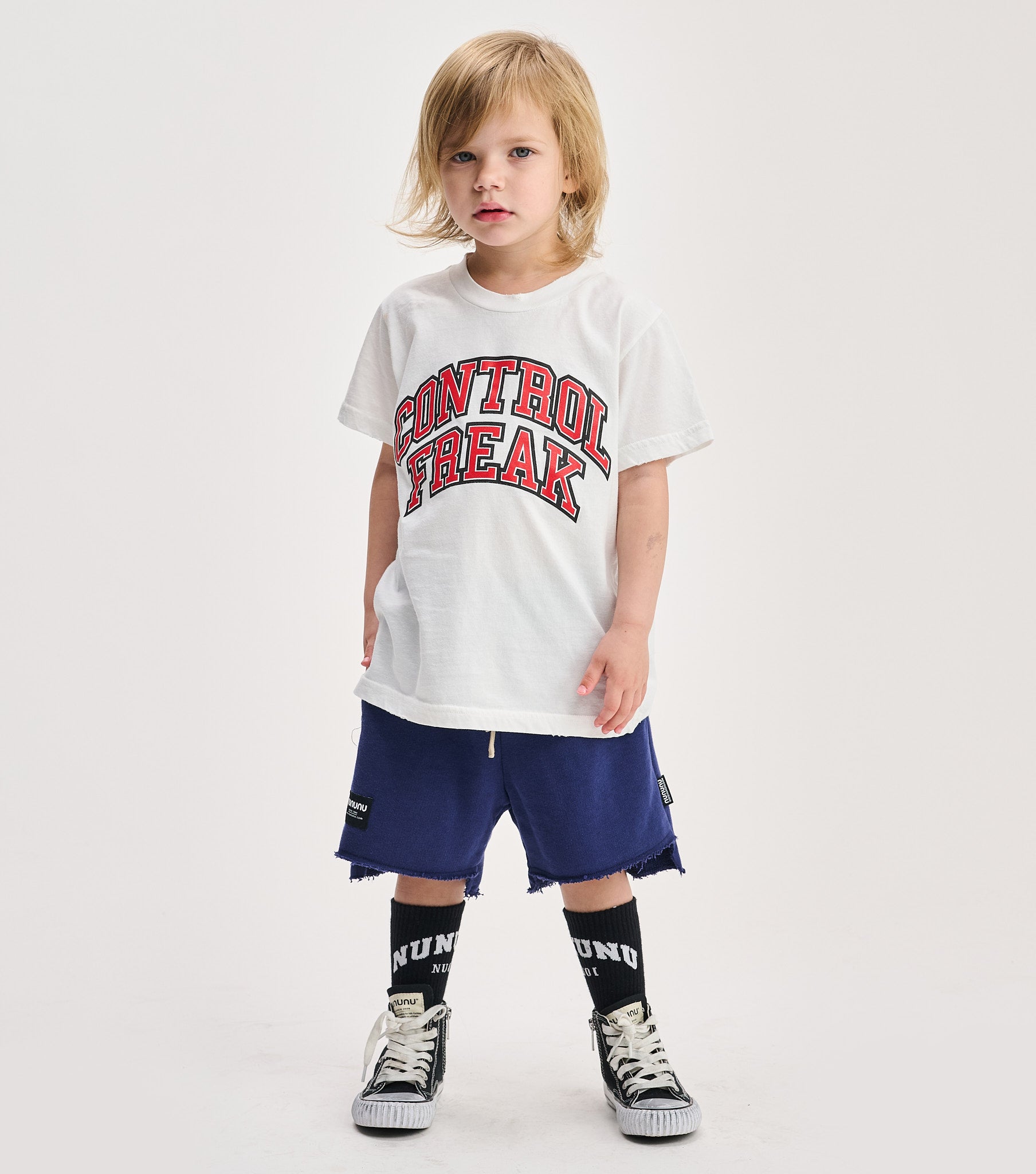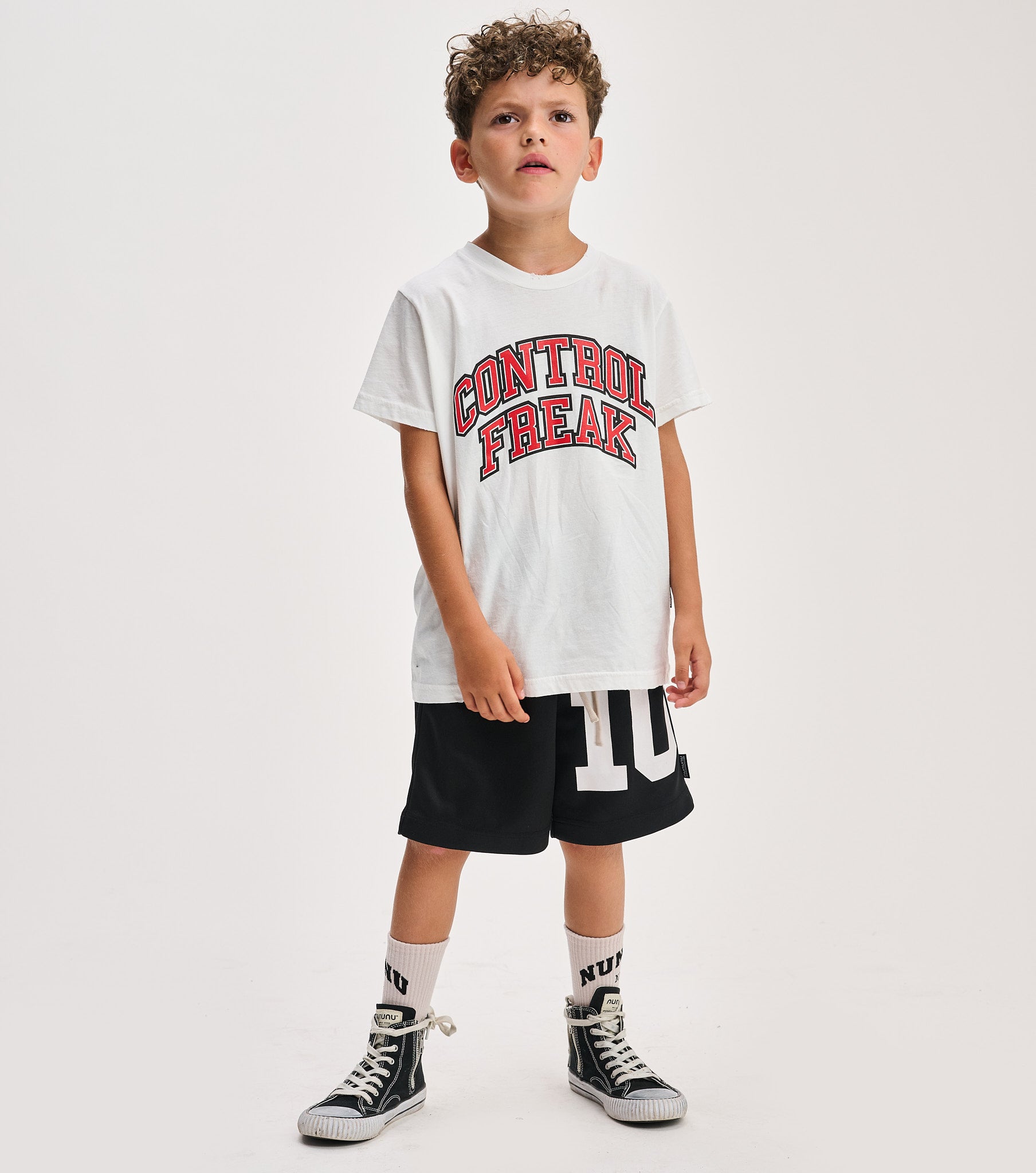 welcome to control freak university, your kid has just been accepted! of course, that's why we’ve got this bold t-shirt welcoming them to the club. it's a gender neutral cut made of white single cotton with custom deconstruction for that lived-in look. it says control freak in our collegiate style font with big, bold red lettering outlined in black & white to make sure anyone passing by gets the message loud & clear. the kid wearing this shirt rules the school.