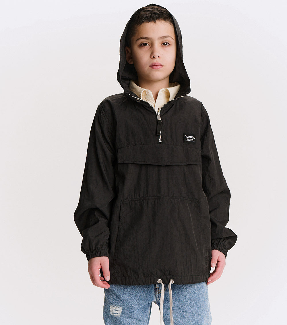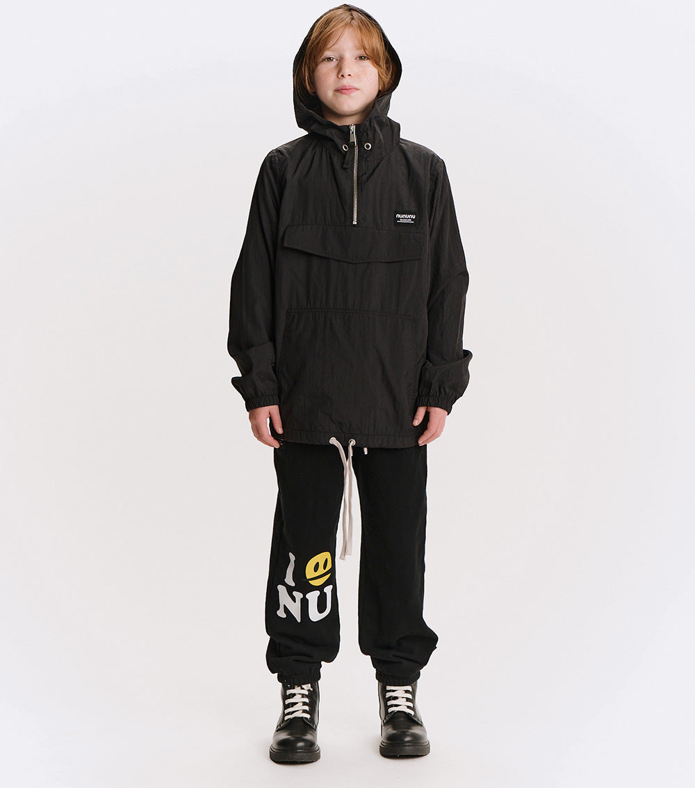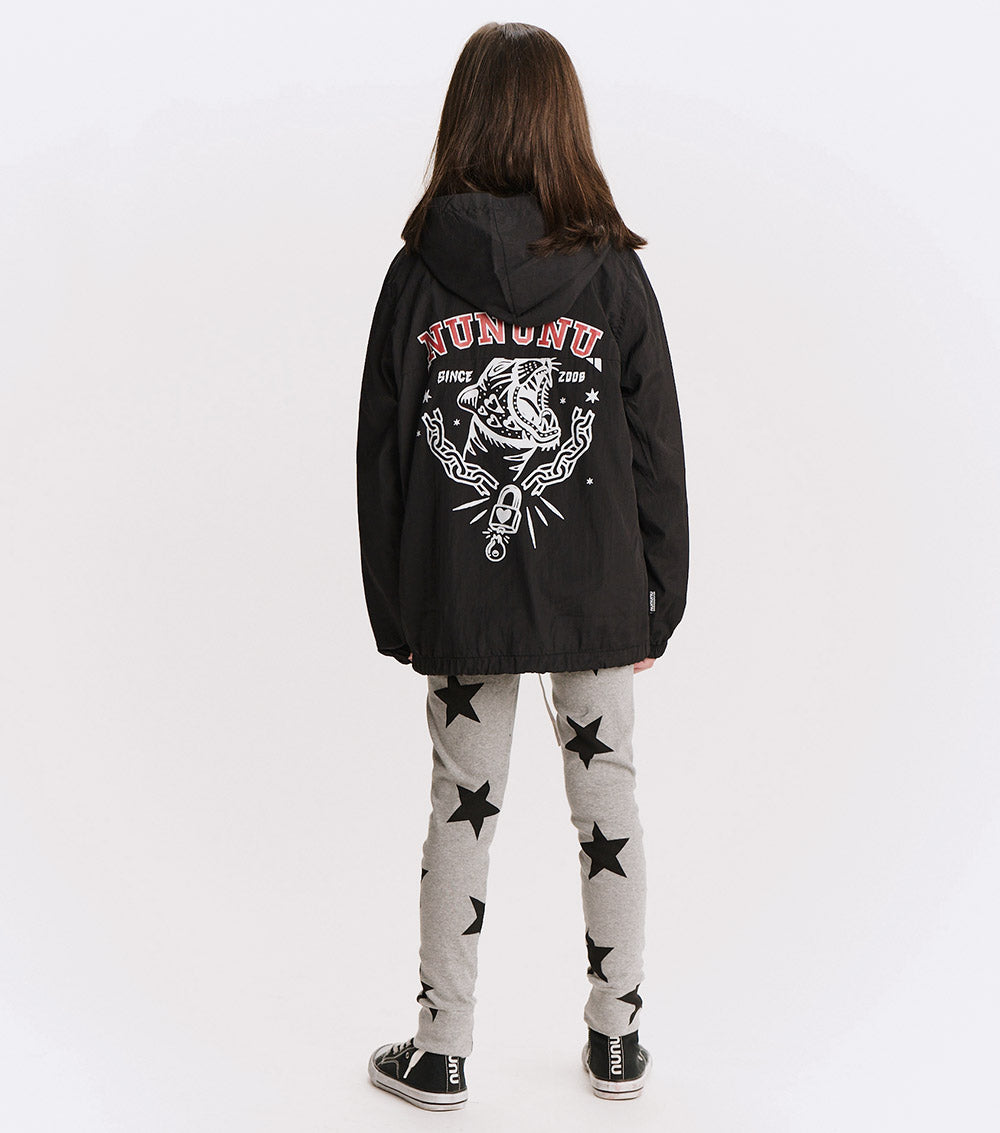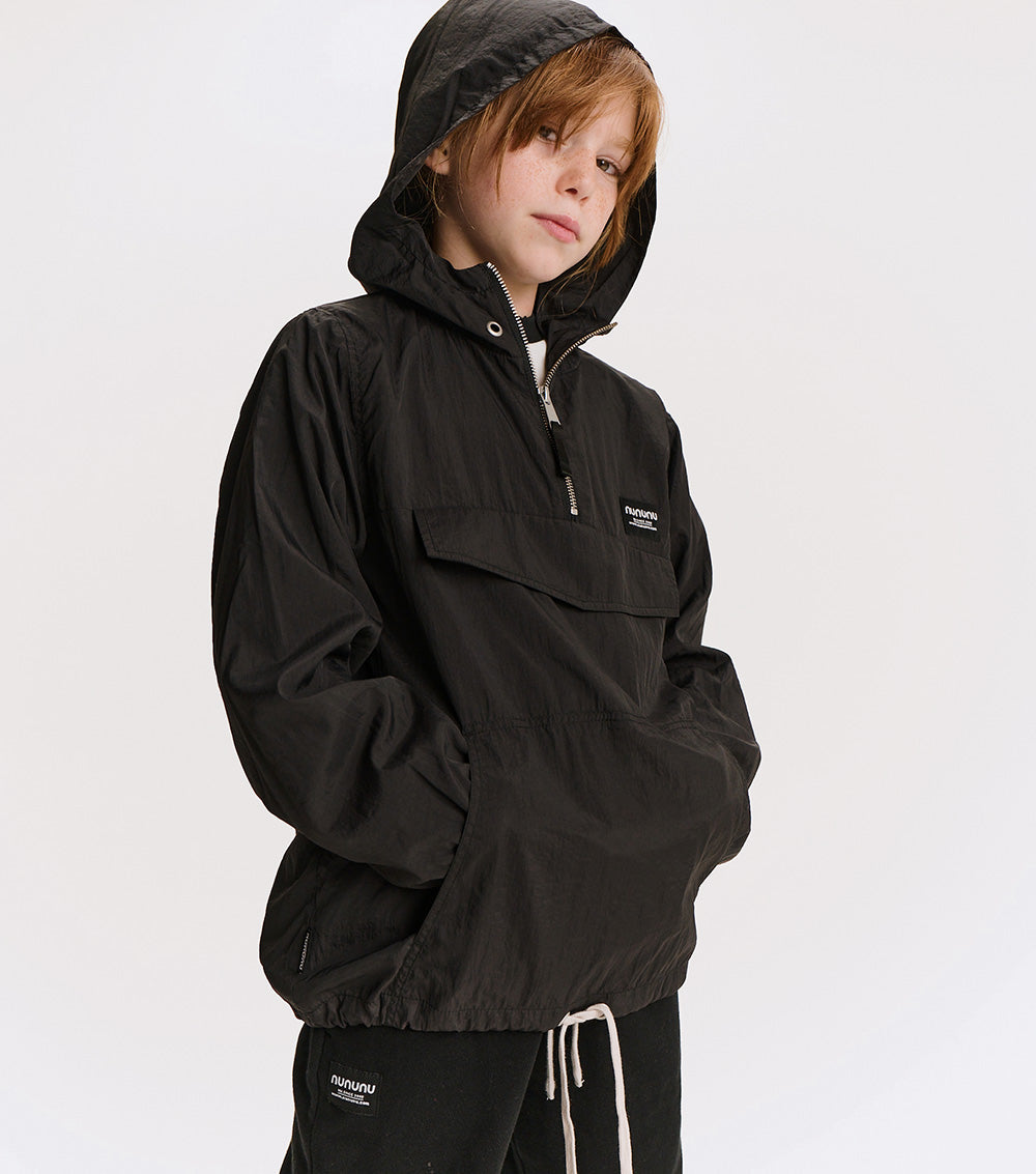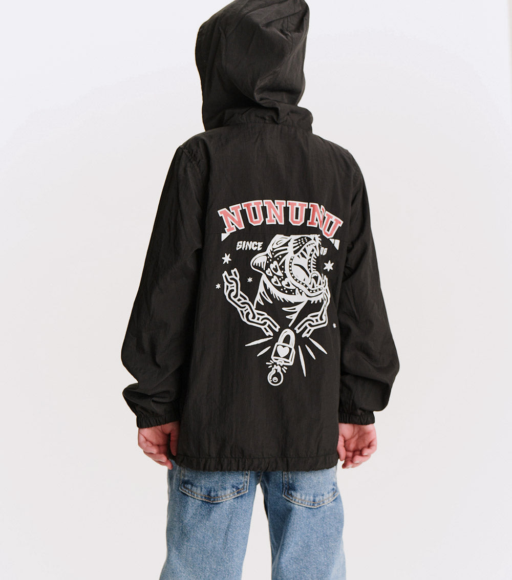 the kid who wears this fierce jacket definitely can't be tamed. it’s a black anorak made with nylon to give it that slick, breathable feel, made for movement. a big front flap pocket is actually fake, but we have you covered with huge side pockets! the drawstring hem lets you go puffy or straight depending on the mood. of course, it’s also got a ¼ zip up top, an easy hood, and comfy elastic cuffs. but it’s the back that really roars. our bold & beautiful print features a fearless kitty breaking out of captivity with nothing but love & determination. nununu arches across the top in red & white collegiate print along with since 2008, because just like this tiger, we’ve been breaking the mold for awhile now.