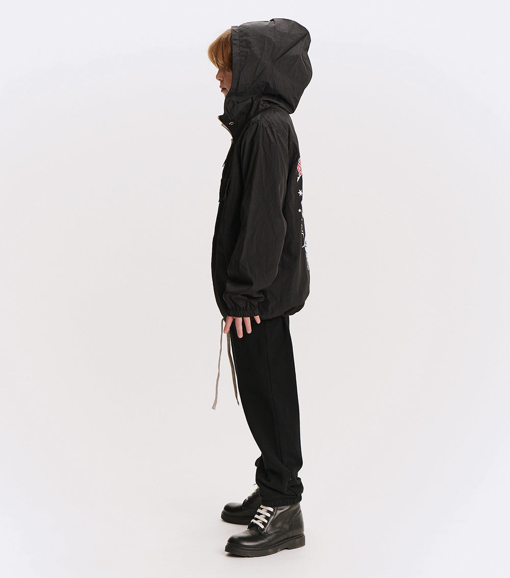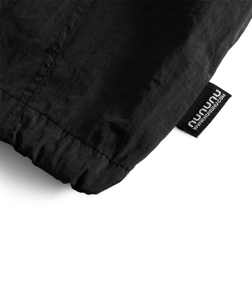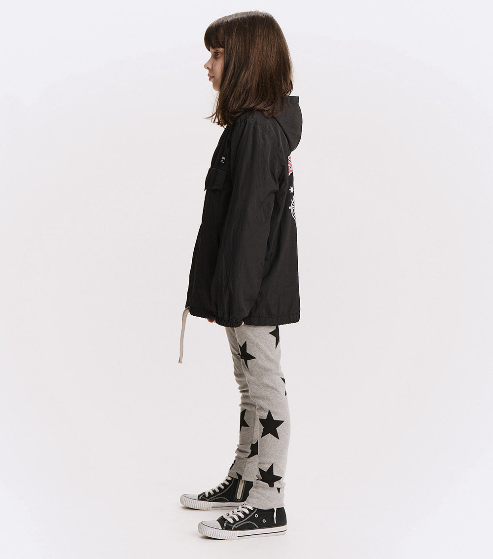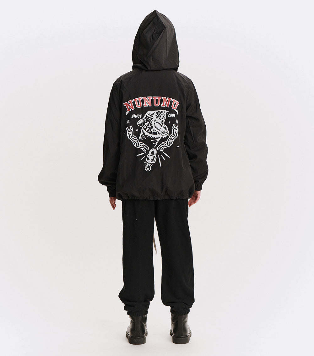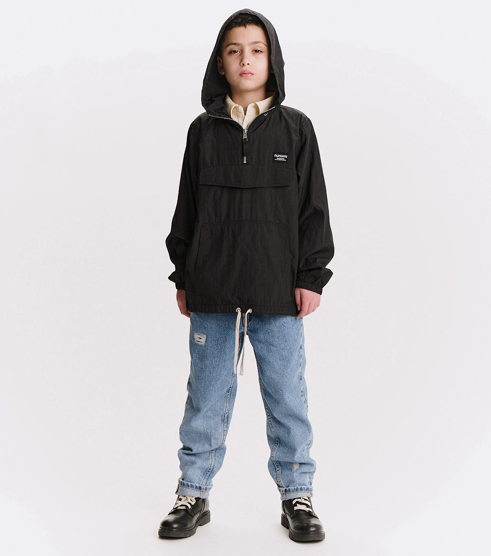 the kid who wears this fierce jacket definitely can't be tamed. it’s a black anorak made with nylon to give it that slick, breathable feel, made for movement. a big front flap pocket is actually fake, but we have you covered with huge side pockets! the drawstring hem lets you go puffy or straight depending on the mood. of course, it’s also got a ¼ zip up top, an easy hood, and comfy elastic cuffs. but it’s the back that really roars. our bold & beautiful print features a fearless kitty breaking out of captivity with nothing but love & determination. nununu arches across the top in red & white collegiate print along with since 2008, because just like this tiger, we’ve been breaking the mold for awhile now.