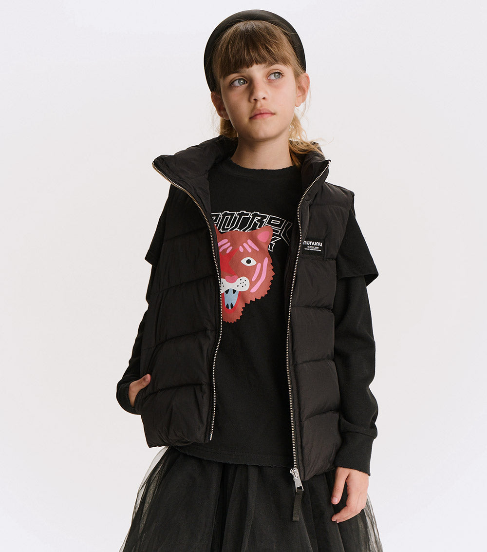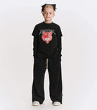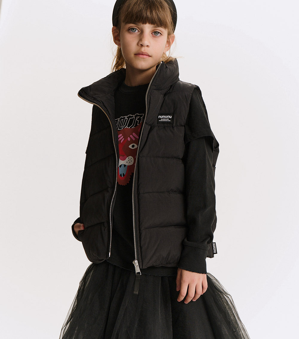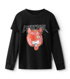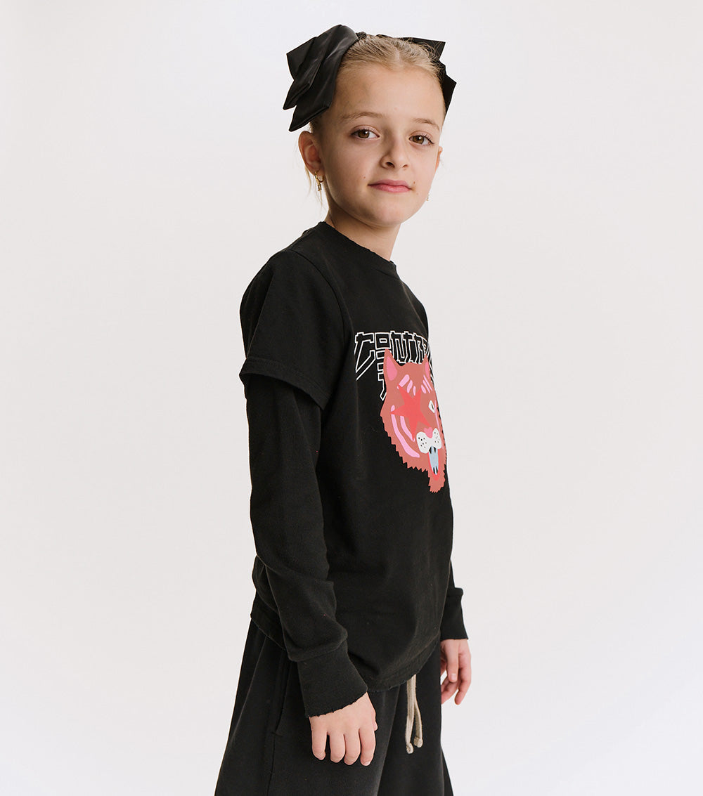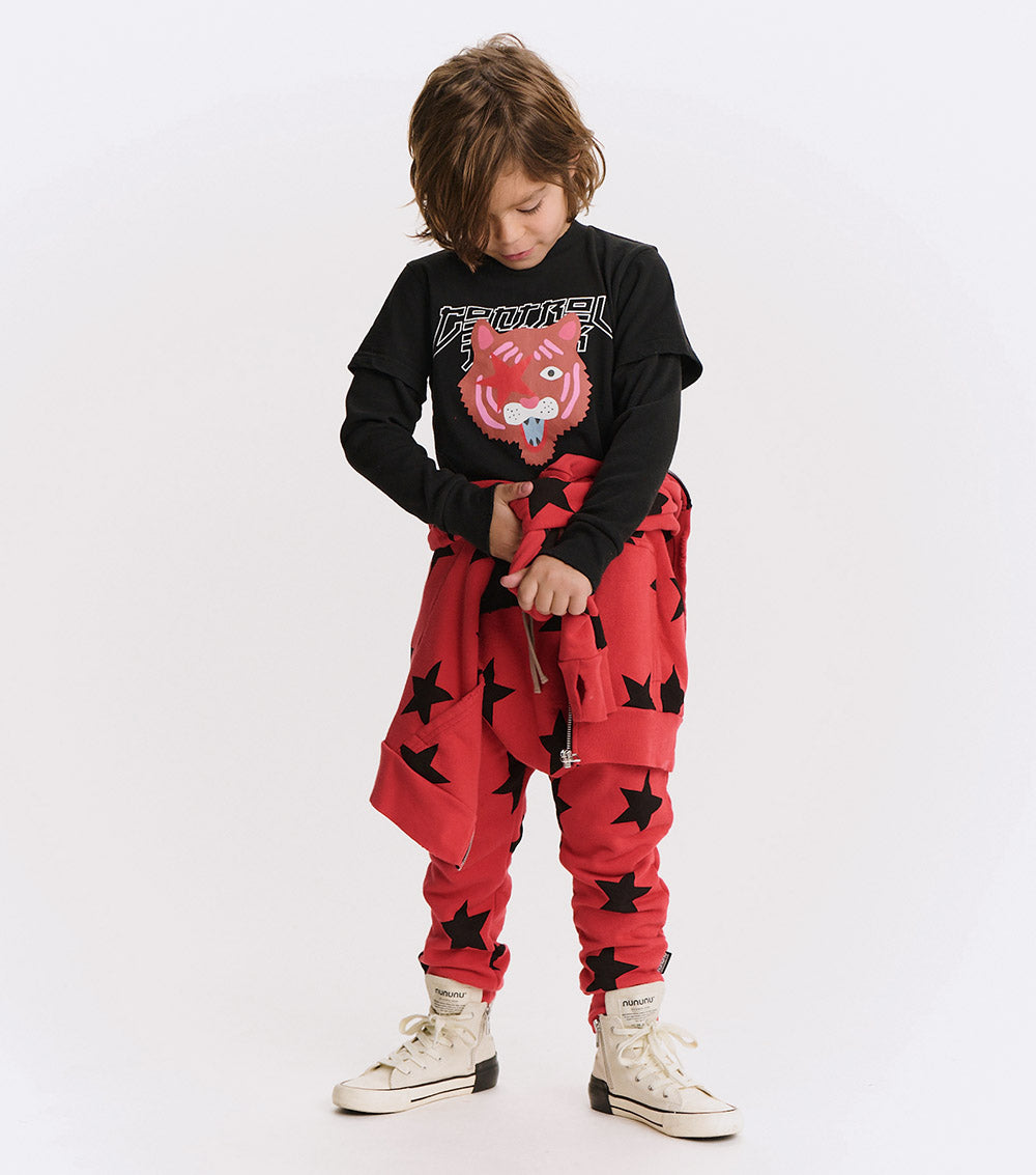 woah, did you hear that? this single cotton twofer is roaring big time with a bold red print of a tiger. but don’t let that sweet little star and matching smile fool you. this kitty is fierce but in a cute way. just like your kid. and to match that feistiness, this black shirt hangs over long black sleeves with custom deconstruction. oh yeah and behind the furry head, it says control freak in angular letters that look kinda like they were spelled out with sticks. with a look this in sync with your kid’s psyche, this shirt is ready to pounce on the number one spot for their all time fave look.