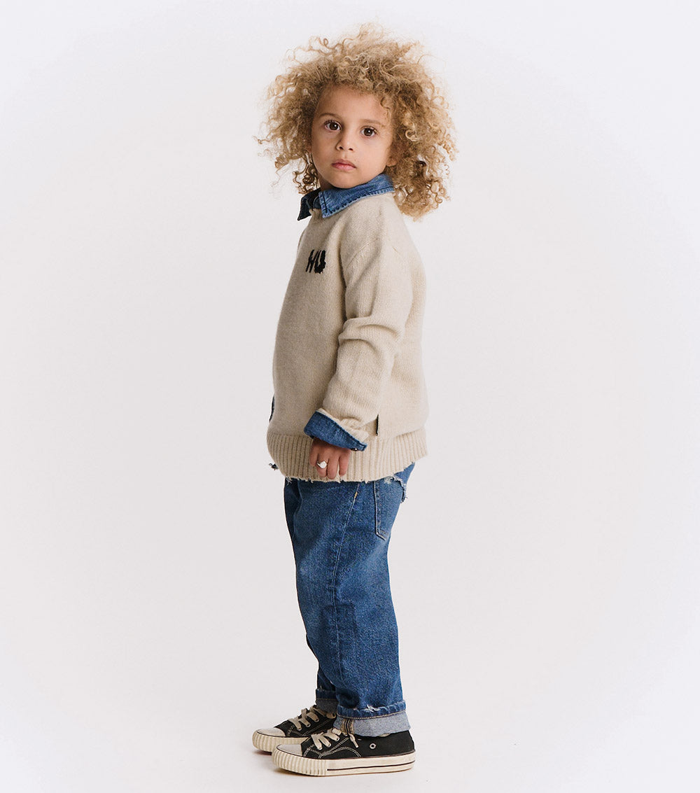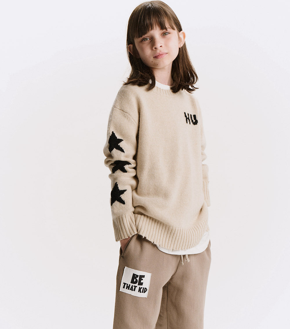 can’t decide between the grunge or polished look? have both with this natural cashmere blend crew neck. it’s a classic fit with nu knitted in white with a little glitch to make it look like the letters have been sliced in half. to give it some rebel vibes, we’ve got three white stars on one sleeve & custom deconstruction along the edges. layer over a collared shirt to lean into the og preppy look or pair with chunky black boots to go more punk with it. either way, this one is sure to be the star of the show