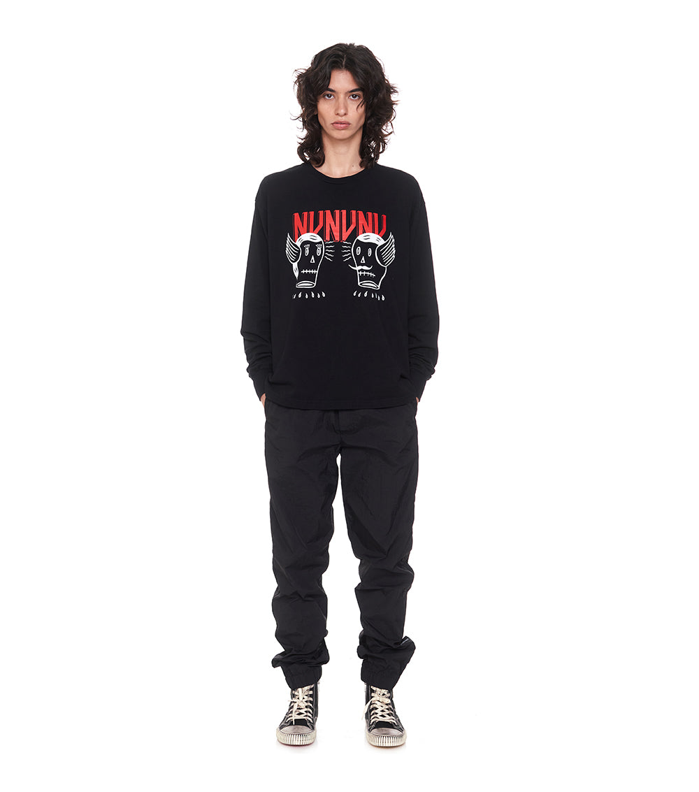 we’ve been collaborating for quite some time with craig hopson (aka “craigio”), by far one of our favorite illustrators that always manages to put a smile on our face – and constantly surprise us with his over-the-top characters and kooky portraits. for instance, these funny floating heads duo got us to love them in first glance… the black long-sleeved shirt is made from soft and a tad thicker cotton in relaxed fit, our rawk vibed logo pops out in red and defiantly gives this number a twist. available in men's size too.