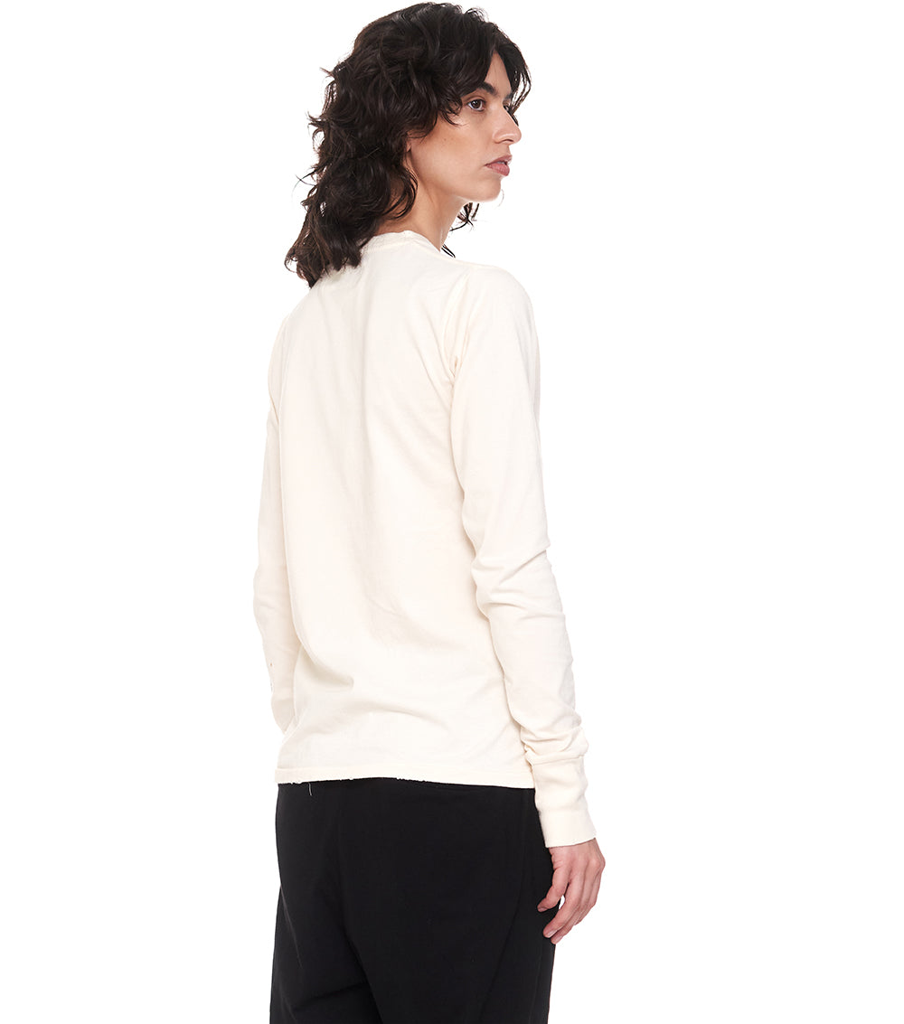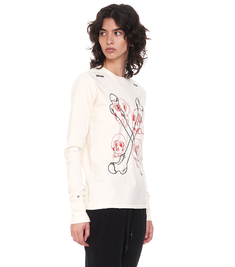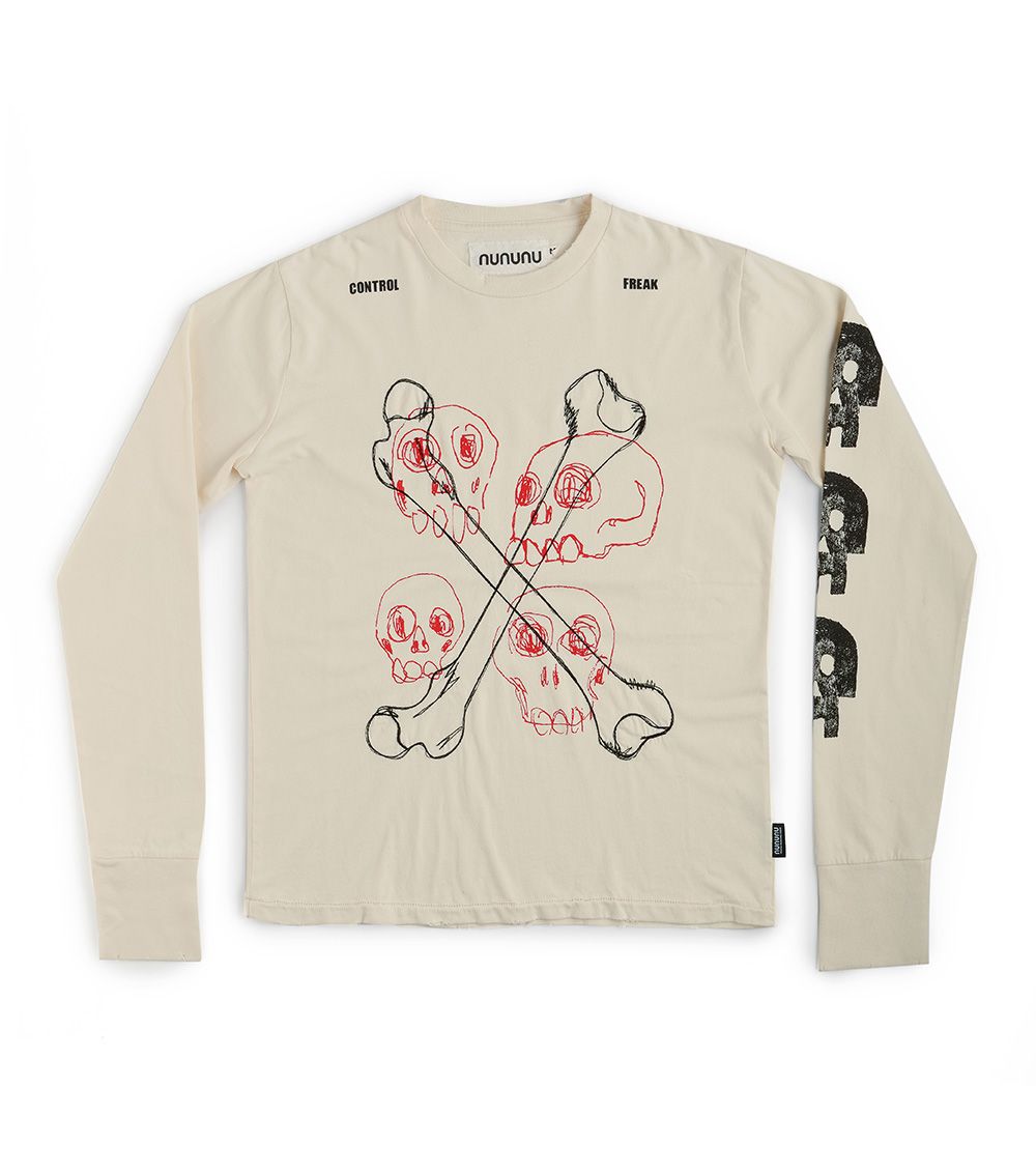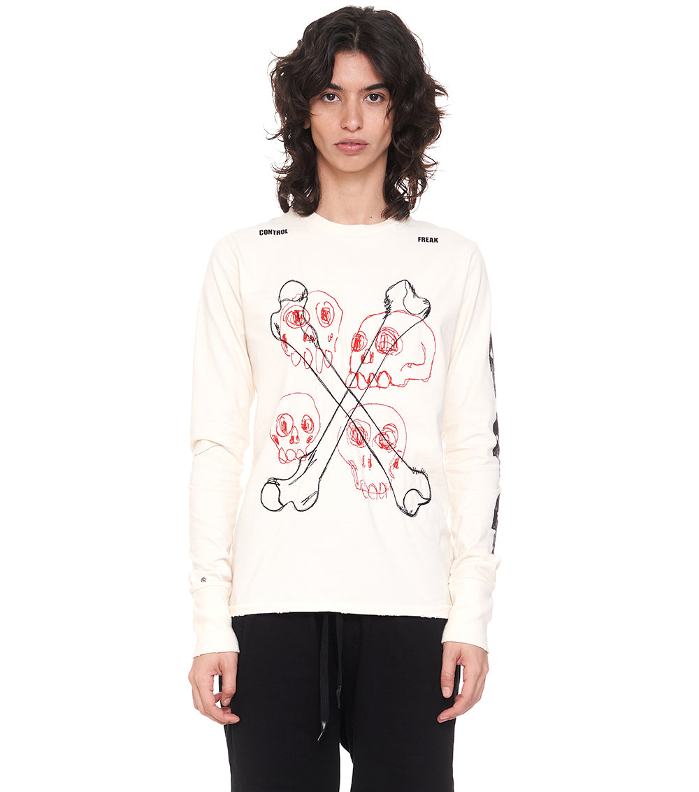 our obsession with skulls continues with this long cozy natural sleeve t-shirt. cut for a relaxed fit, it has primitive, early man-style skulls are printed in red and raw like bones are embroidered in black – both on the front & spookier mask-like ones printed down the sleeve. both are collaborations with artist Shay Id Alony. our embroidered tiny skull appears near the right hand cuff, and we’ve got crossbones & the words “control” & “freak” on either side of the chest. because, yeah. this one comes in men’s sizes too.