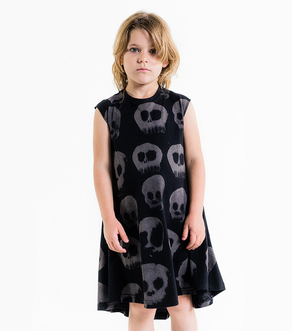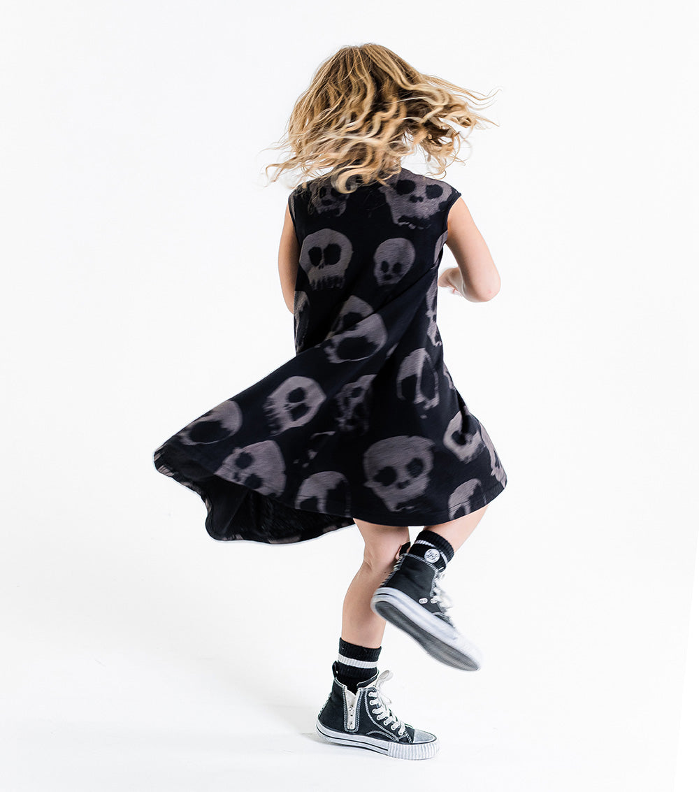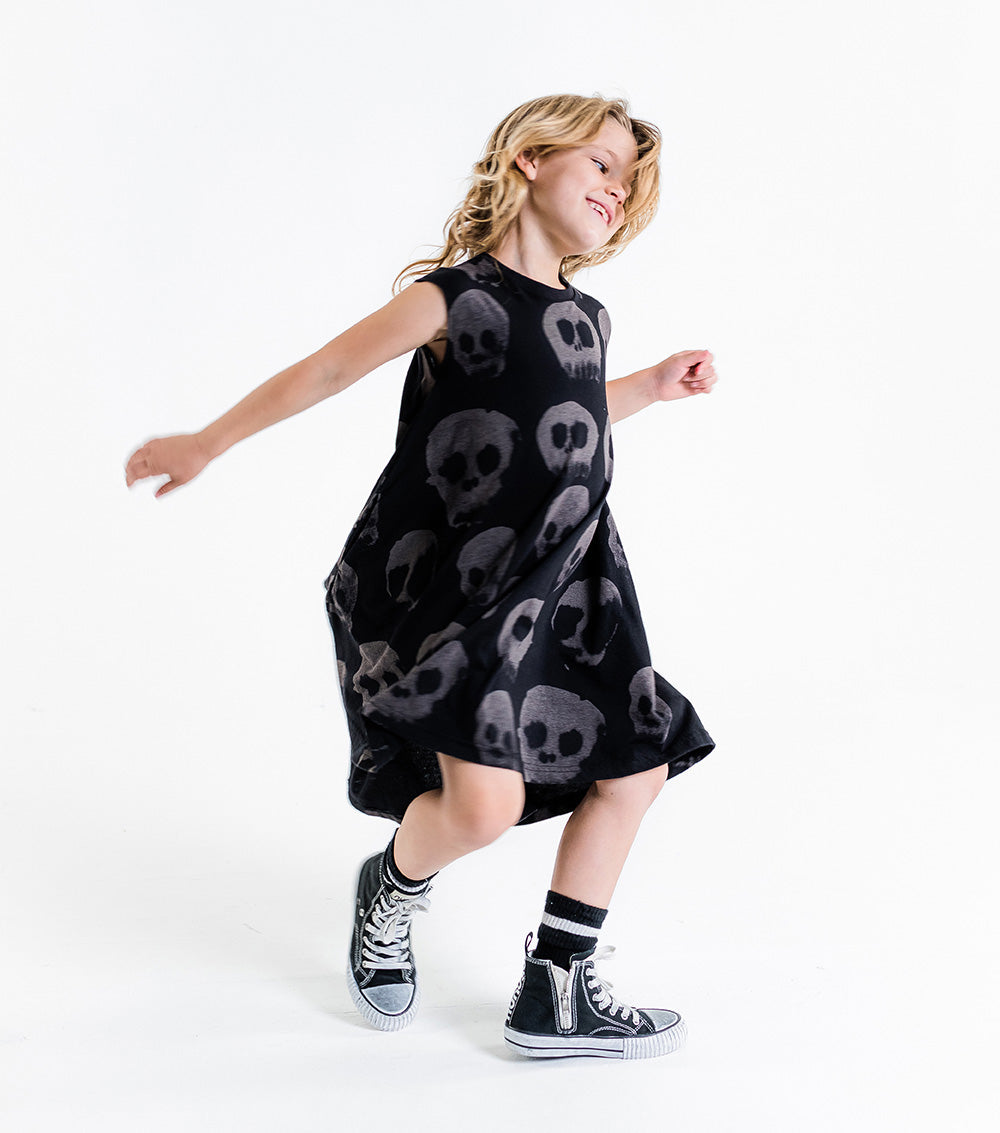 the classic nununu 360° dress is now updated with water skull print, which is our way of saying it’s cool to have fun & express yourself with whatever is lying around the house. it creates this cool visual effect when you twirl around, which is the whole point of this dress, basically. long & full but not bulky, the black 360° is super comfy for literally anything the kid wants to do.