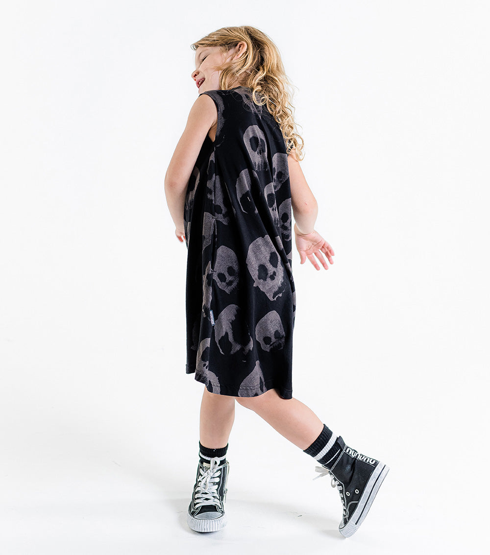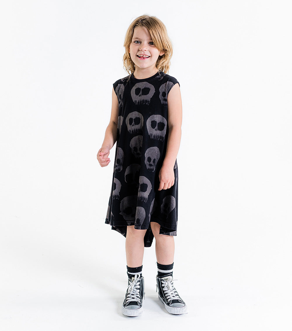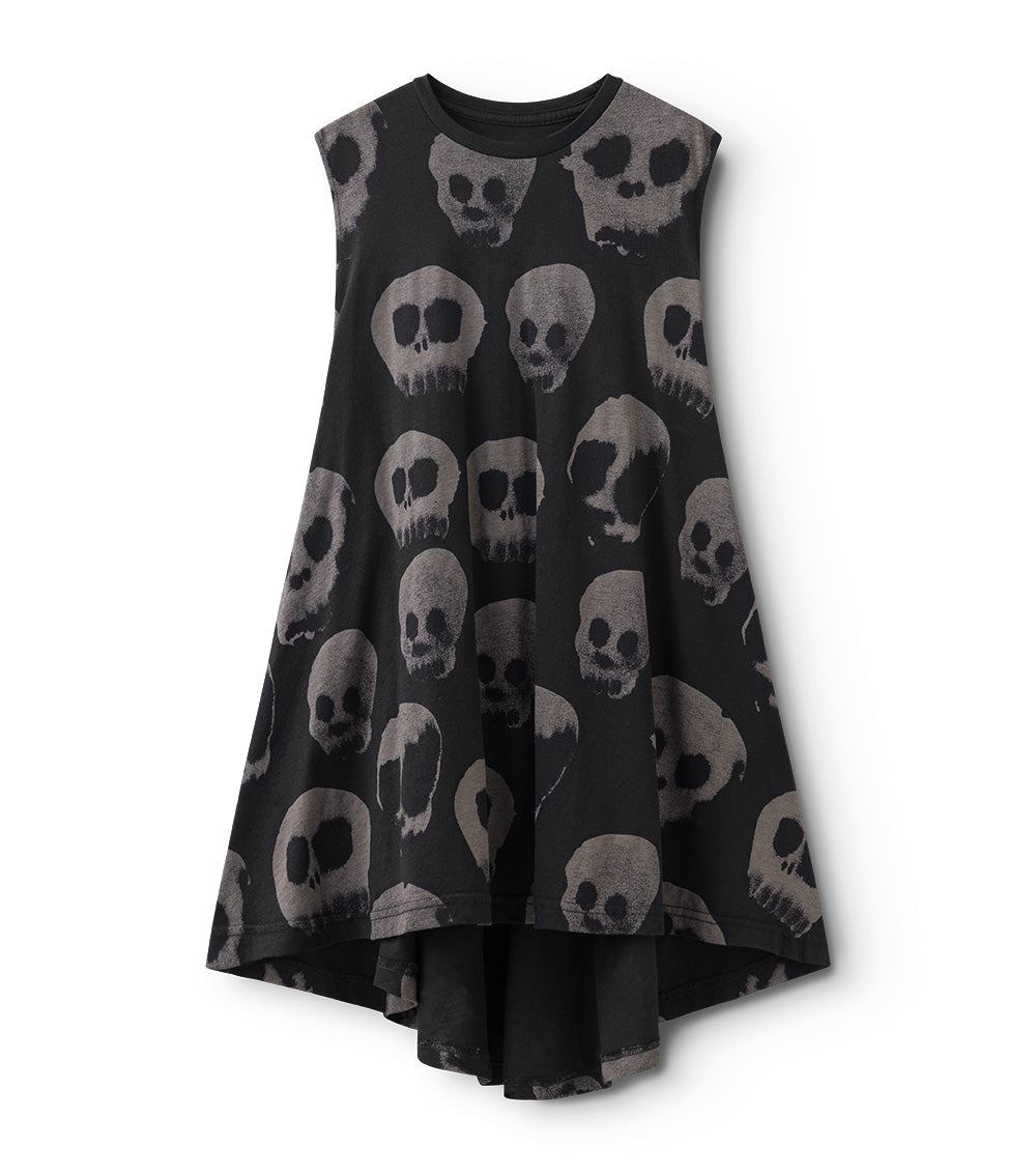 the classic nununu 360° dress is now updated with water skull print, which is our way of saying it’s cool to have fun & express yourself with whatever is lying around the house. it creates this cool visual effect when you twirl around, which is the whole point of this dress, basically. long & full but not bulky, the black 360° is super comfy for literally anything the kid wants to do.