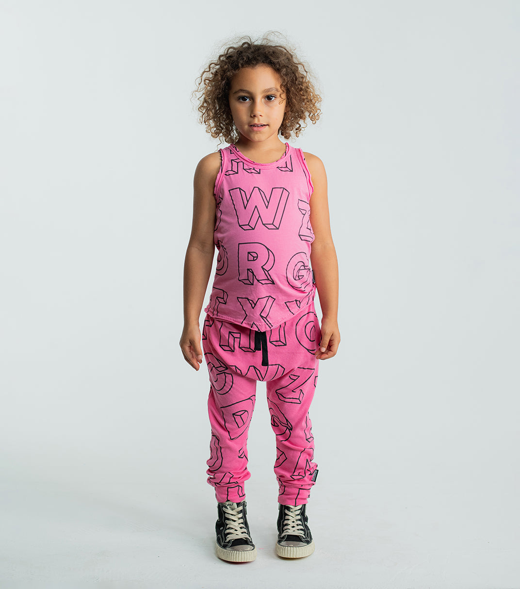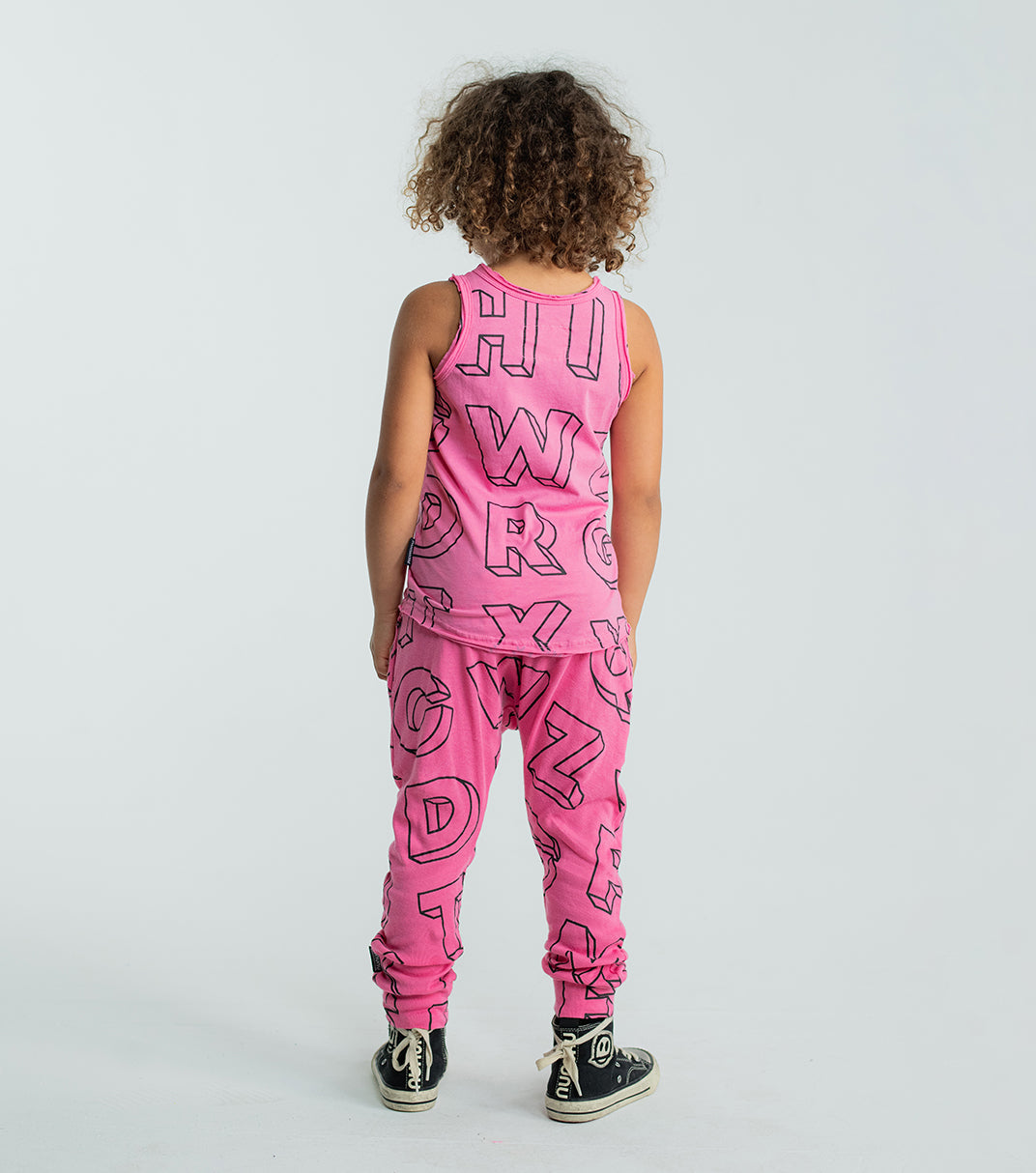 our beloved black unisex baggy pants are printed all over with 3D-block alphabet letters. these soft, fine-rib cotton pants are roomy & slouchy, giving legs the freedom, they need to run, play & perhaps even sit still at times. a drawstring elastic waistband keeps ‘em up.