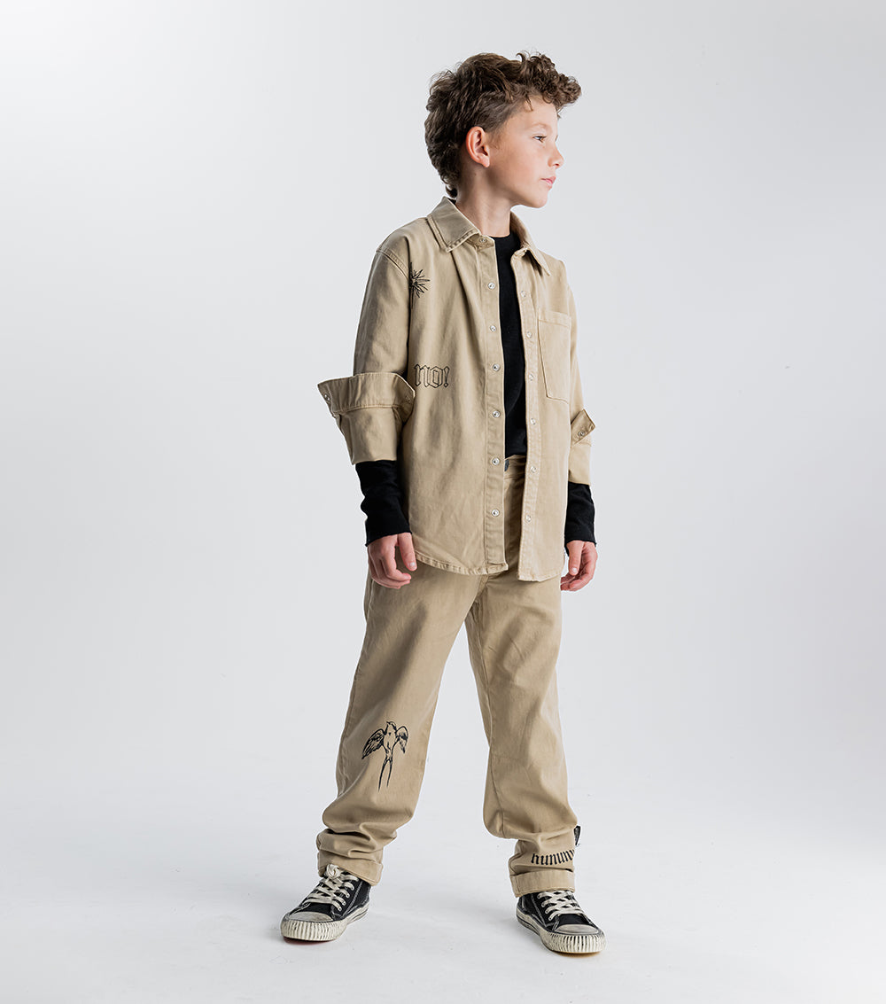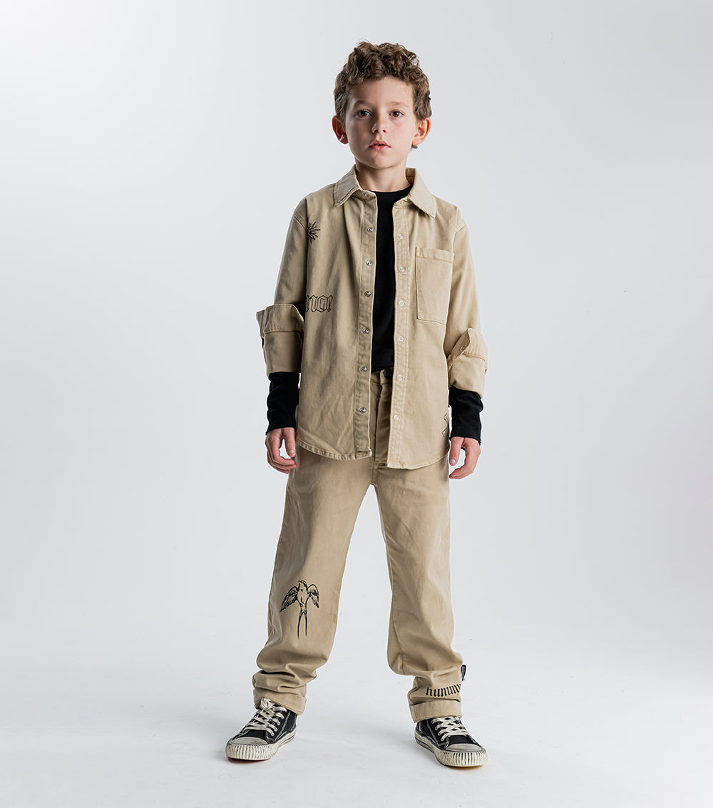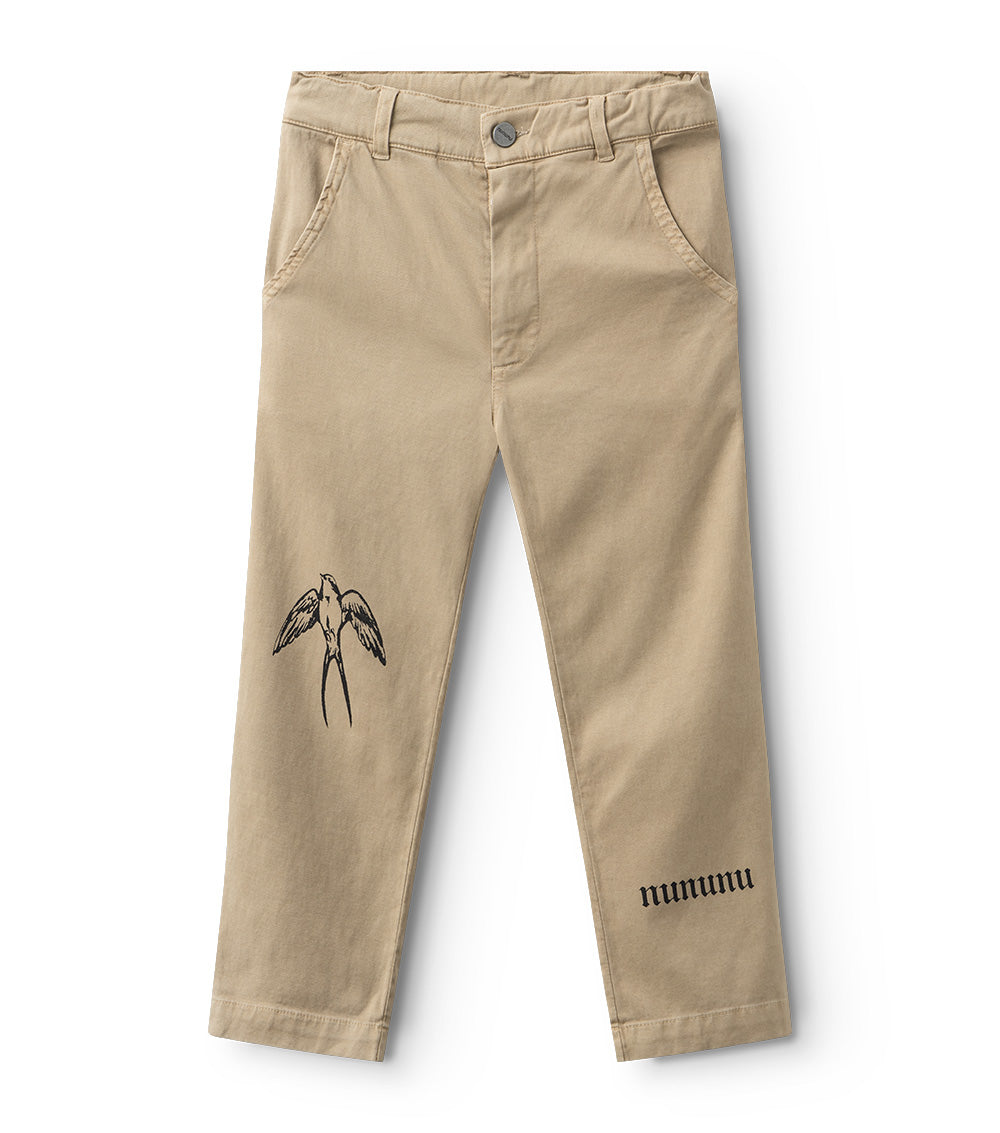 sometimes kids need to get a little bit dressy. so we made some pants to get fancy schmancy in while still keeping it hard core. these gender neutral khaki chino pants have a classic fit but are edged up with tat inspired prints of a soaring songbird and nununu written in inky calligraphy. it’s got a zipper fly & button closure, plus pockets on each side to shove hands into in protest. cuff the bottoms and pair with chucks to make it casual or match it up with a cashmere sweater for that straight up chic look.