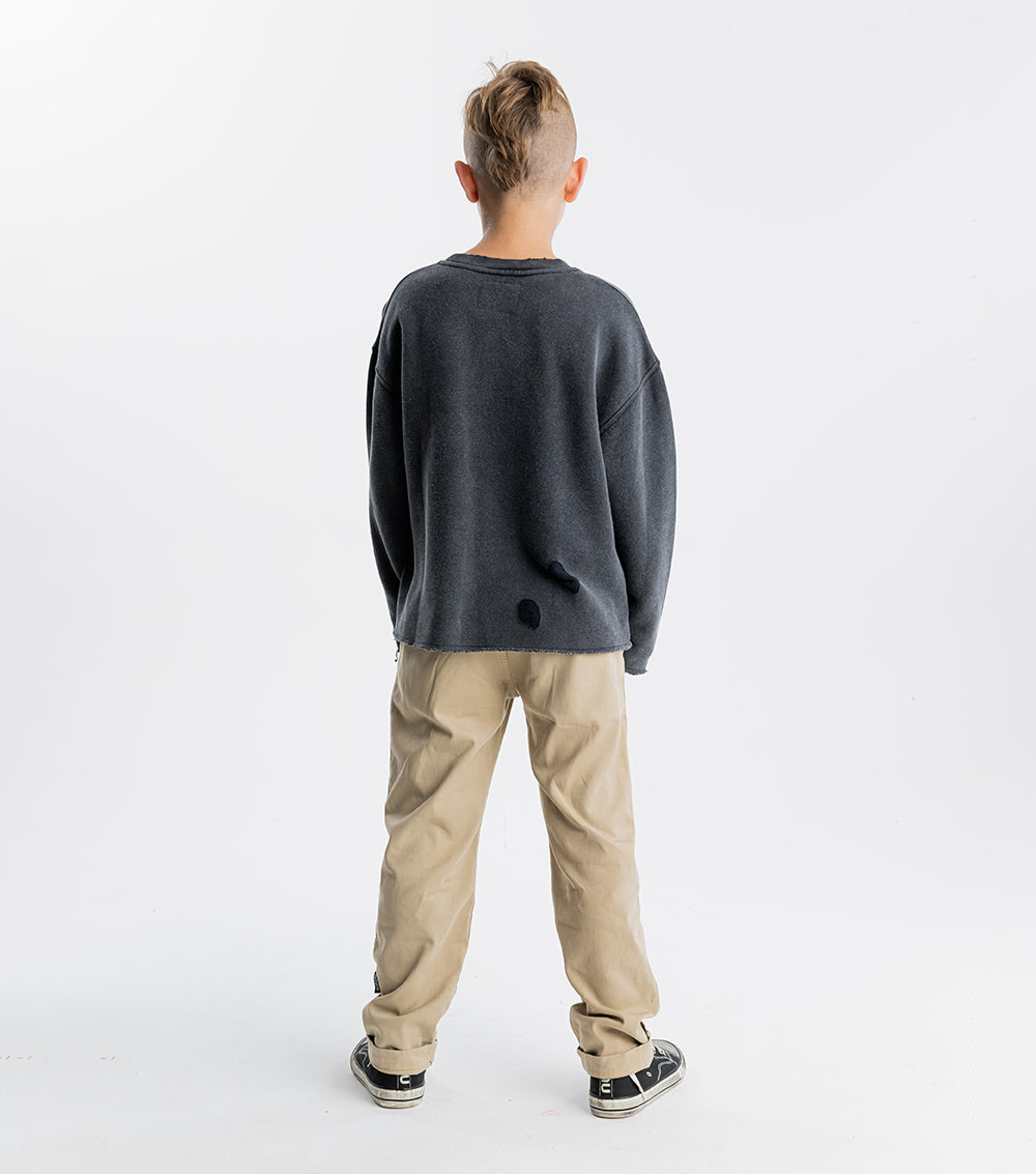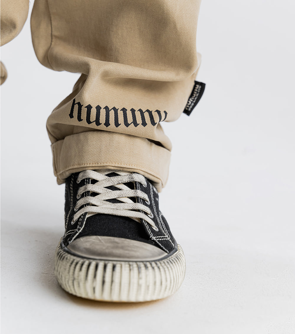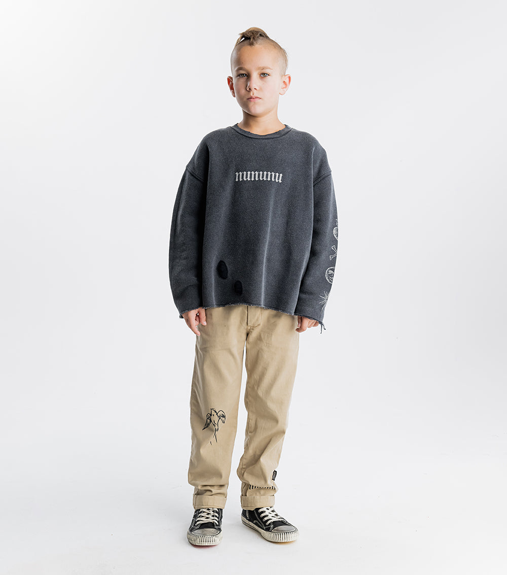 sometimes kids need to get a little bit dressy. so we made some pants to get fancy schmancy in while still keeping it hard core. these gender neutral khaki chino pants have a classic fit but are edged up with tat inspired prints of a soaring songbird and nununu written in inky calligraphy. it’s got a zipper fly & button closure, plus pockets on each side to shove hands into in protest. cuff the bottoms and pair with chucks to make it casual or match it up with a cashmere sweater for that straight up chic look.