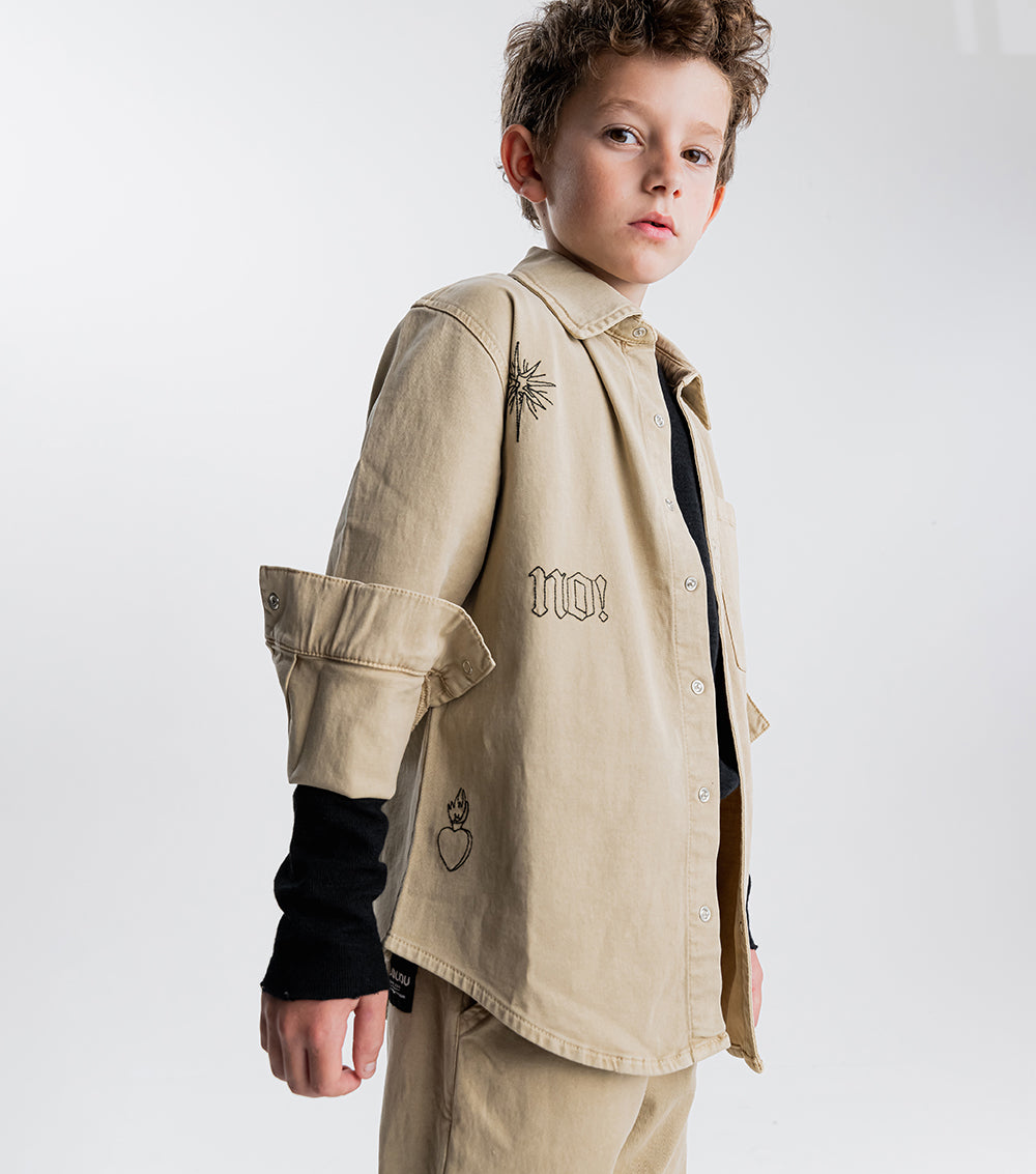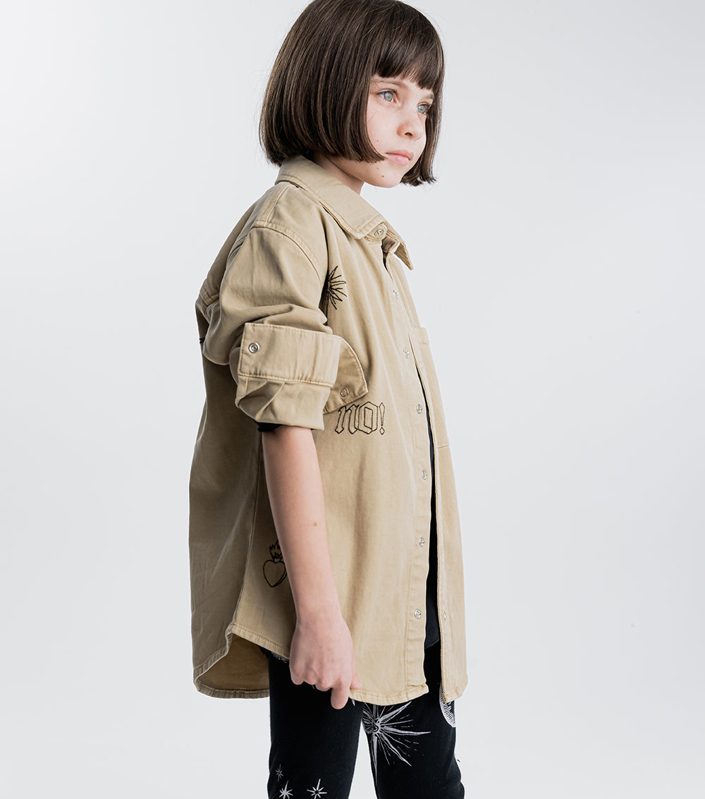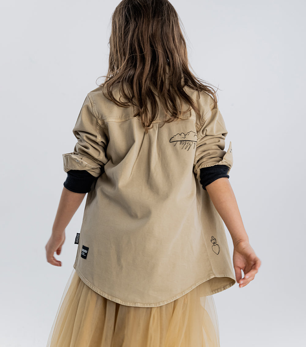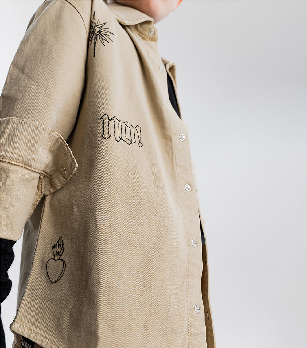 sometimes you just need a piece to throw on over anything and everything and look like an absolute punk. this is the one. it’s a gender-neutral khaki snap shirt but so not basic. it's got all the usual details like snap buttons & cuffs and a collar. to keep it super hard we added black embroidery of the coolest tat classics. crossbones, a flaming heart, a stormy cloud, a shining star, and of course, our favorite word: no! but it gets better. it's got a rounded hem so it wears like a dream and a big old front chest pocket to stick pens in for a smarty pants vibe or hide secret notes about kids taking over the world. whatever they’re feeling that day.