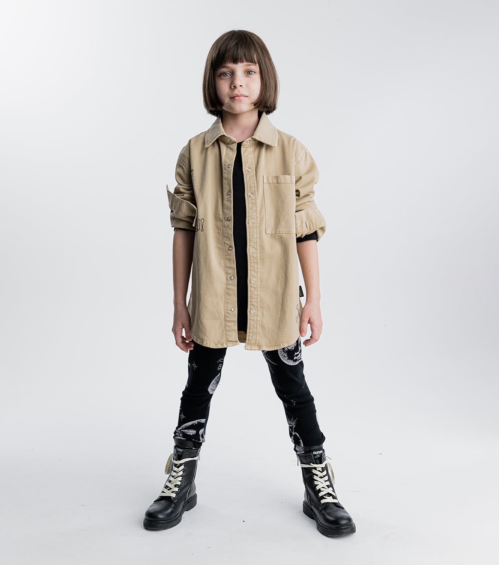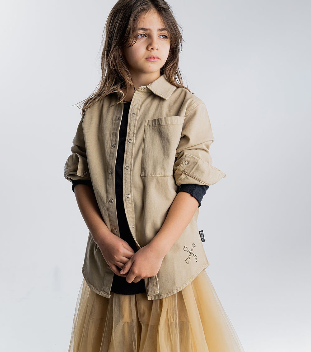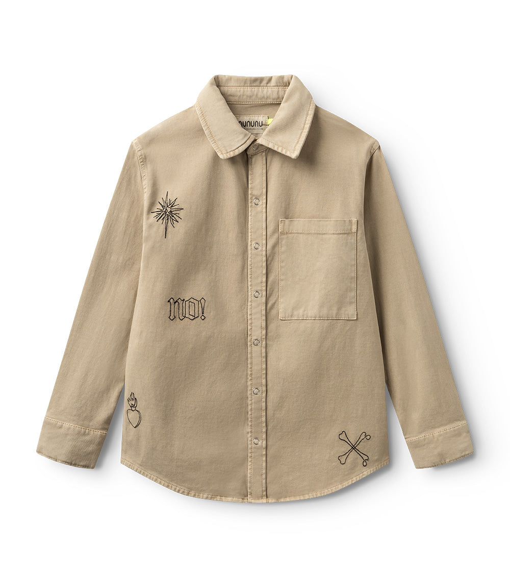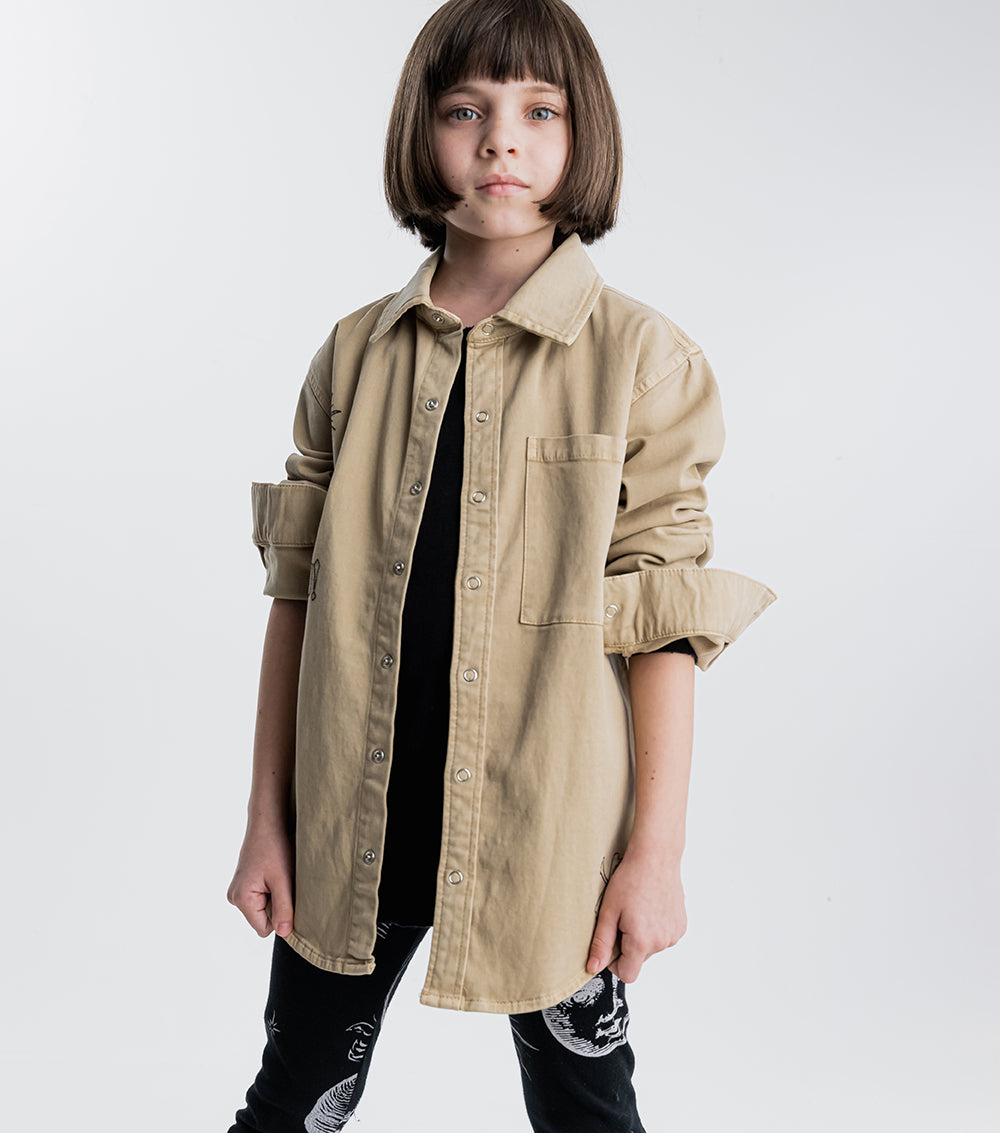 sometimes you just need a piece to throw on over anything and everything and look like an absolute punk. this is the one. it’s a gender-neutral khaki snap shirt but so not basic. it's got all the usual details like snap buttons & cuffs and a collar. to keep it super hard we added black embroidery of the coolest tat classics. crossbones, a flaming heart, a stormy cloud, a shining star, and of course, our favorite word: no! but it gets better. it's got a rounded hem so it wears like a dream and a big old front chest pocket to stick pens in for a smarty pants vibe or hide secret notes about kids taking over the world. whatever they’re feeling that day.