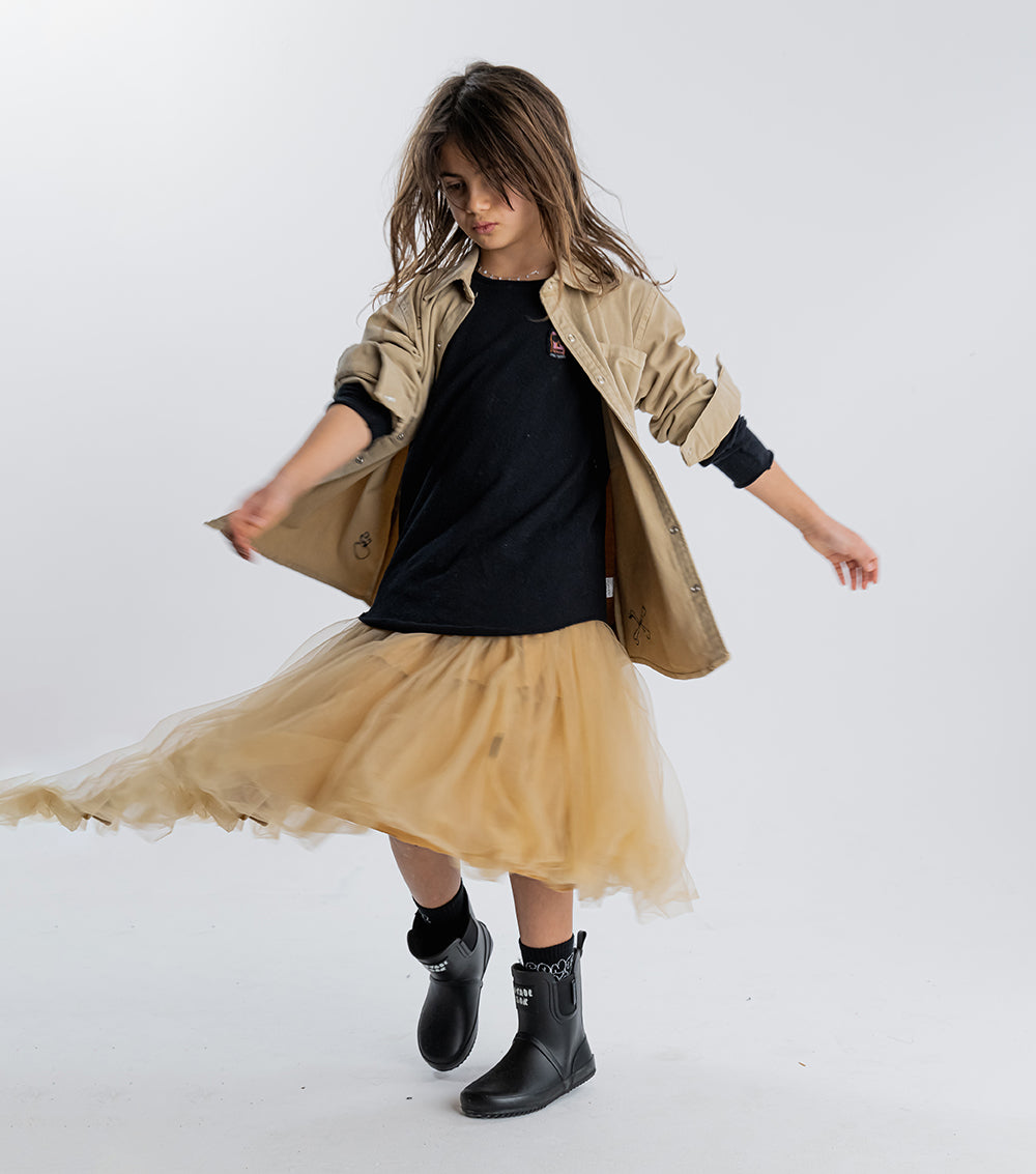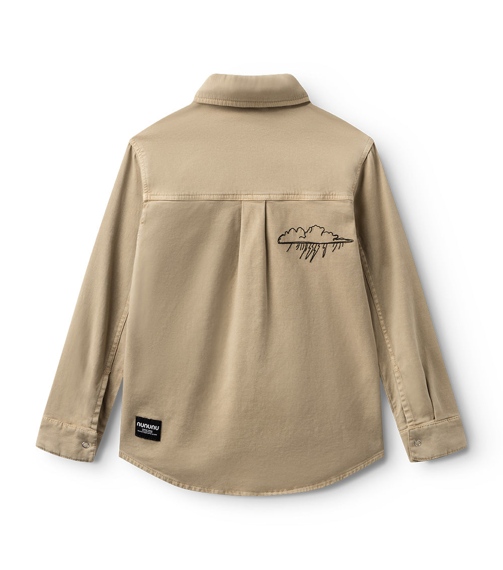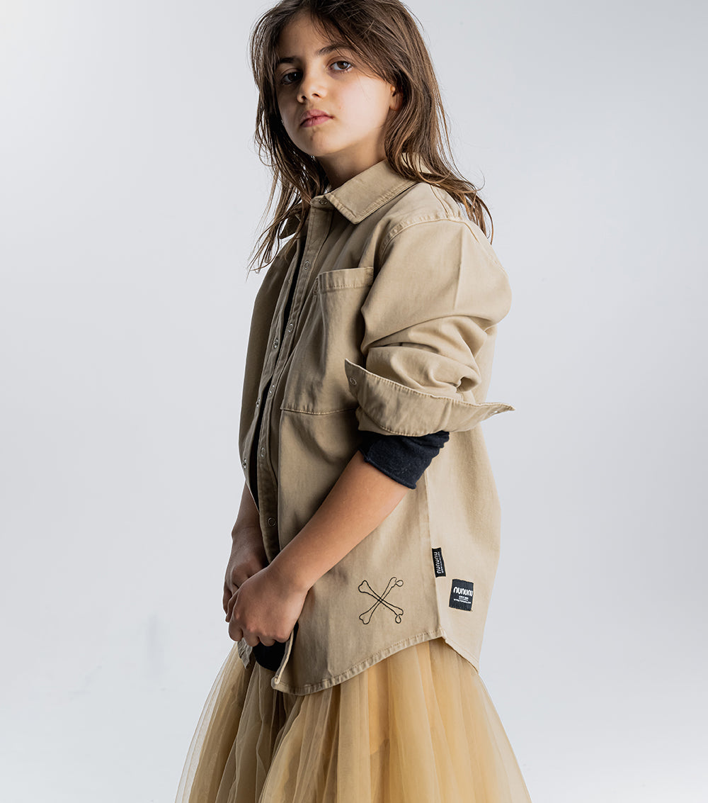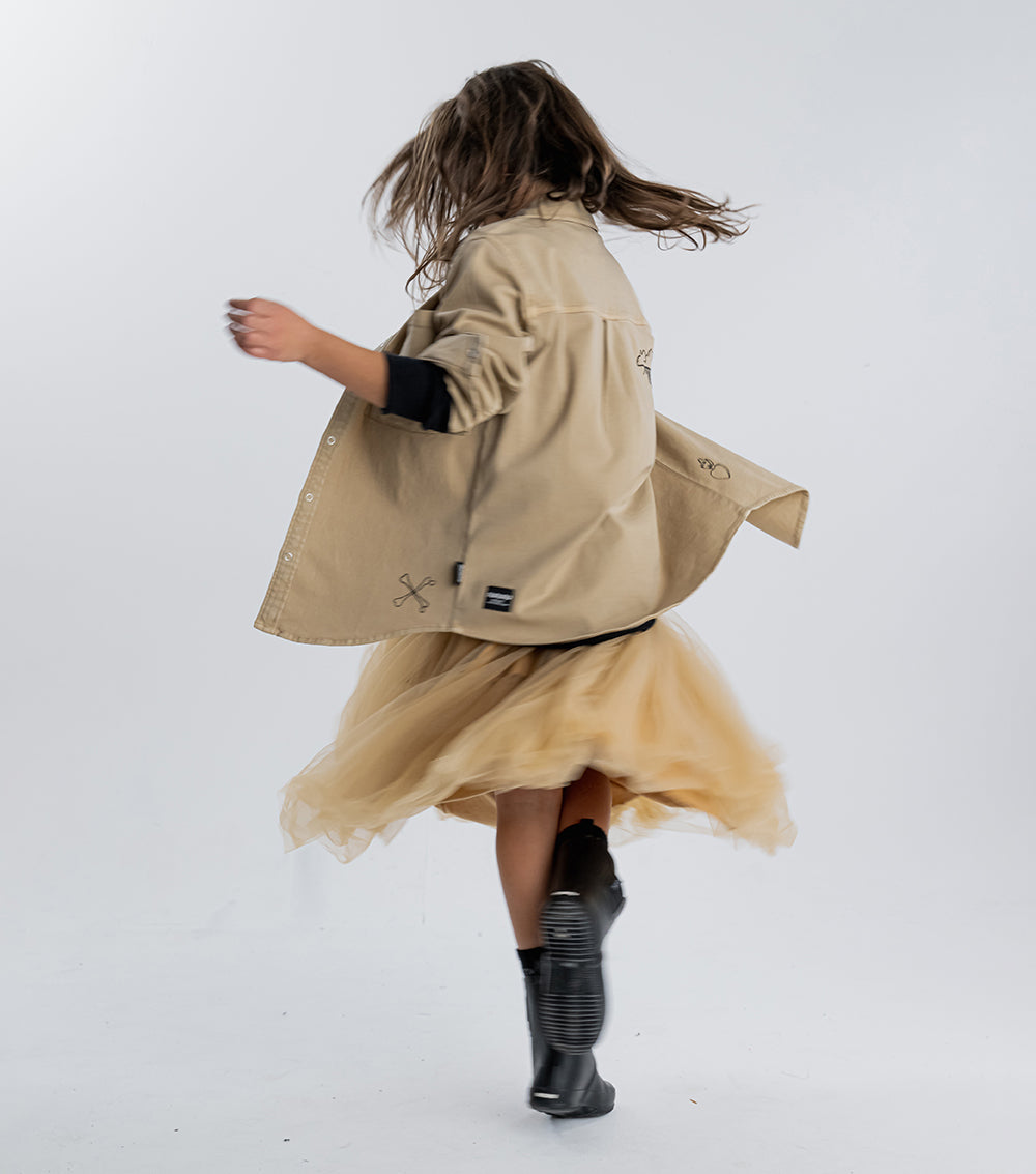 sometimes you just need a piece to throw on over anything and everything and look like an absolute punk. this is the one. it’s a gender-neutral khaki snap shirt but so not basic. it's got all the usual details like snap buttons & cuffs and a collar. to keep it super hard we added black embroidery of the coolest tat classics. crossbones, a flaming heart, a stormy cloud, a shining star, and of course, our favorite word: no! but it gets better. it's got a rounded hem so it wears like a dream and a big old front chest pocket to stick pens in for a smarty pants vibe or hide secret notes about kids taking over the world. whatever they’re feeling that day.