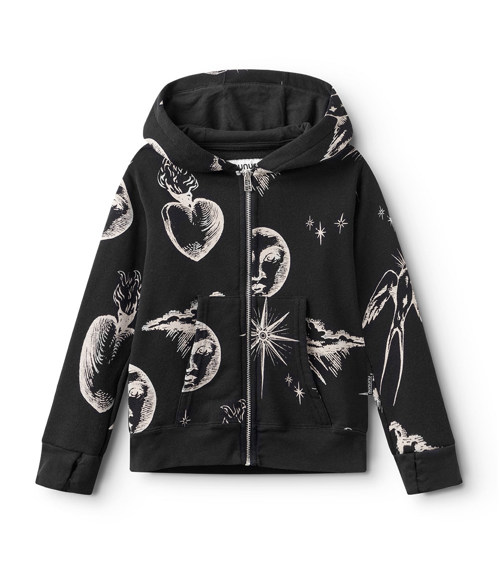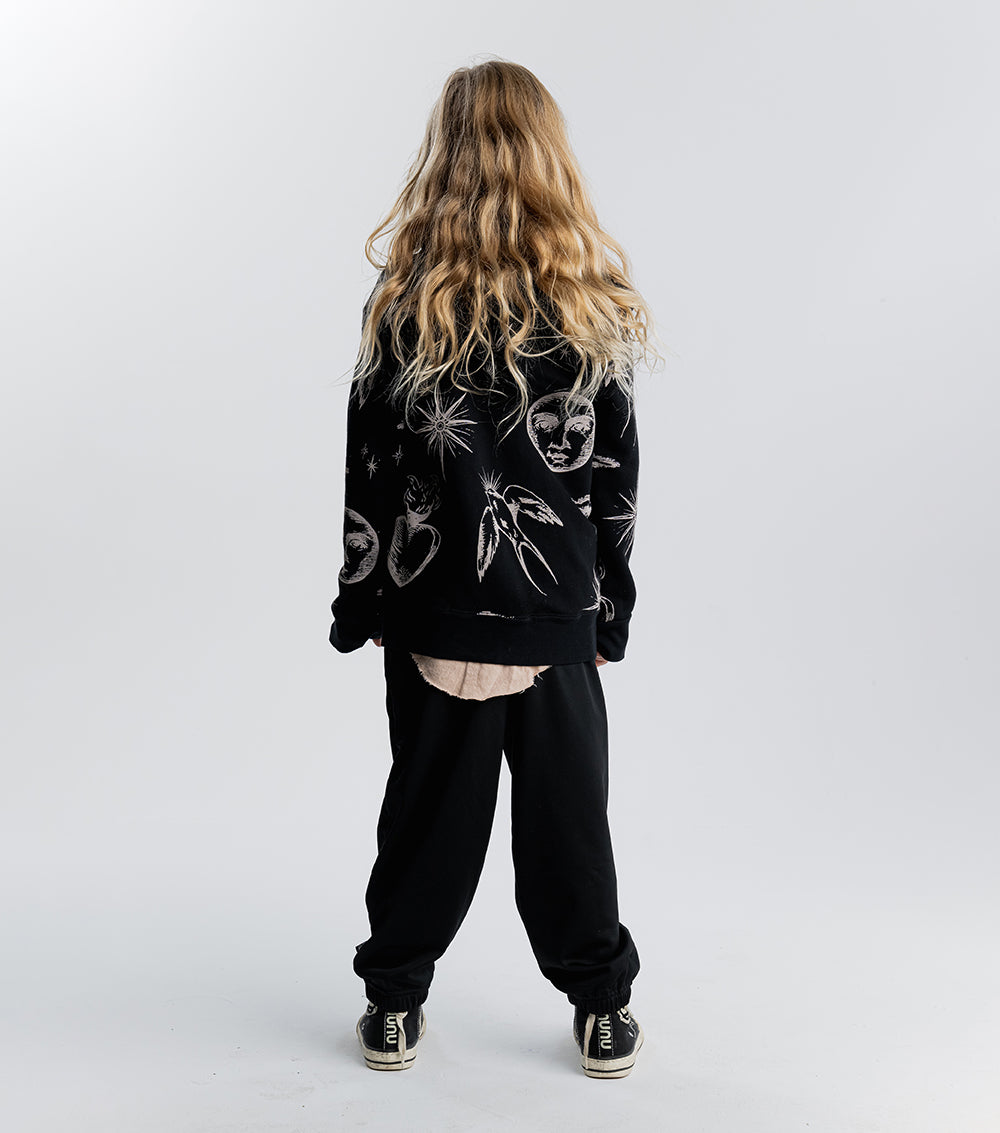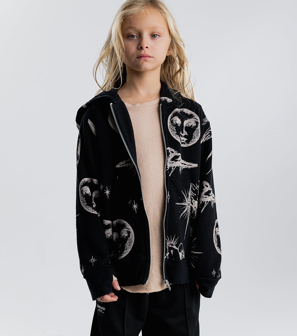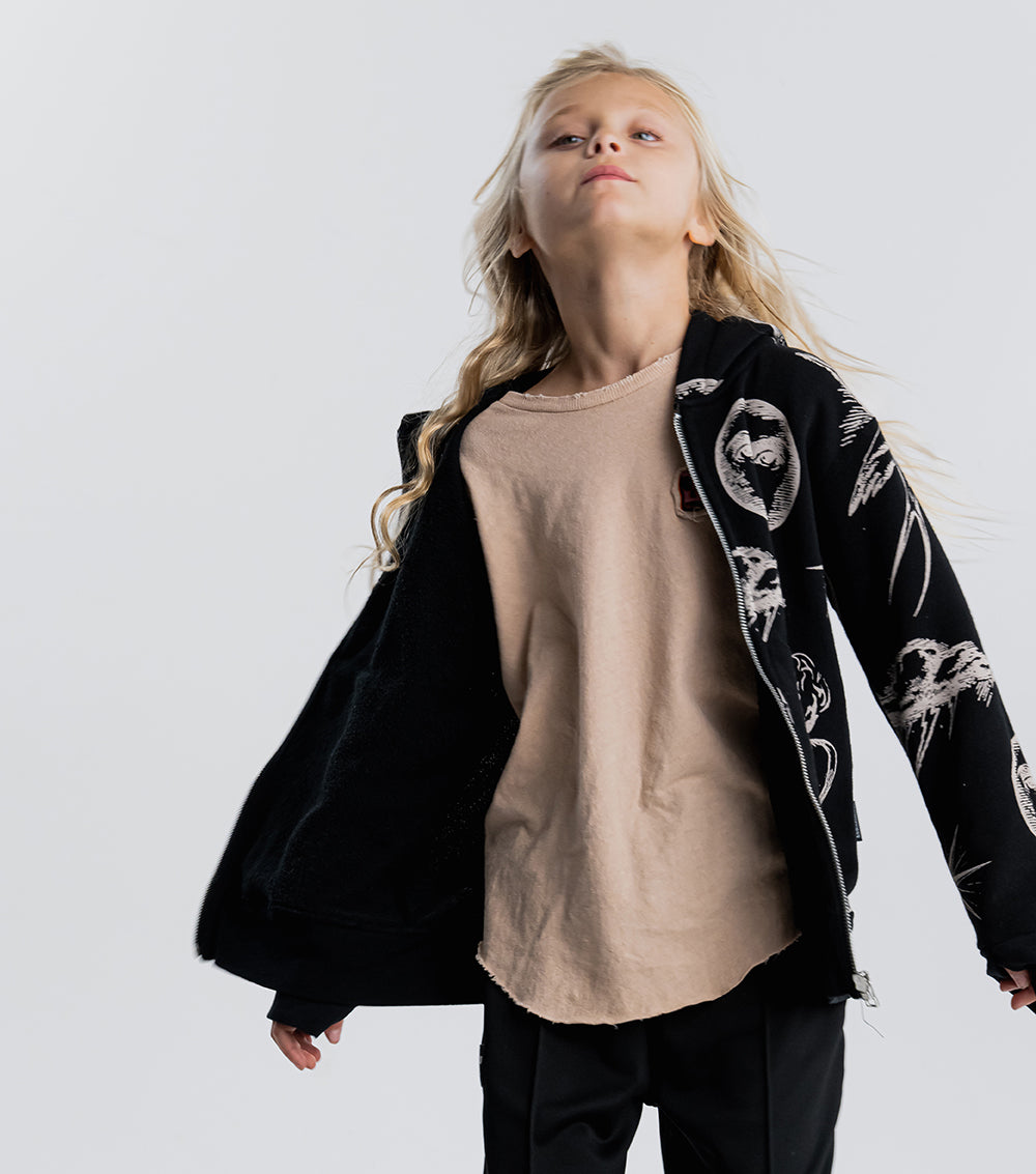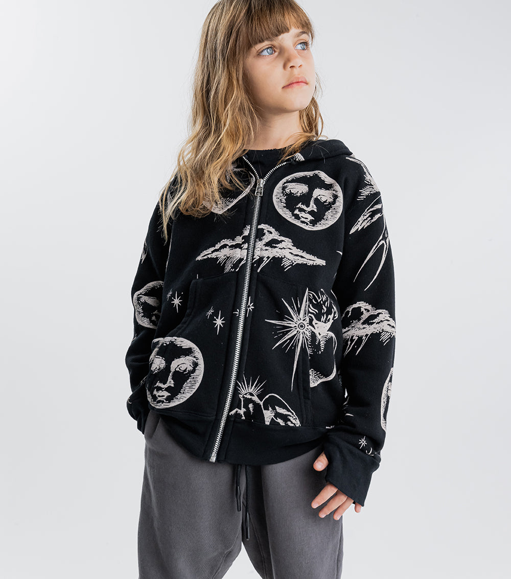 get your kid their very own showcase with this classic nununu slouchy black gender neutral hoodie, with an all over print that looks tatted on. the hood is just a little bigger than it should be, and we are here for it. it’s got a full zip splitting two side pockets to keep your tiny apprentice’s hands warm. while it looks super hard, it’s made of super cozy french terry. so it’s like a second skin, but better.