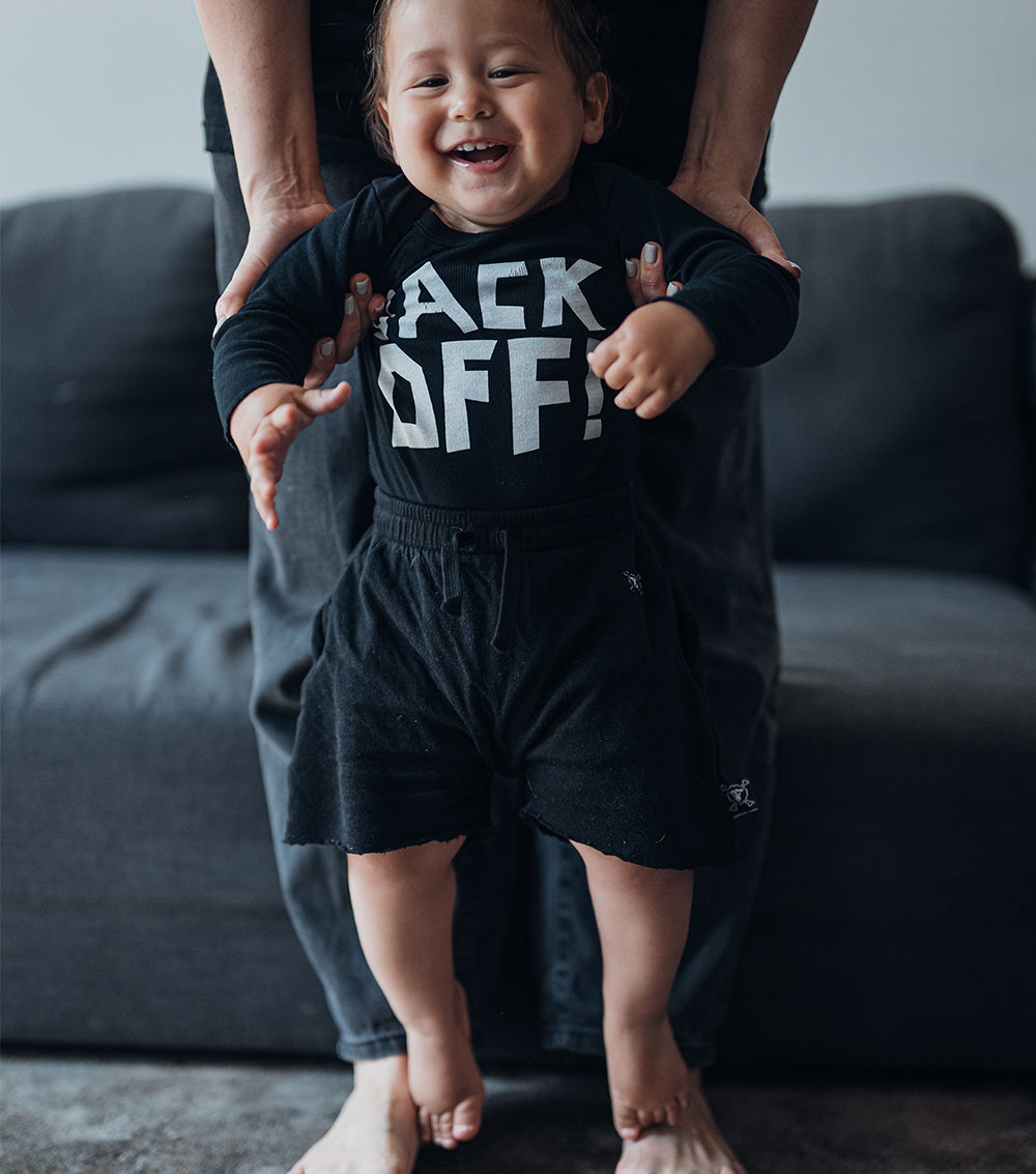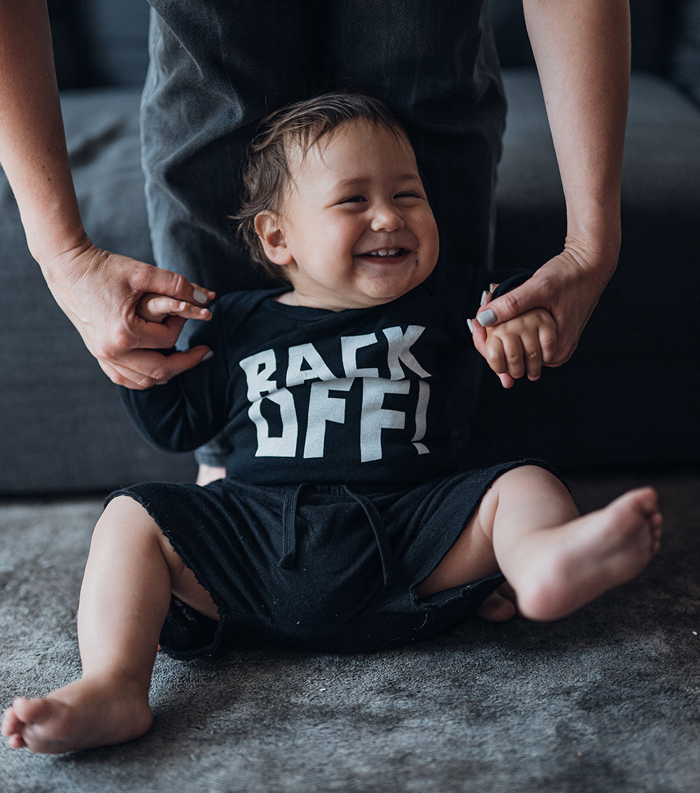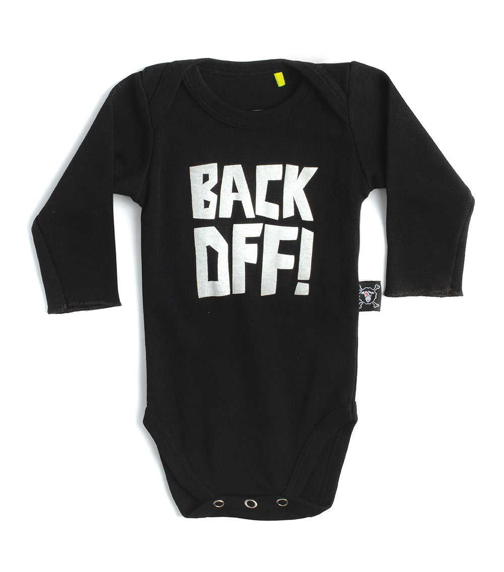 a wardrobe staple for the smallest person you know. this black baby onesie features an extra wide neckline & crotch snaps make this unisex piece functional. on the chest, it screams “back off!” in big, loud block letters—okay, fair warning.