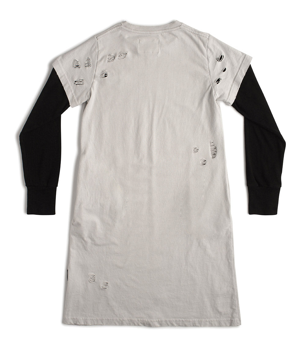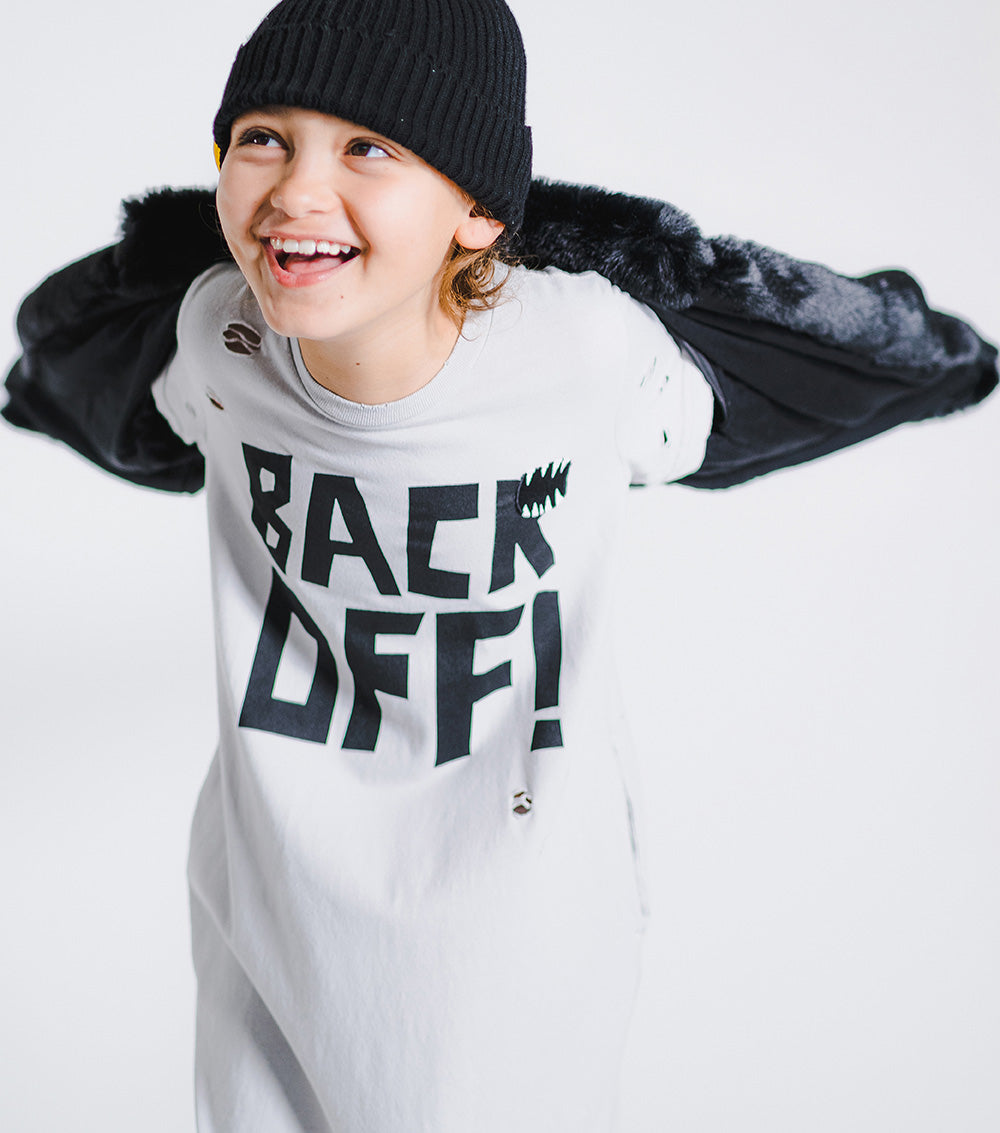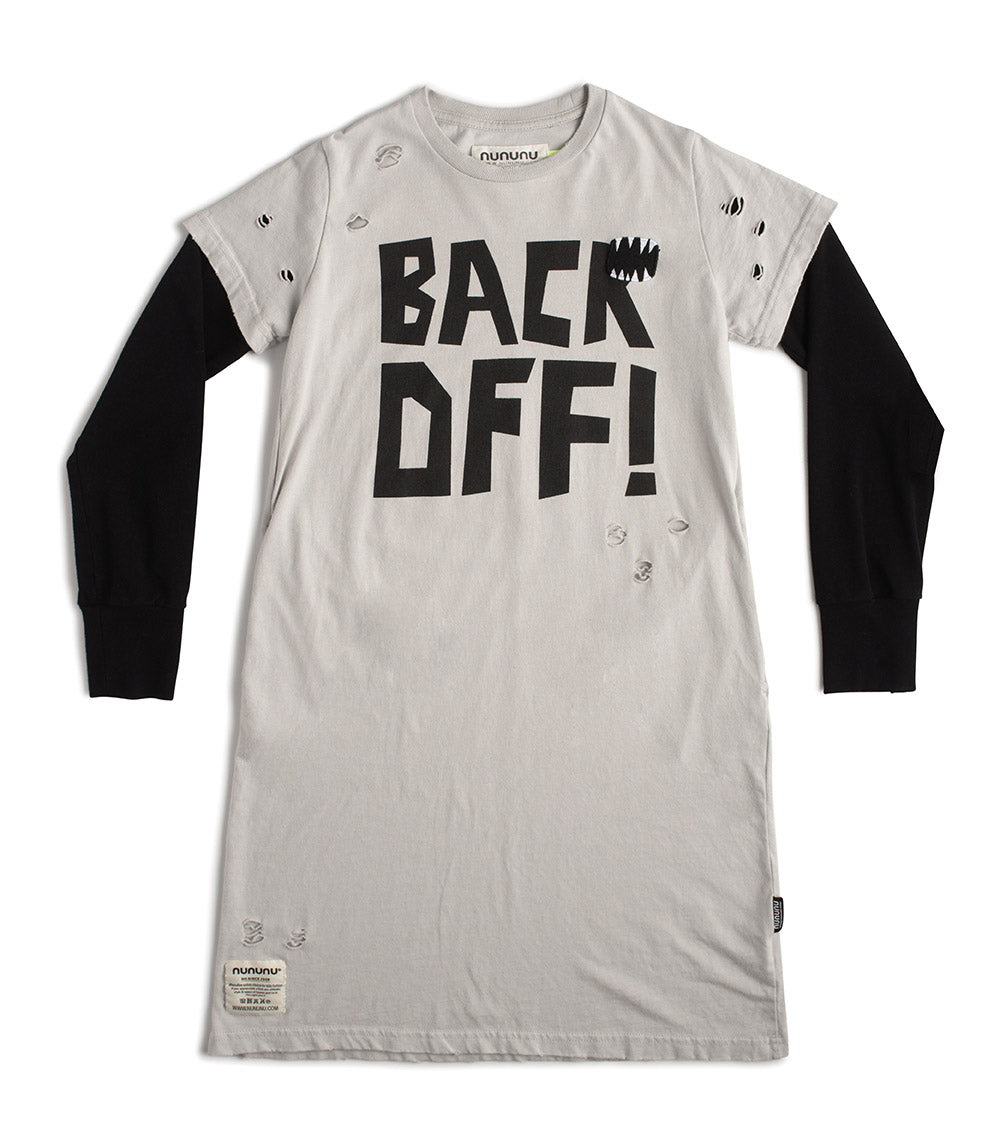 hey, look what the cat dragged in! the back-alley look is what we’re going for here, with the crazy custom made holes all over this amazing fall t-shirt dress in ice gray. a slim-yet-relaxed shape keeps the silhouette chic, with the layered sleeves of a grunge-rock god. “back off!” it screams in big, loud block letters—okay, fair warning. our “roar” patch at the chest is the perfect finishing touch.