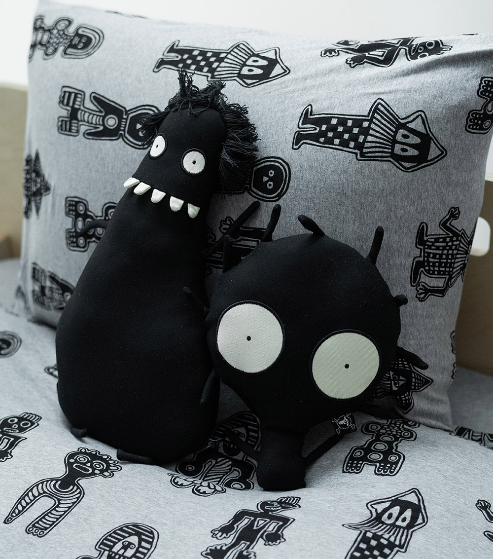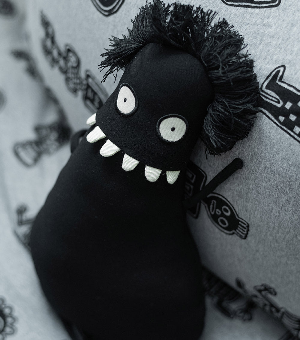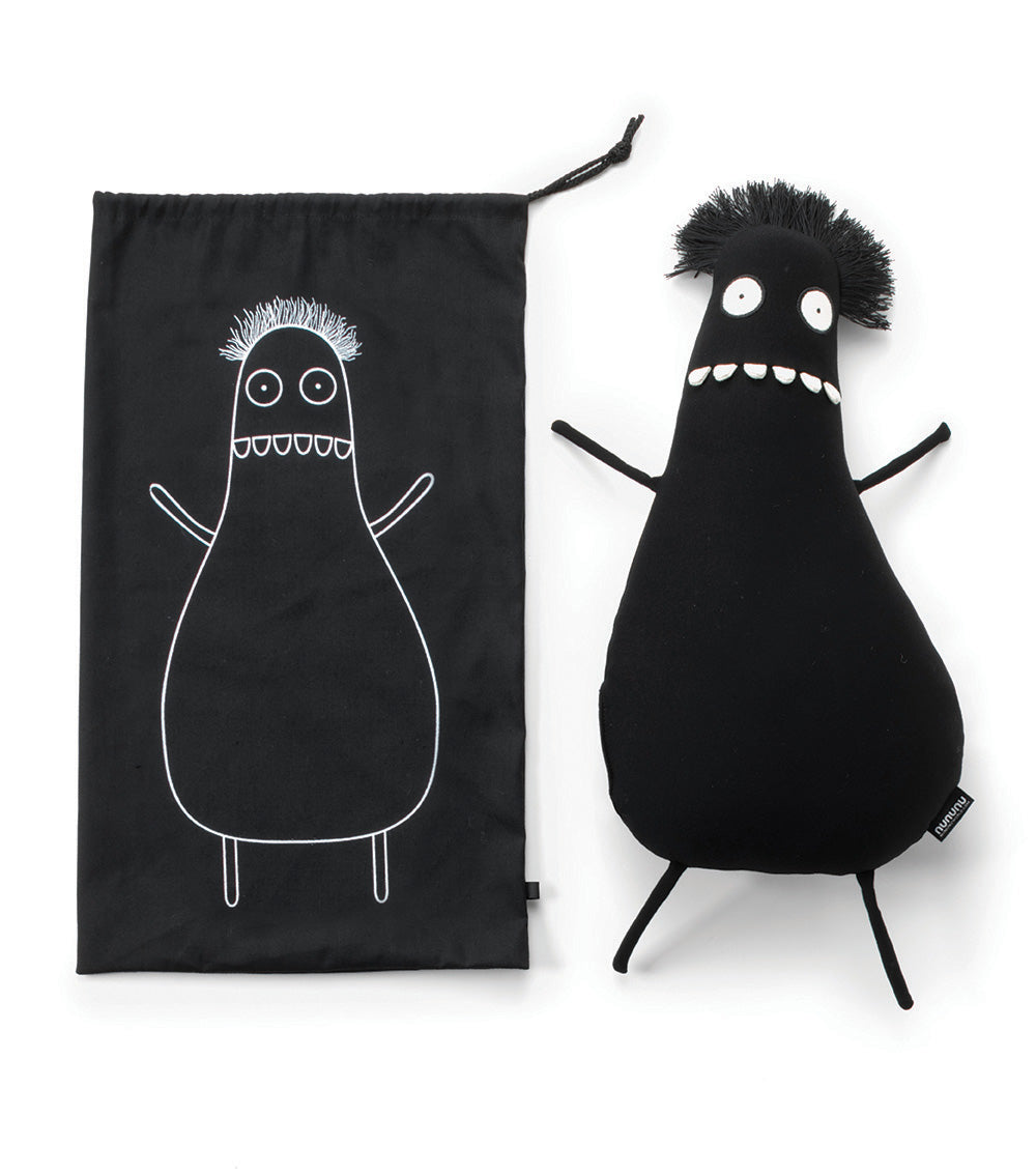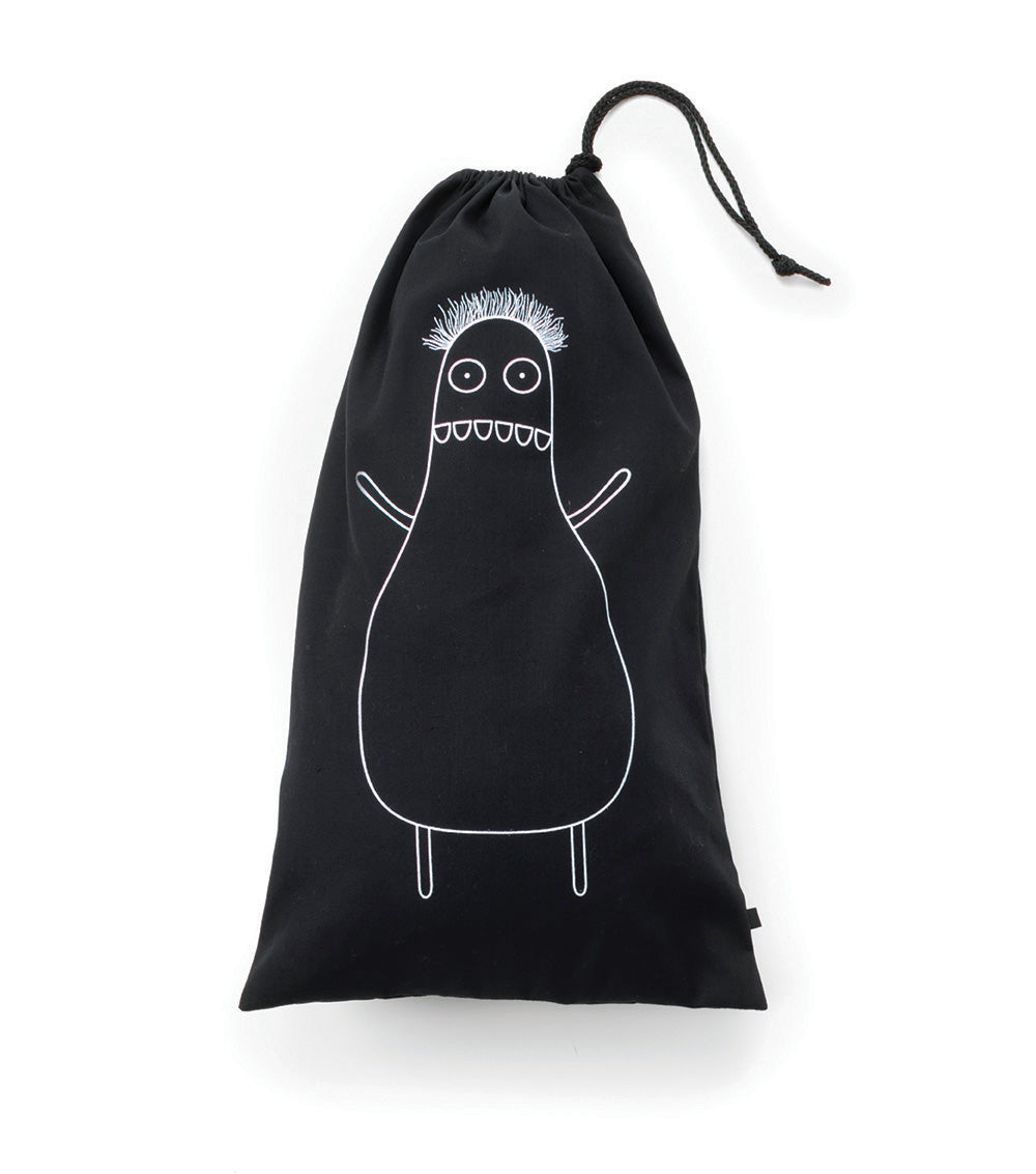 a little blob with a lot more to offer. this belly doll is your spooky cool companion to the park, to shriek angst that would make your parents mad, and to have a friend when no one else understands. comes in a black printed linen case. This doll is the outcome of a collaboration with artist Miki Ohana aka “wild tailor” whose art reflects innocence mixed with a sense of rebelliousness, very much like the nununu spirit and vibe. Both miki and nununu convey in their message an unusual world of images that celebrate all that is different, unconventional and mainly not mainstream. This doll is the perfect representation of all that and is a voice to all that are different and like it!