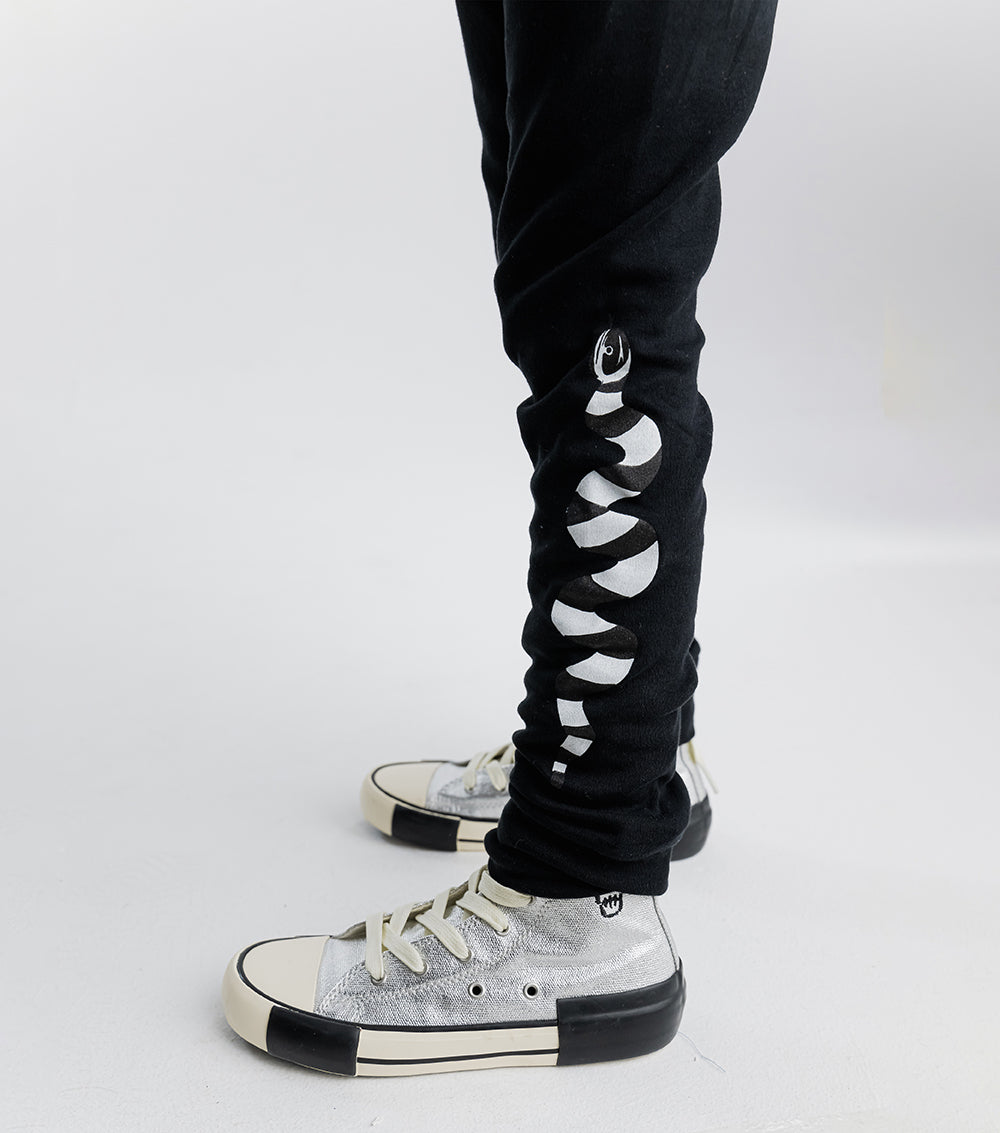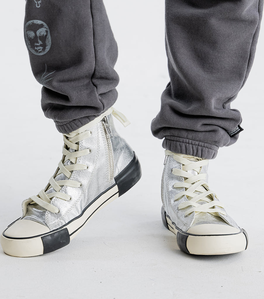 grab your shades because these shoes are shining bright on the boys & girls who wear them. the outside is made of a silver foil material that is designed to deconstruct, for a one of a kind pair of kicks. complete with a slightly angry embroidered black skull to offset the sweet with just a little bit of scary. to up the edge, the sole has got black strips that look like masking tape for a bolder, grungier look. the laces are totally functional, but we’ve installed these genius zippers at the inside ankles, so they can slip these on and off with ease.