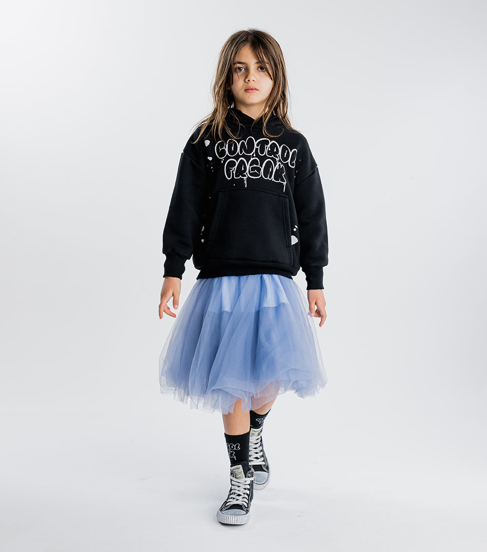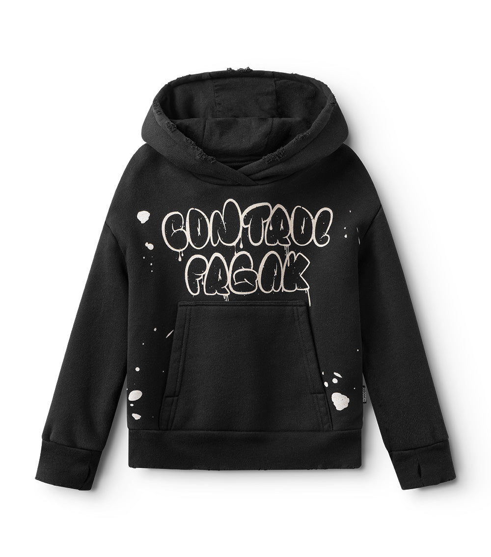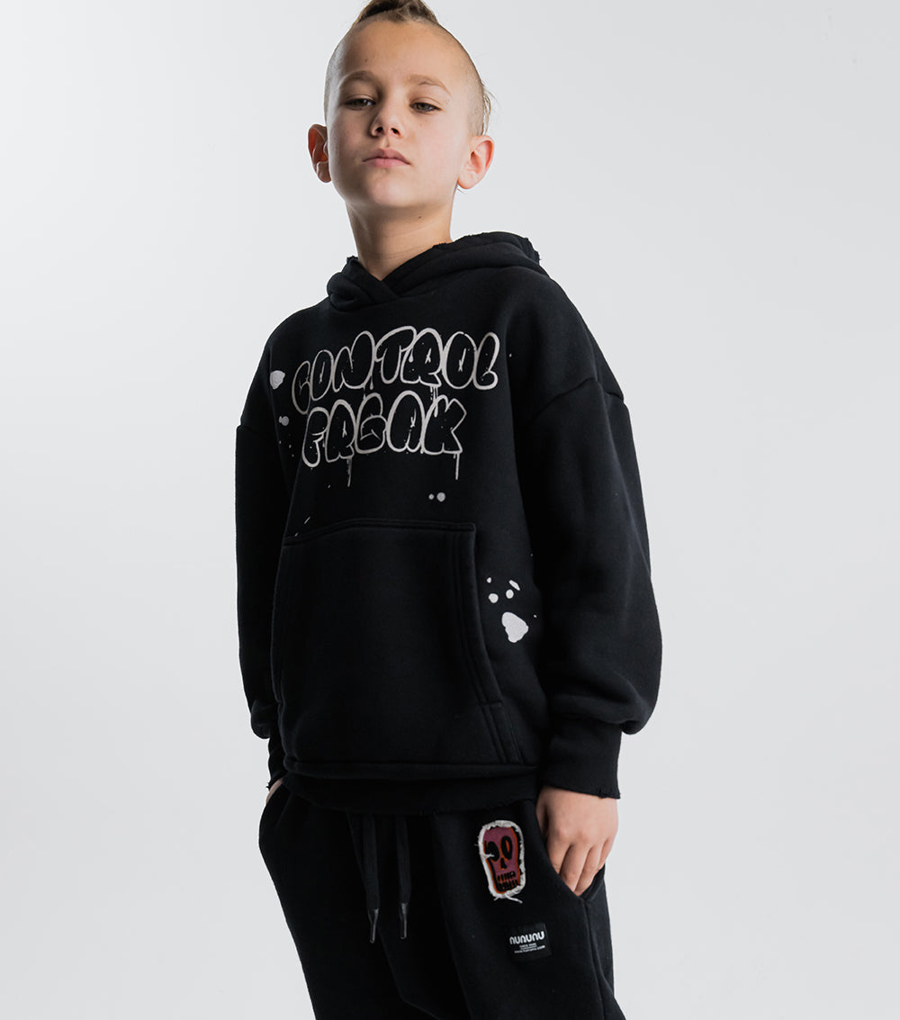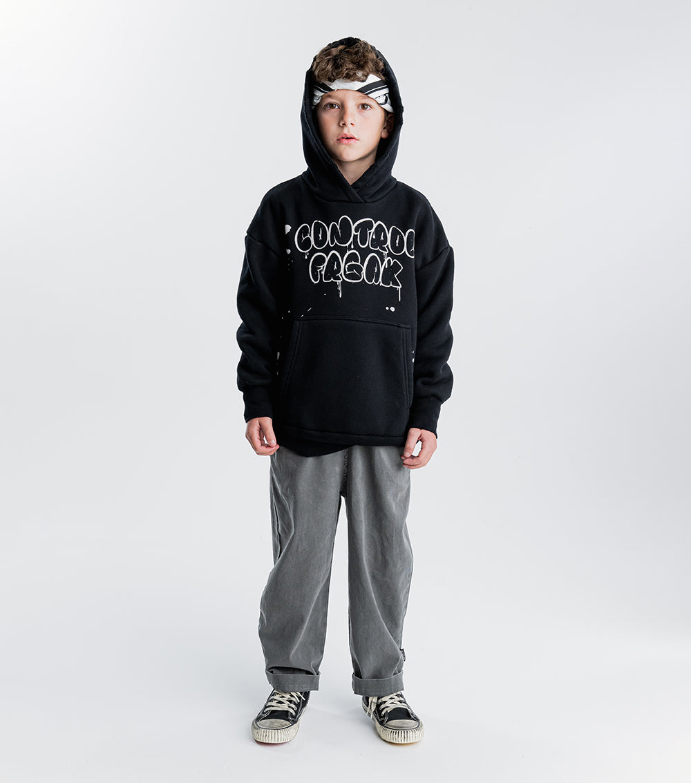 a unisex black hoodie should be in every cool kid's closet. so check out the major upgrade we added to this must have basic. it’s heavy french terry so not only is it too cozy for words, it's also super warm and it’s got a little bit of extra weight so it feels like a soft comforter you can wear up on your shoulders. to make it feel even sleepier, we got that big old hood & giant kangaroo pocket up front. this way too cool print is splashed like wet paint, graffiti-style on the chest and practically dripping off. obviously it says control freak in big letters because that’s clearly your kid’s m.o.
