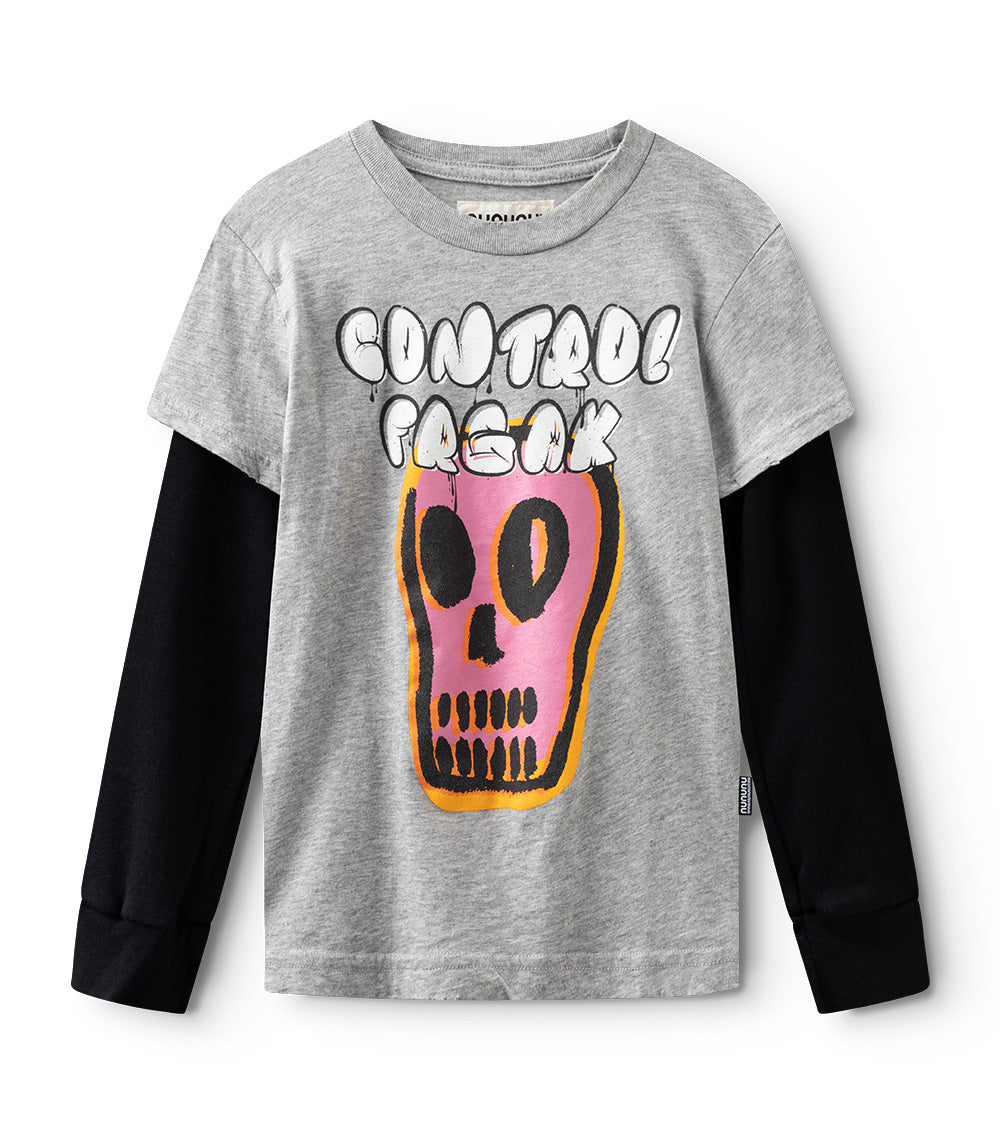 this unisex heather grey twofer has got a bubbly dizzy vibe about it. created by artist shay id alony, control freak is splashed across the chest just so no one forgets who rules the school. made of a light single cotton that couldn't be comfier. the vibrant skull is throwing out those wired-tired-fired up vibes — perfect to match that moody monday morning energy.