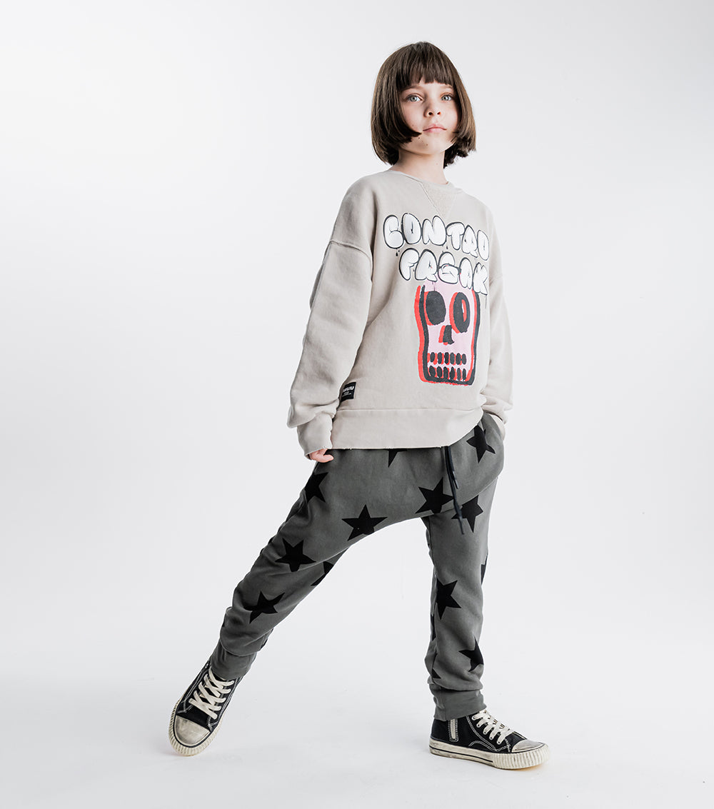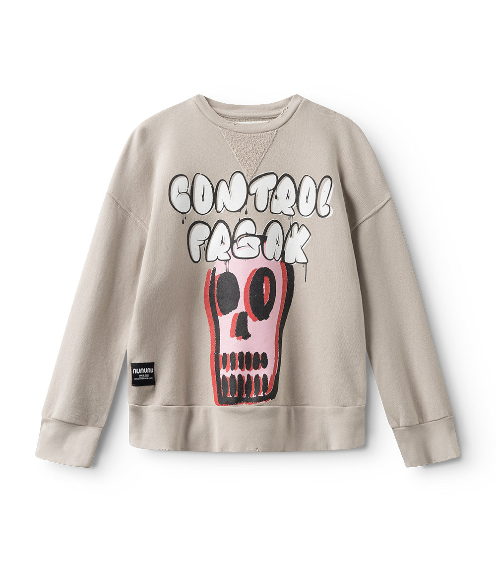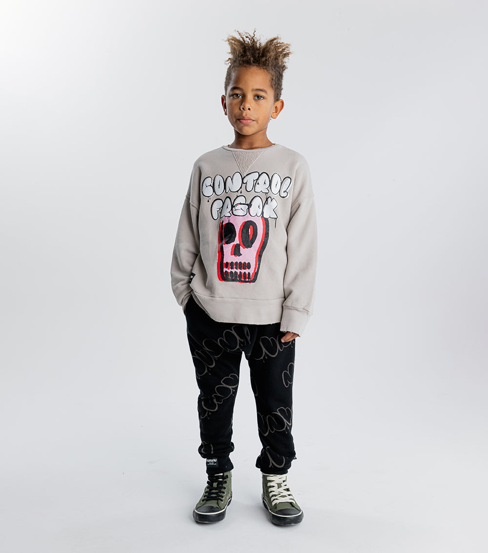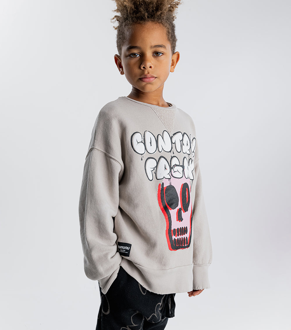 when your kid doesn't want to be told what to wear… pretty much every day… this bubbly dizzy skull sweatshirt is the thing they will consistently want to grab. it’s got control freak written in big dripping letters and to add that extra emphasis this print is practically popping off this smokey grey gender neutral hoodie. love? same. the print was created in collab with artist shay id alony so it’s cooler than ever. it’s a relaxed lazy day crewneck with hip kid thumb holes, dropped shoulder seams, and custom hem deconstructions. it’s made of ultra cozy french terry so your control freak will probably refuse to take it off. but it's so slick you probably won't care.