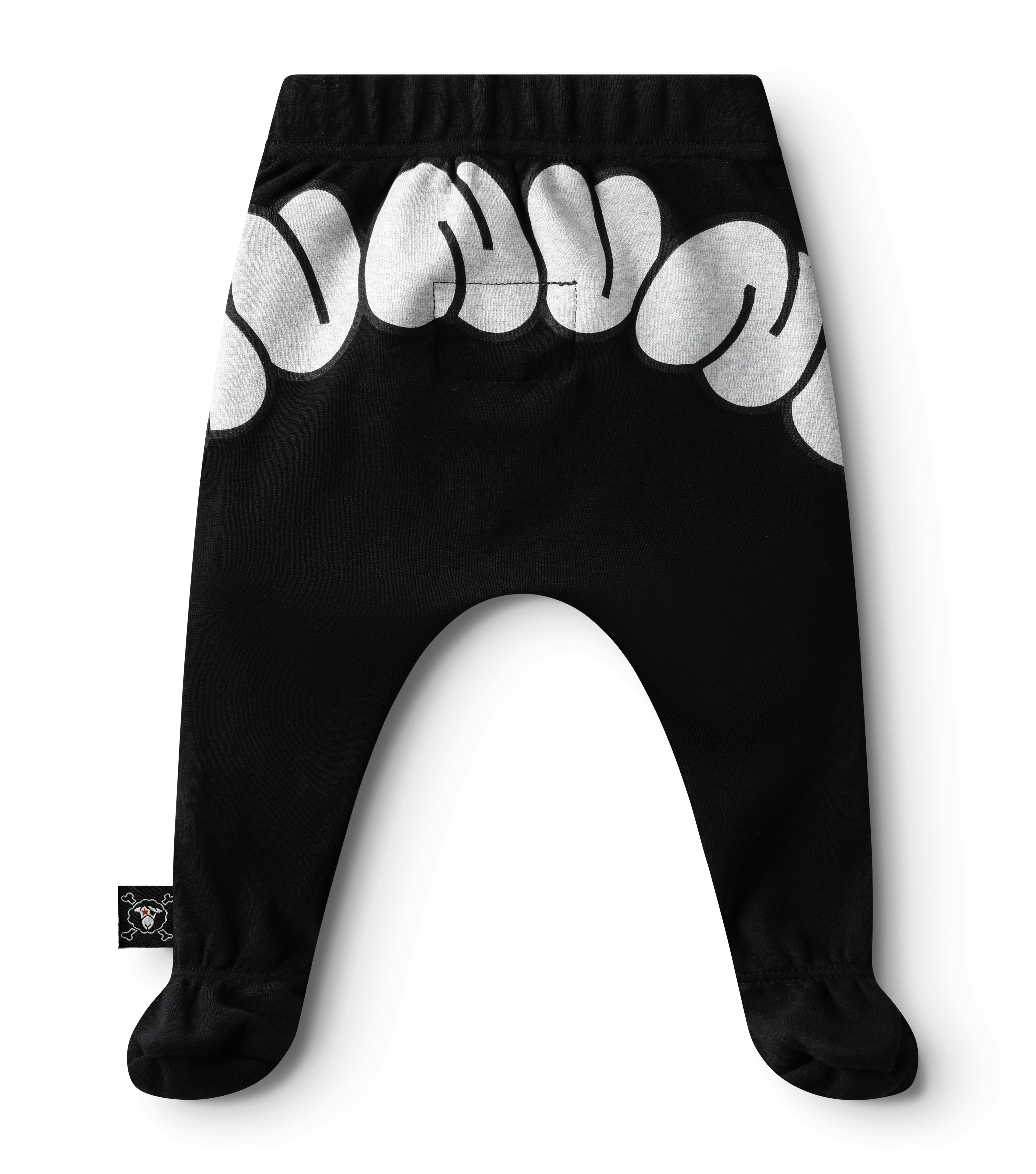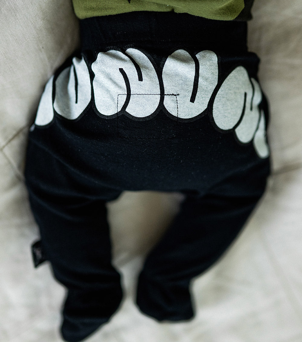 footed pants? yes please. this gender-neutral fit is made of extra soft black fine rib and has a super comfy cinched elastic waistband & sly little pockets. it’s got a low crotch with plenty of space for diapers & moving around. plus, it can take all the crawling your baby pleases, so you can see the big & bold, bubbly logo right on the bum that looks like a balloon ready to pop. because you know they’re already the life of the party.