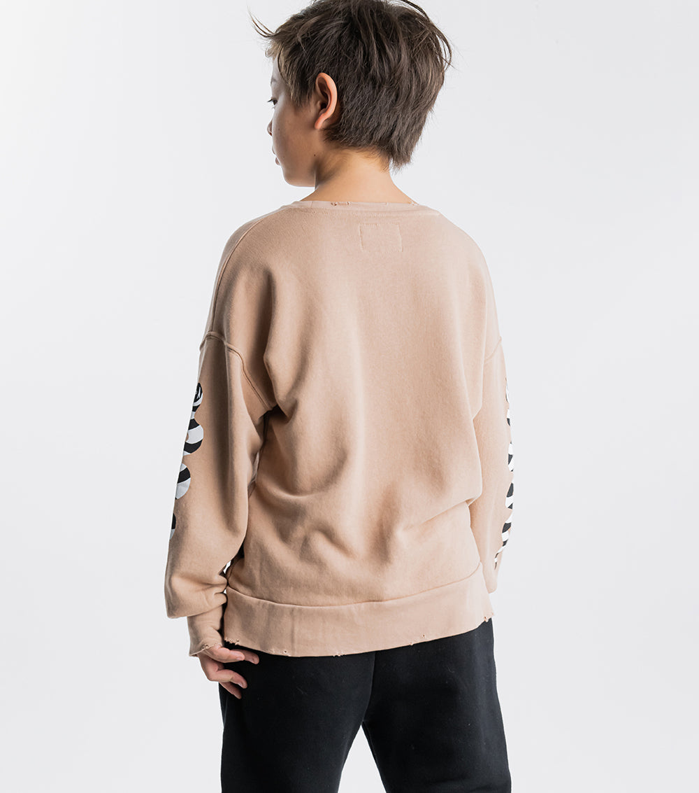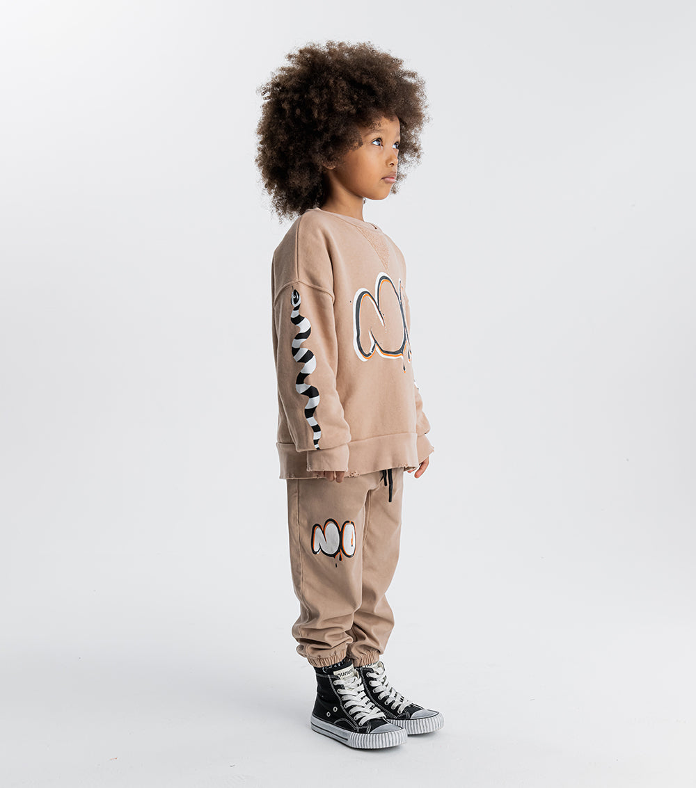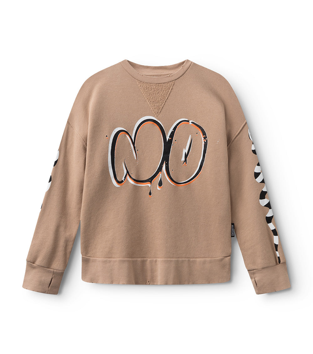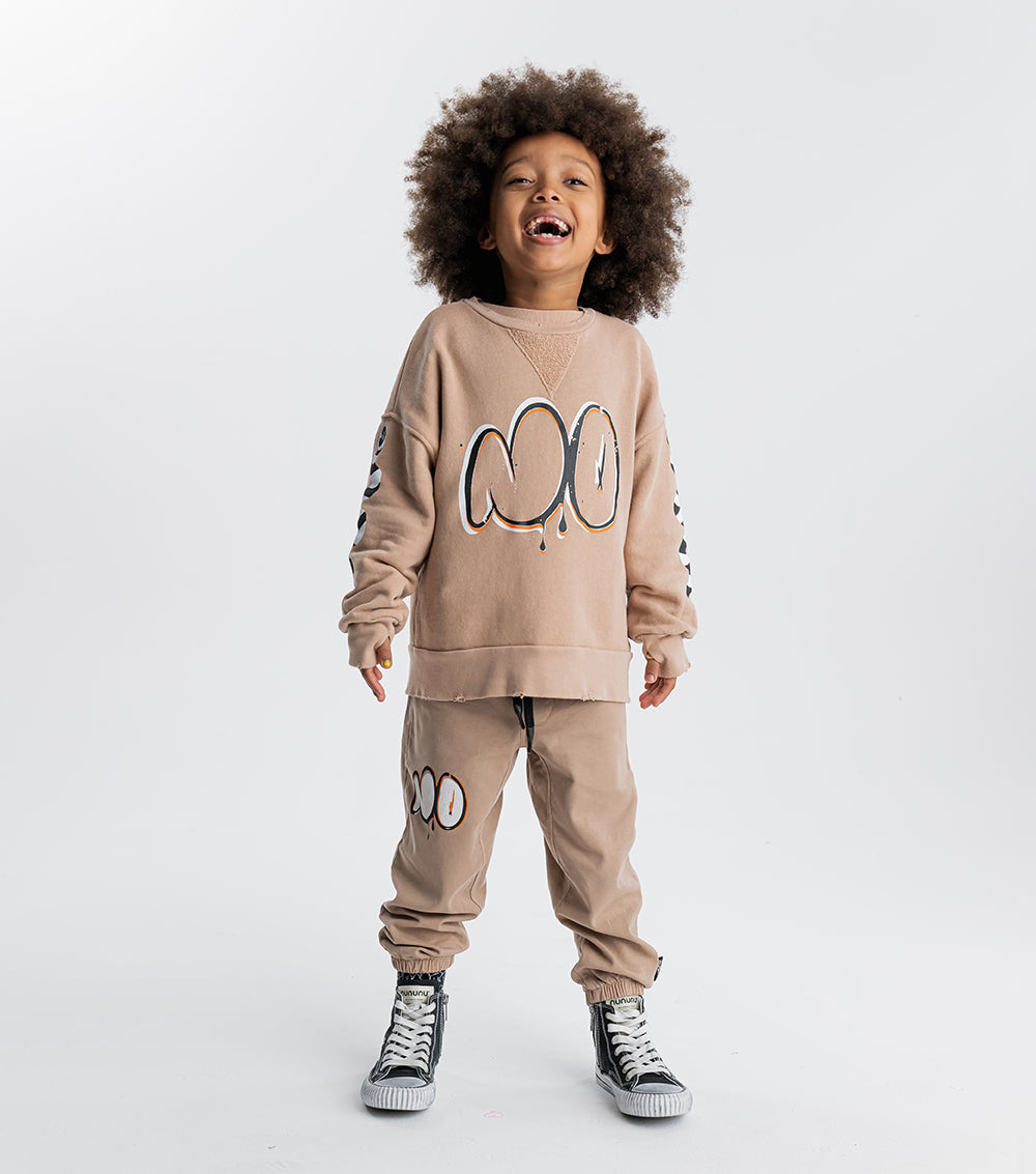 because no is our favorite word, we’ve got it blaring across this classic coffee nununu cut sweatshirt as loud as it can get. it’s dripping with sass from the graffiti print, custom deconstruction, and snakes on both sleeves. but don’t worry, these vipers don’t bite. the gender neutral sweatshirt also features a slight hi-lo hem and cool-kid thumb holes to give off some rebellious energy. will your little rebel want to take it off? Hell no!