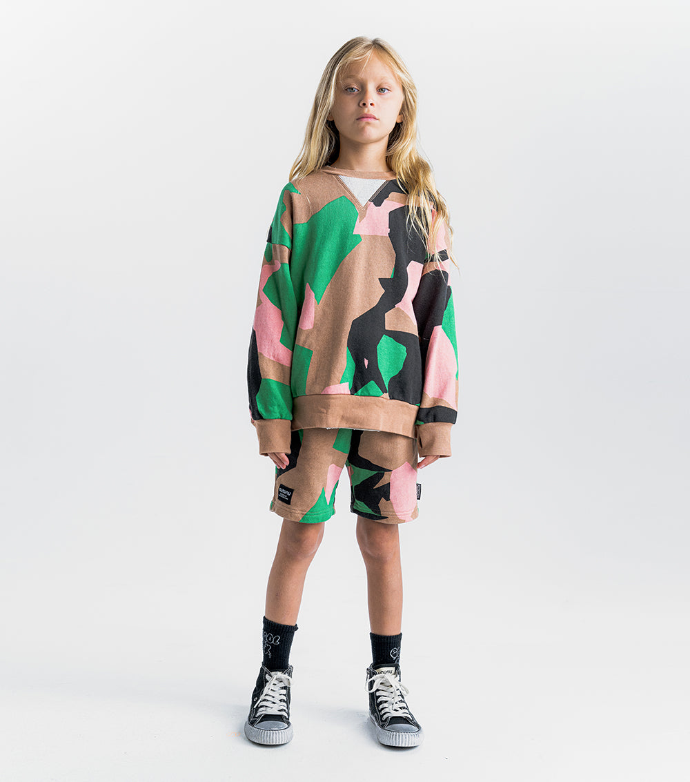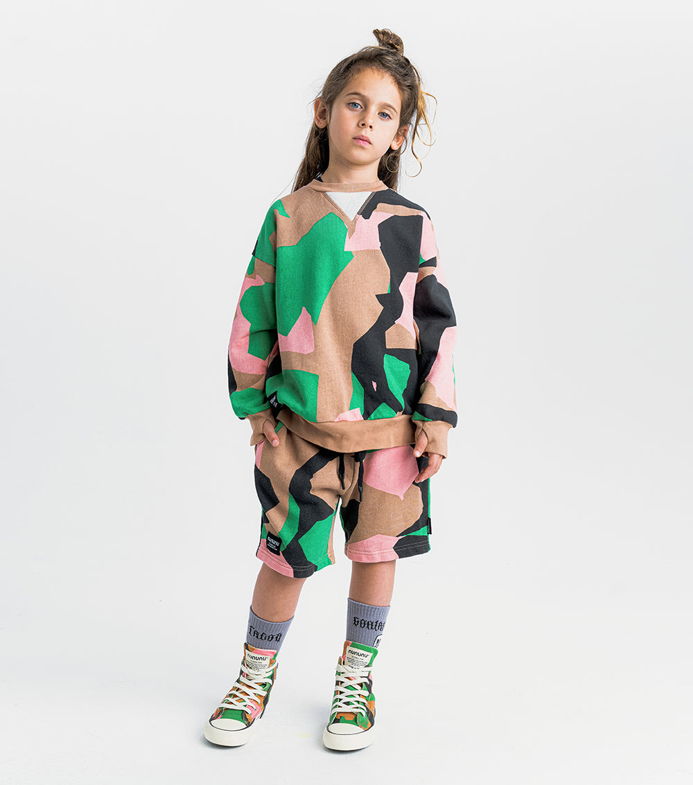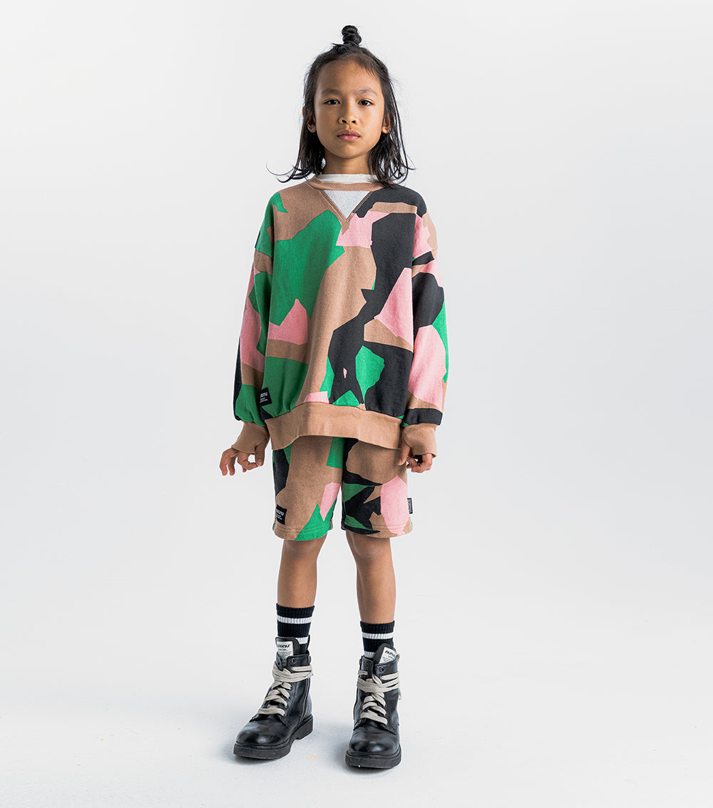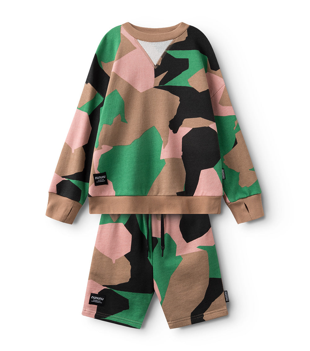 is it time to take over the earth yet or just play all over it? your kid will be ready for either in this super cozy french terry set, a classic nununu unisex cut complete with our cool kid thumbholes. this design has got all the earthy colors with bold pink & sleek black mixed in for our creative take on camo. since standing out is kinda our whole thing, we’ve got a grey triangle neckline detail that does just that, making the piece look extra oversized & comfy. the shorts have got classic & clean hemlines, hidden side pockets, and a black drawstring that keeps them up. ideal for when the kid wearing this set is running wild & free on early summer days or late summer nights.