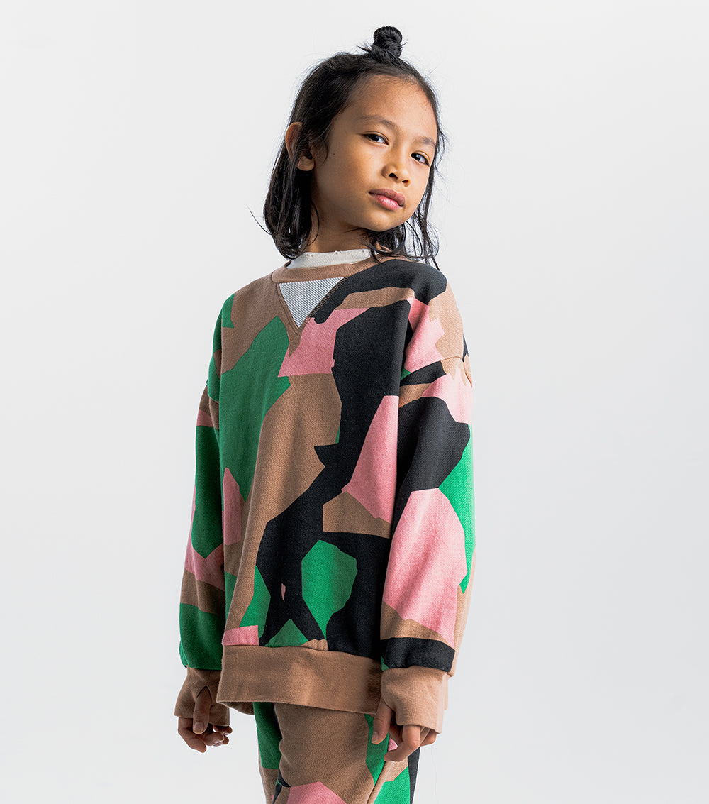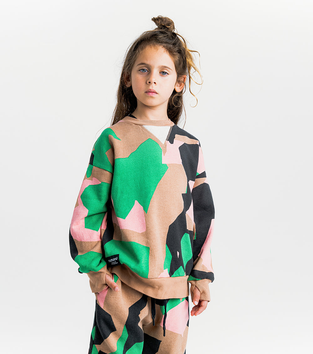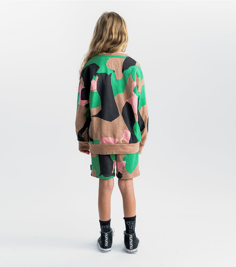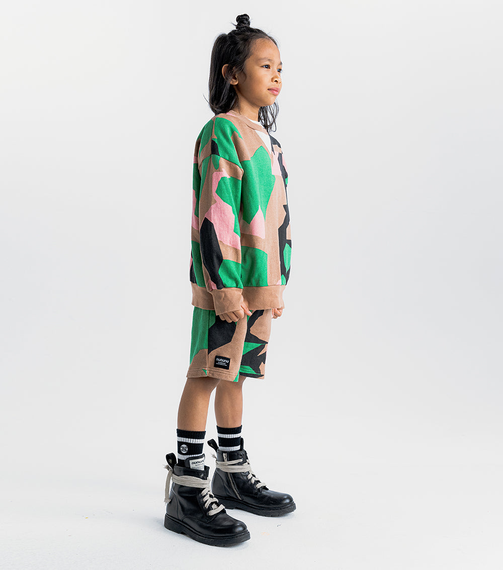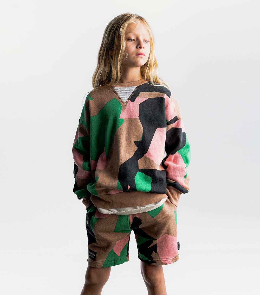 is it time to take over the earth yet or just play all over it? your kid will be ready for either in this super cozy french terry set, a classic nununu unisex cut complete with our cool kid thumbholes. this design has got all the earthy colors with bold pink & sleek black mixed in for our creative take on camo. since standing out is kinda our whole thing, we’ve got a grey triangle neckline detail that does just that, making the piece look extra oversized & comfy. the shorts have got classic & clean hemlines, hidden side pockets, and a black drawstring that keeps them up. ideal for when the kid wearing this set is running wild & free on early summer days or late summer nights.