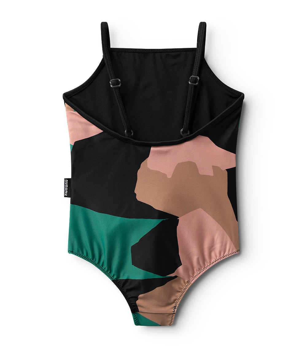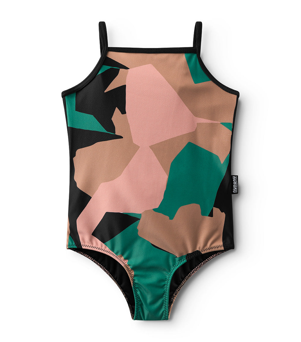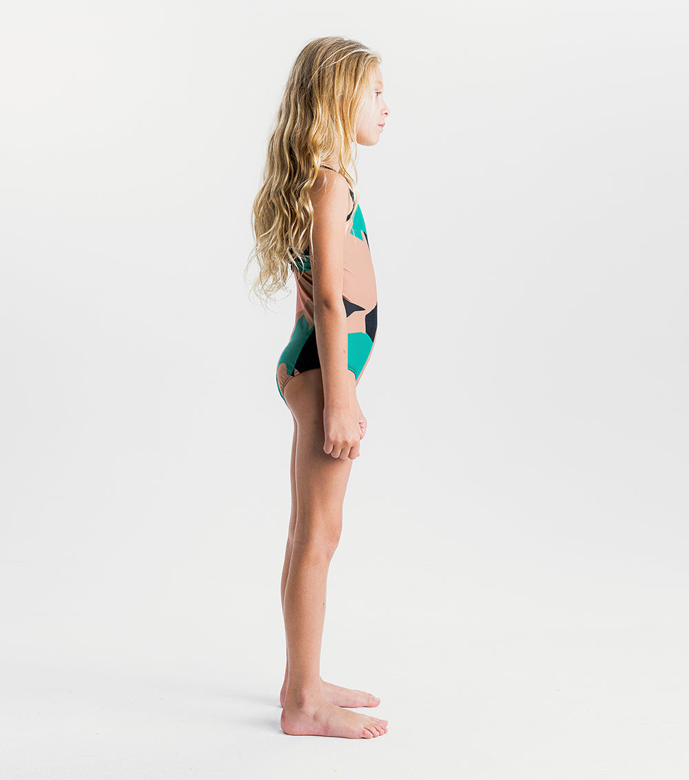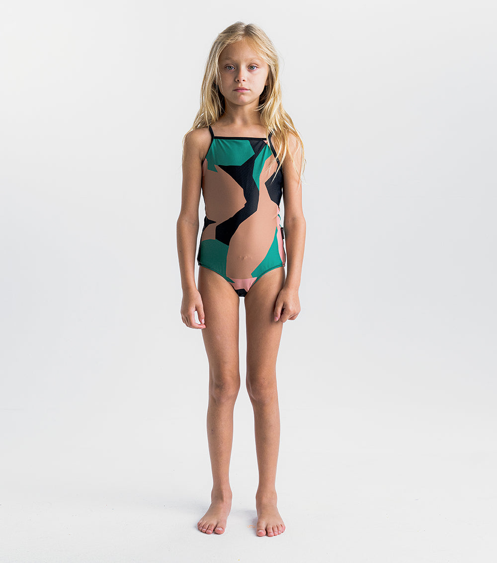 hey there mother nature, we borrowed your fave swimsuit & decided to make some alterations. now it’s a sleek one piece for kids who want to run, splash, and dive all summer long. that’s why we made a boxy neckline with adjustable black spaghetti straps that stay put & elastic where the legs come out for some good stretch. the print is made with iconic earth inspired colors that all come together to make our unique take on camo. trust us, this one will be their go-to all summer long.