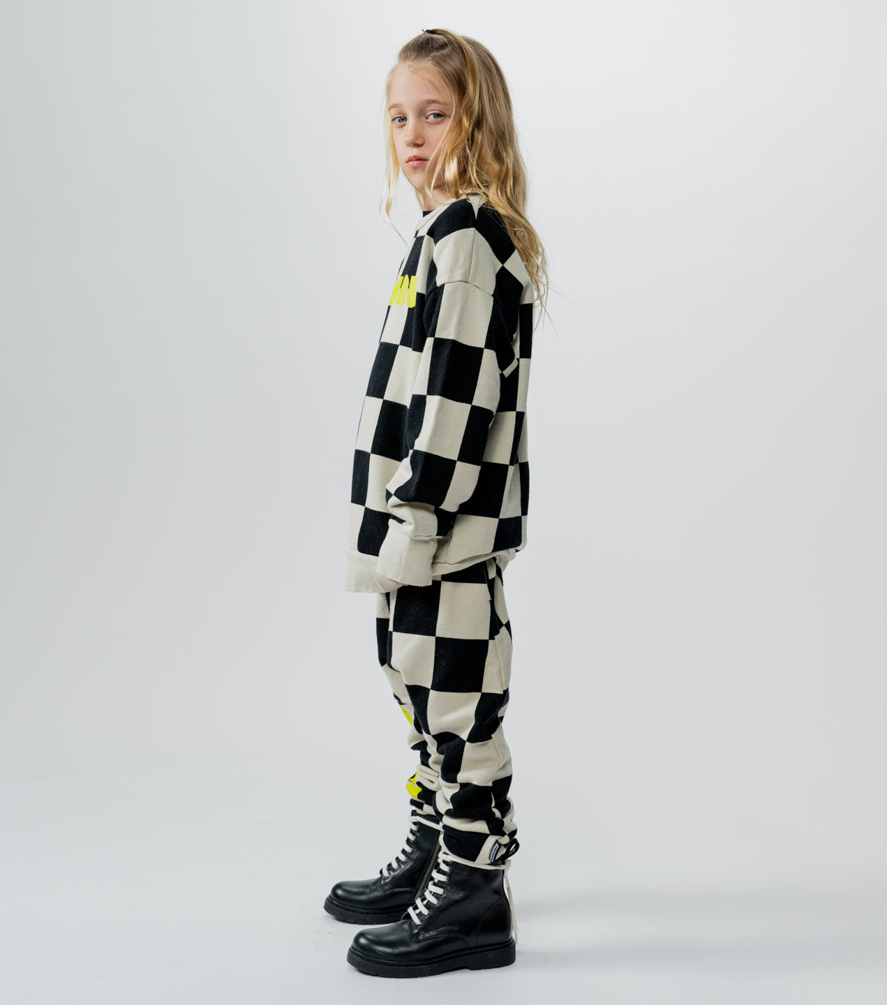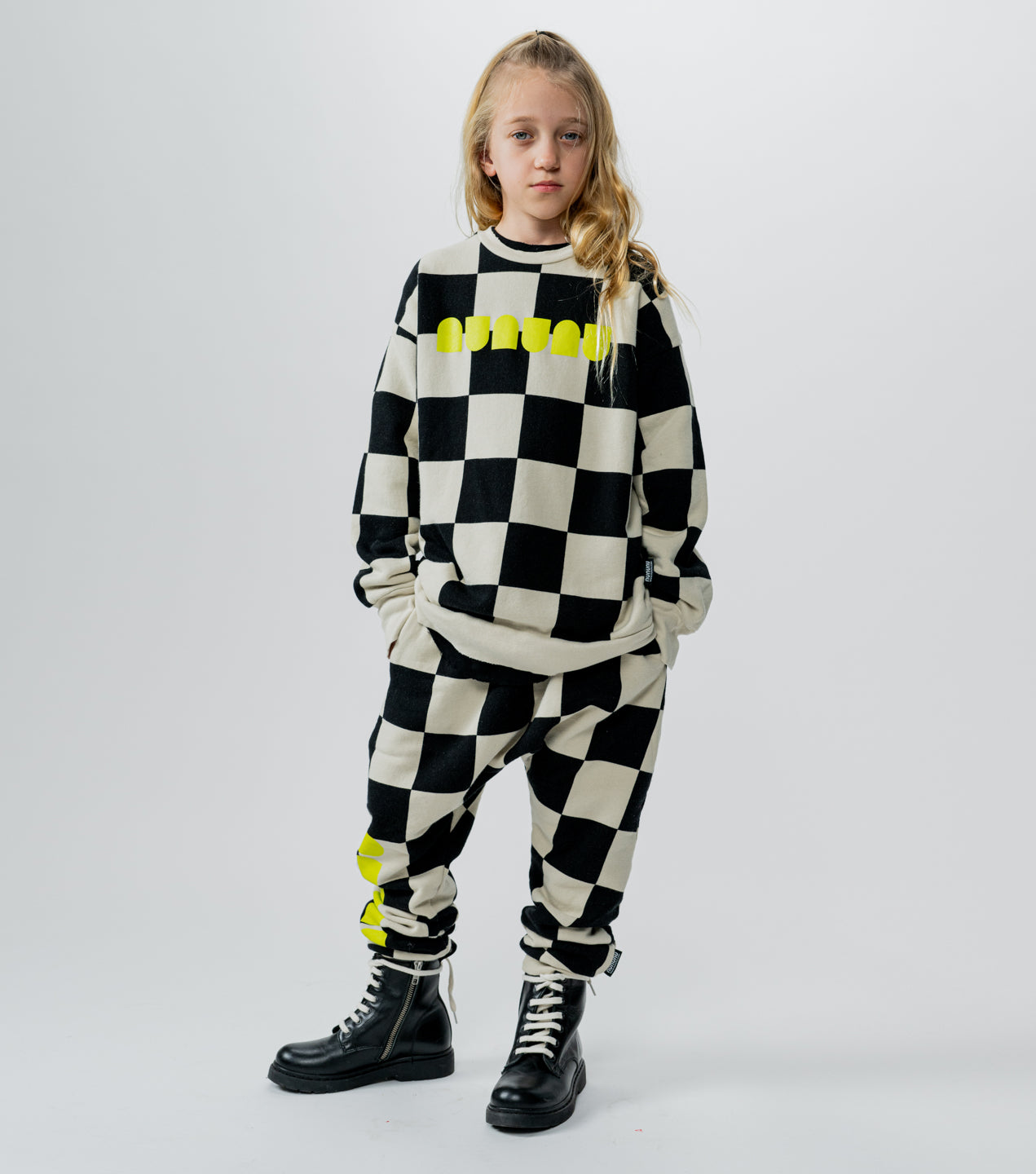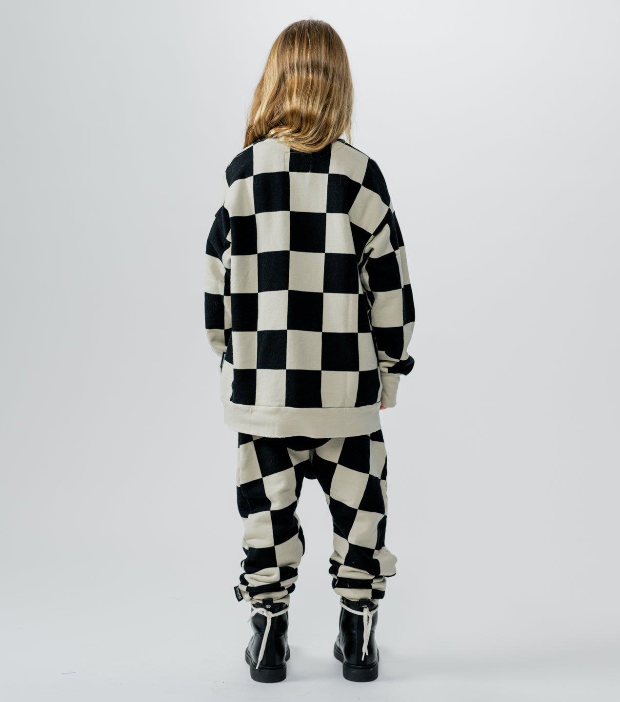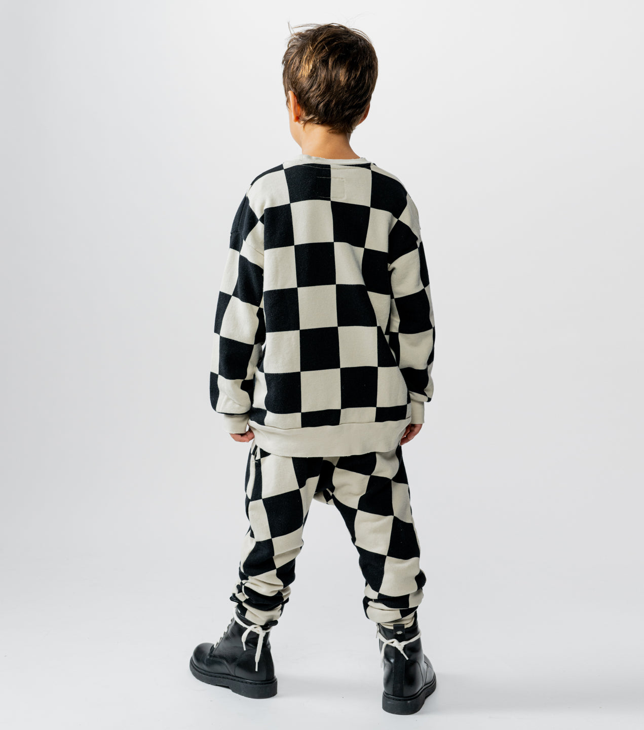 meet the sweatshirt that is as soft as the kid wearing it looks hard. this gender-neutral piece is made of a smokey natural french terry in a crew neck cut complete with cool kid thumbholes, edgy deconstruction, and the label riding on the front. the print is an homage to a chess board because your kid is always getting that checkmate. of course, the bold nununu logo on the chest stands out, just like your kid in a crowd.
