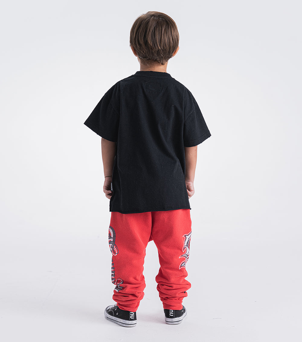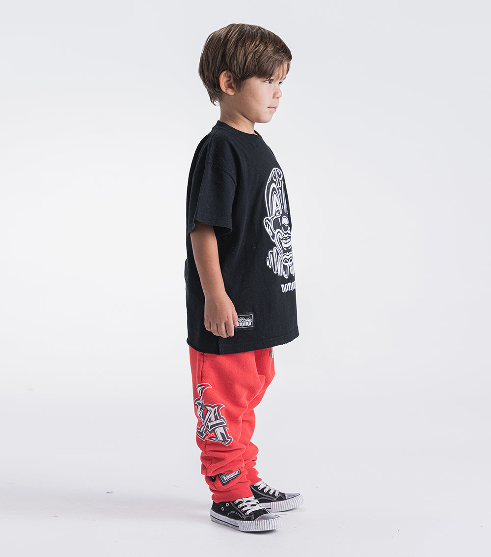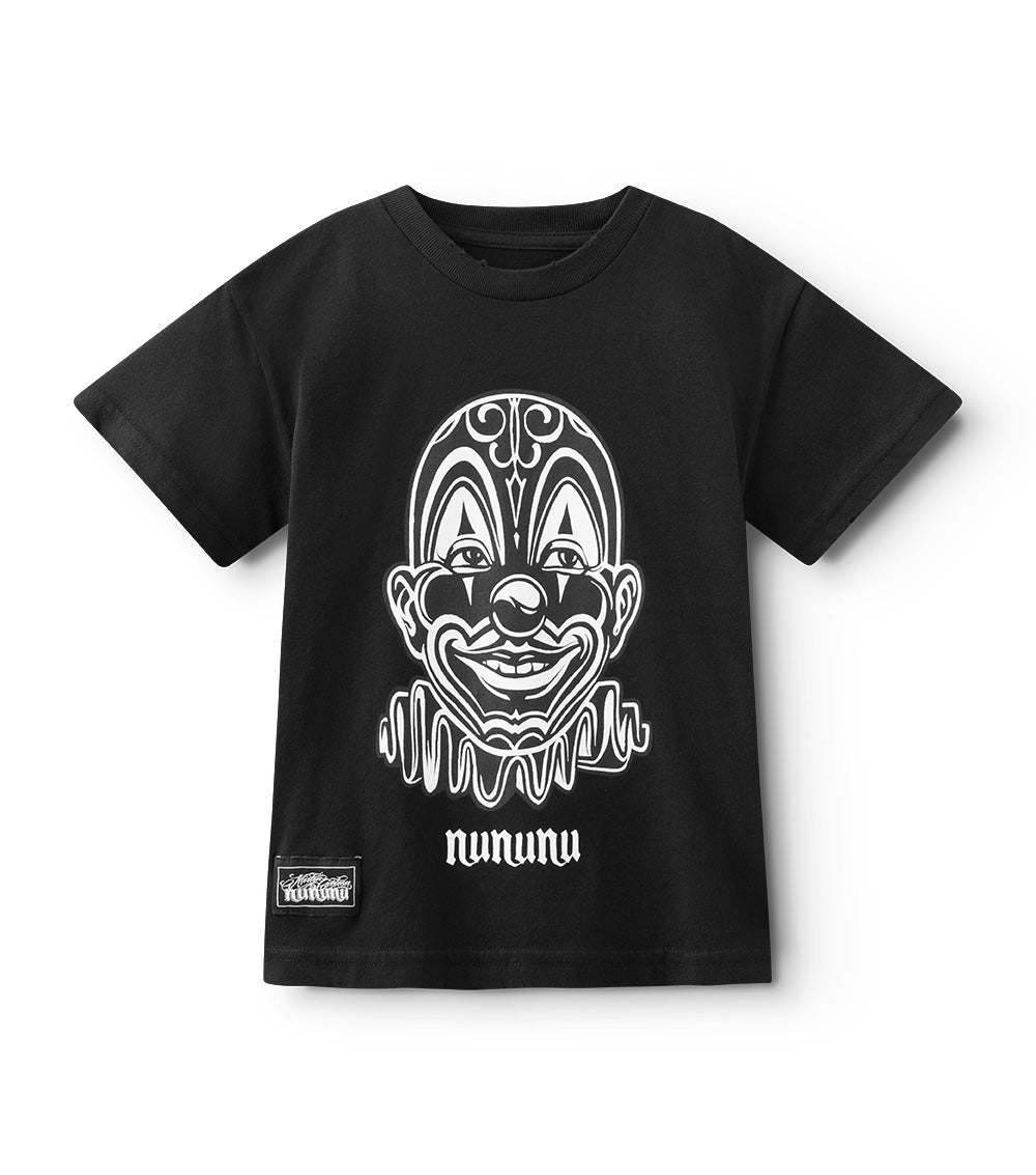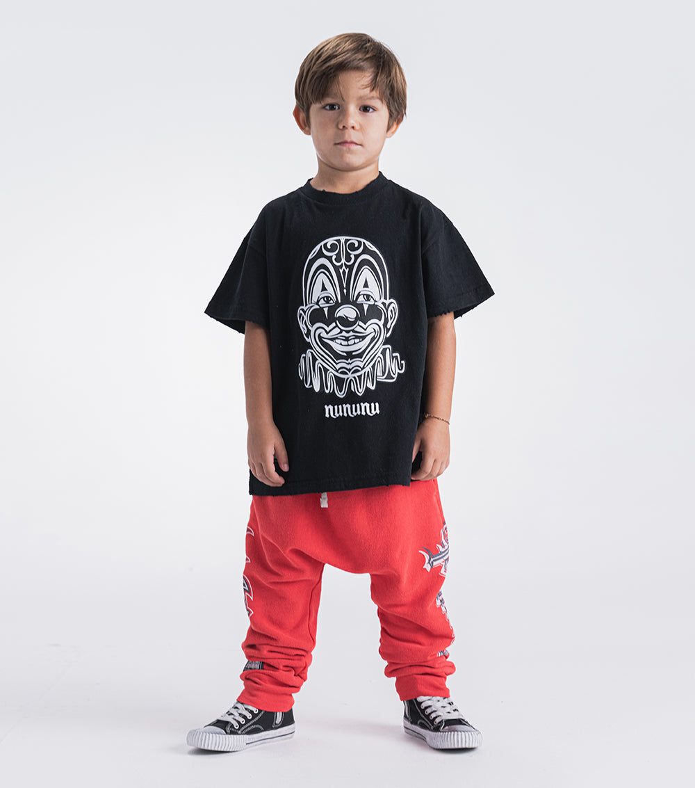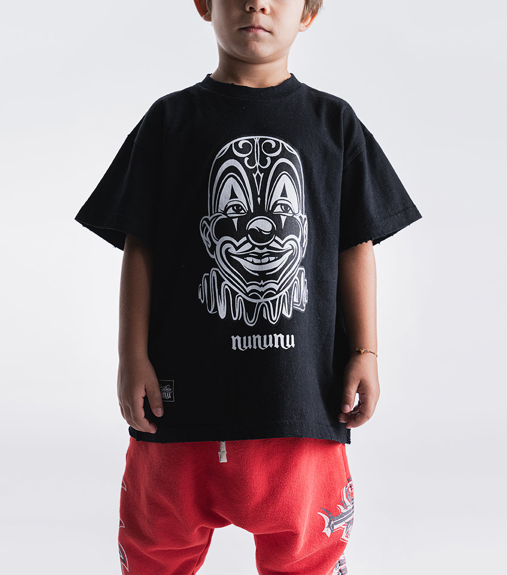 in this shirt your kid will be kinda cute, kinda not. just how we like them. it's a basic unisex t made of heavy single cotton so the weight is always right. this piece was made in collab with super famous tattoo artist, mister cartoon. so it’s got this expressive clown on the front – a mister cartoon classic signature symbolizing the good times, the bad times…bold & unapologetic, just like your kid. always joking and putting on a face sometimes like a mask. plus it has the nununu x mister cartoon label outside right next to the deconstruction near the bottom hemline. but get this, there's no hem in back. oh yeah, and peep the sides for inside out seams. because we do things our way.