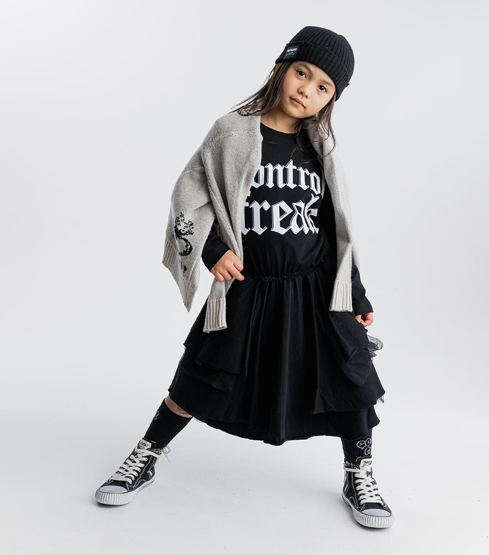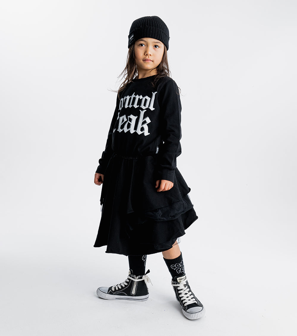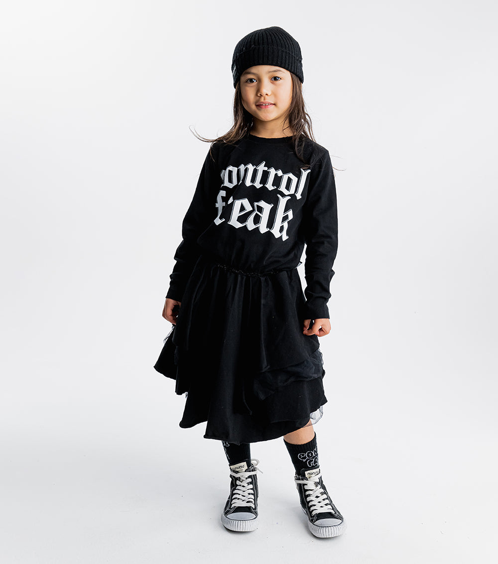 what’s totally punk but also has princess vibes? this. it’s got control freak inked across the chest in big, chunky tat inspired letters. because the kid wearing this dress is definitely making the rules. the top is single cotton for breathable comfort while the bottom is layered tulle for twirling all day long. of course, the skirt’s also got an inner lining so it stays oh so soft on the skin. oh yeah, and we added a super cute black sequin waistband so everyone knows the kid wearing this dress is just as sweet as they are scary.