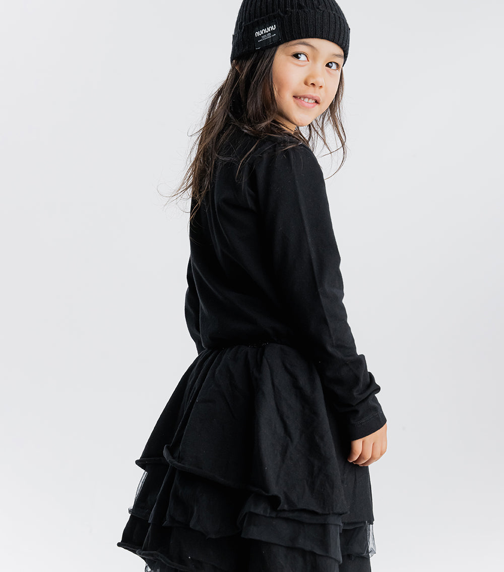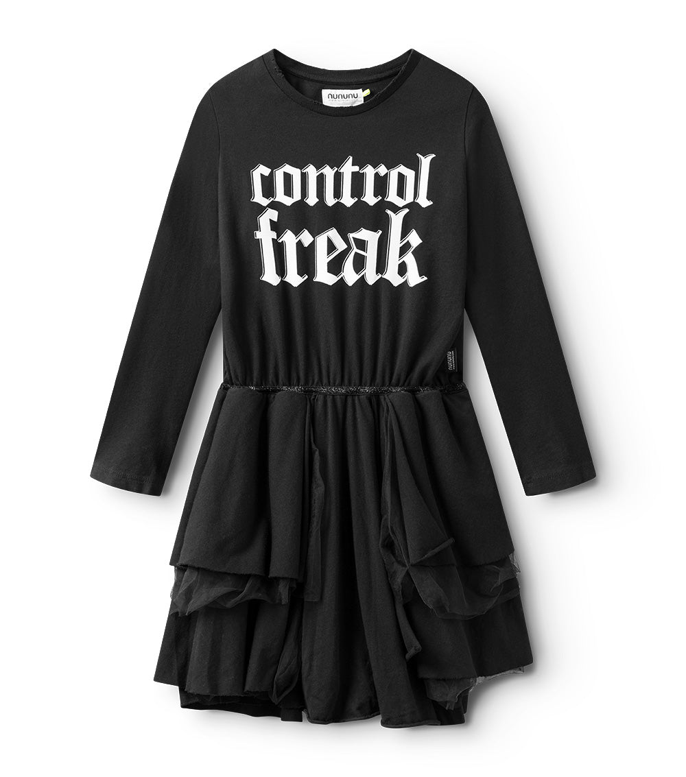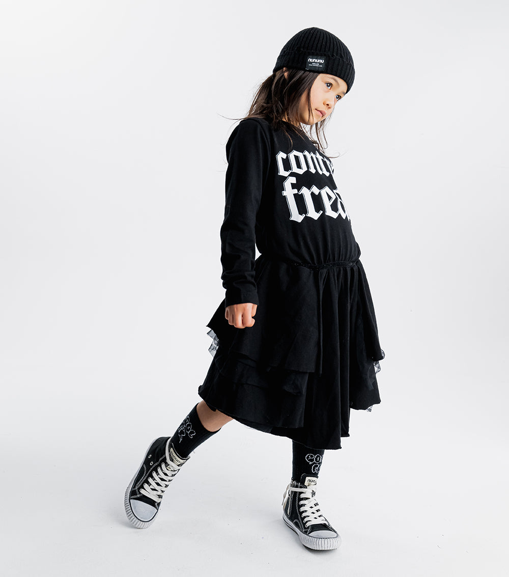 what’s totally punk but also has princess vibes? this. it’s got control freak inked across the chest in big, chunky tat inspired letters. because the kid wearing this dress is definitely making the rules. the top is single cotton for breathable comfort while the bottom is layered tulle for twirling all day long. of course, the skirt’s also got an inner lining so it stays oh so soft on the skin. oh yeah, and we added a super cute black sequin waistband so everyone knows the kid wearing this dress is just as sweet as they are scary.