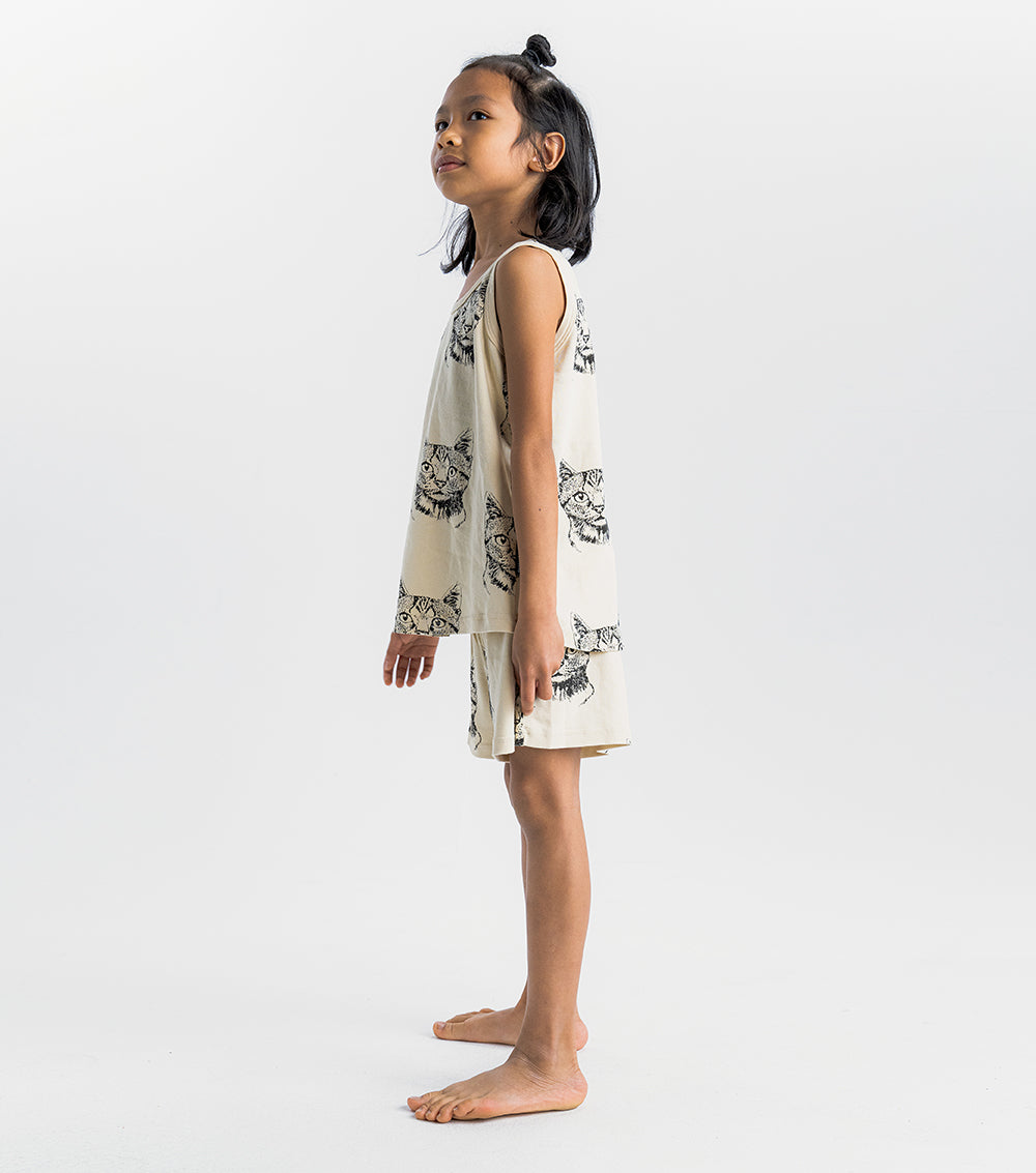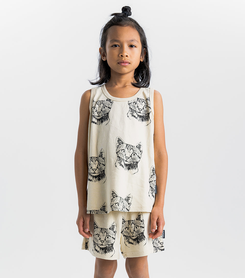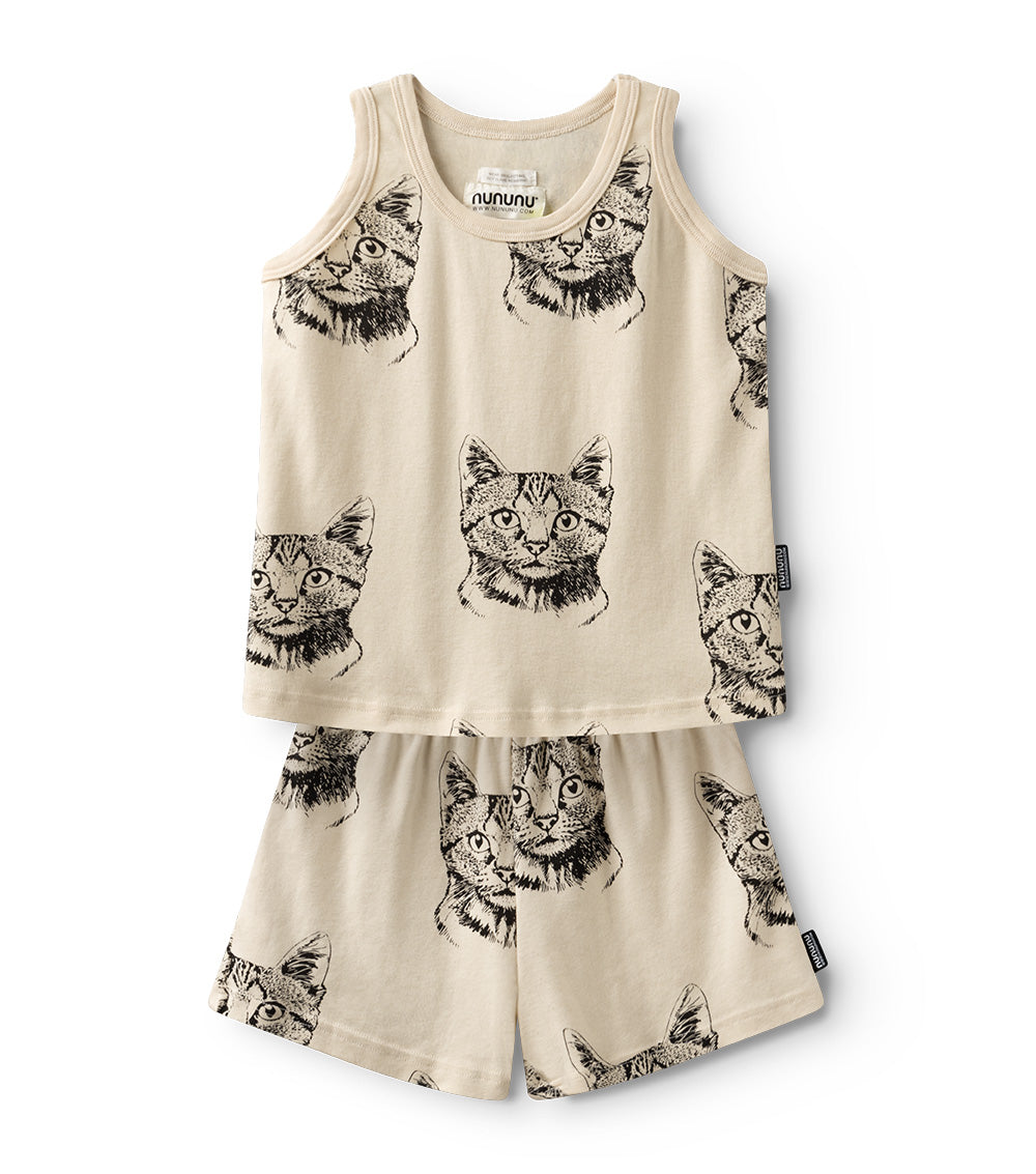 where are all the cool cats at? well it doesn't matter because we are bringing them hardcore in this natural-colored tank top & shorts loungewear set for boys & girls. it’s made of the softest ever fine rib so it’s literally so chill with a cool cat printed all over. but be careful, the kid wearing this set meows back.